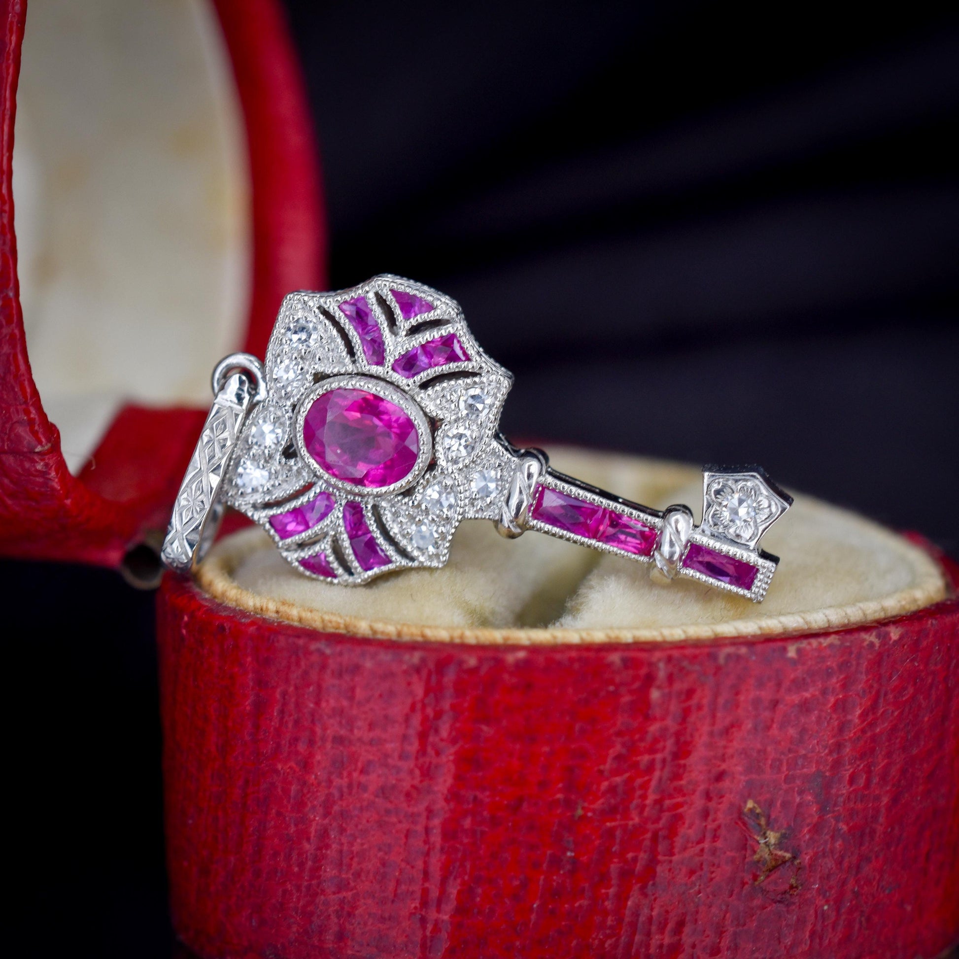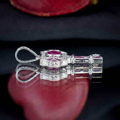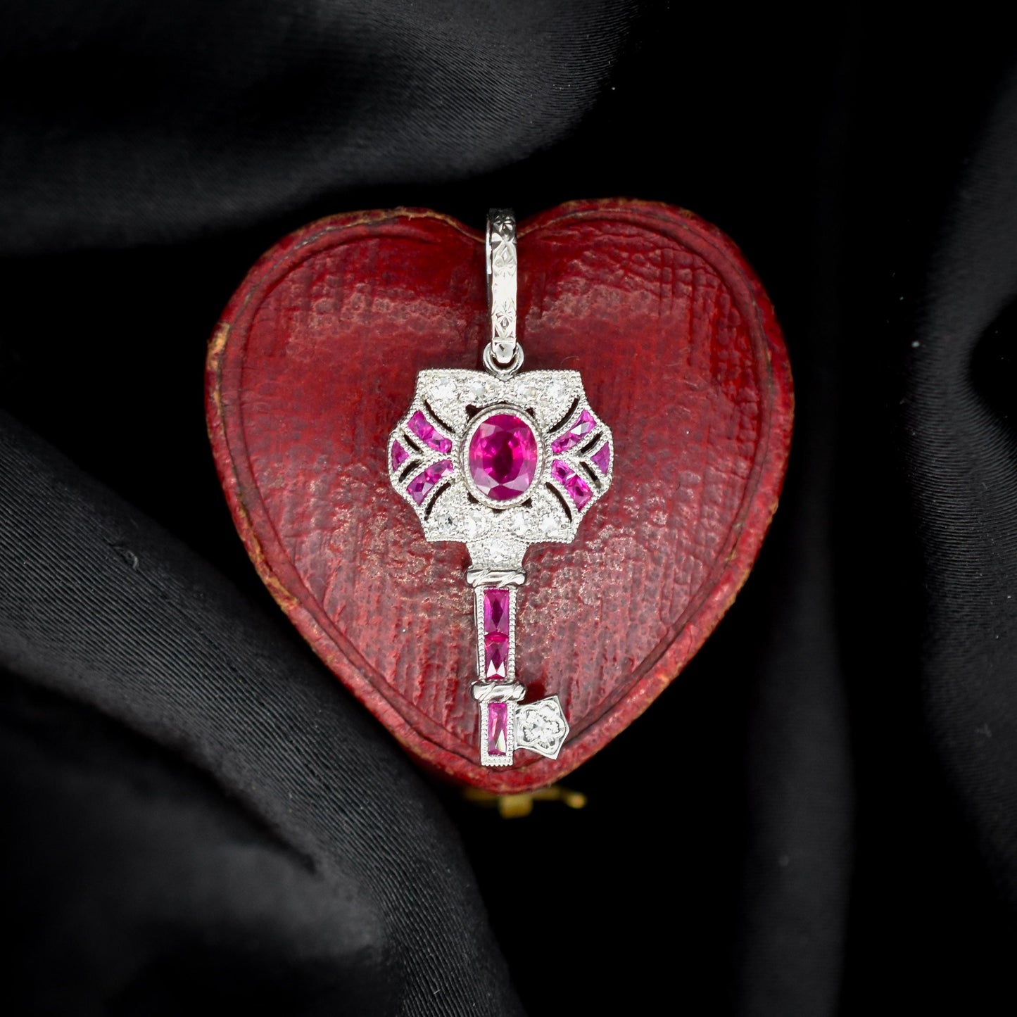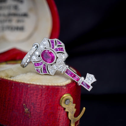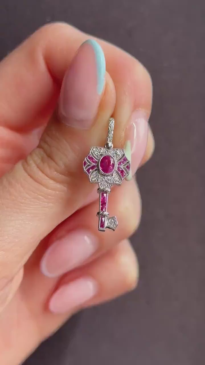This exquisite Art Deco-inspired key charm is a stunning piece of jewellery, masterfully crafted in lustrous platinum. The design features a captivating blend of Ruby and diamonds, with the Ruby radiating a rich, deep pink that evokes a sense of elegance and sophistication.