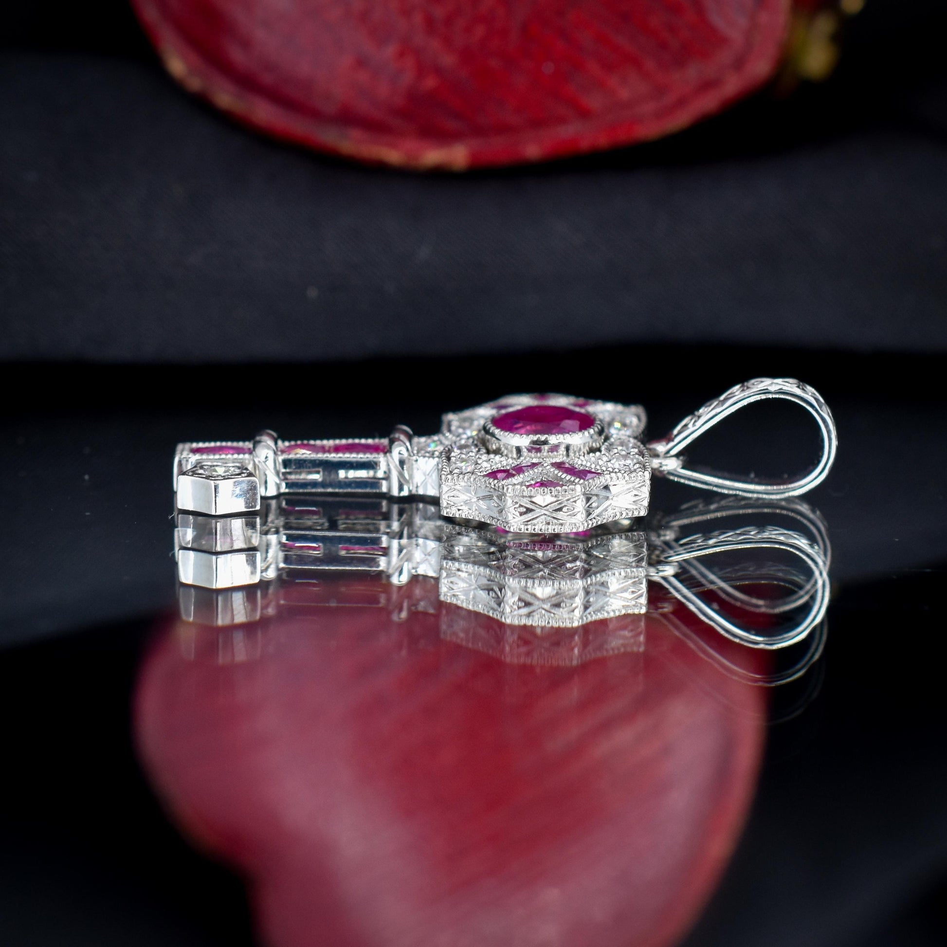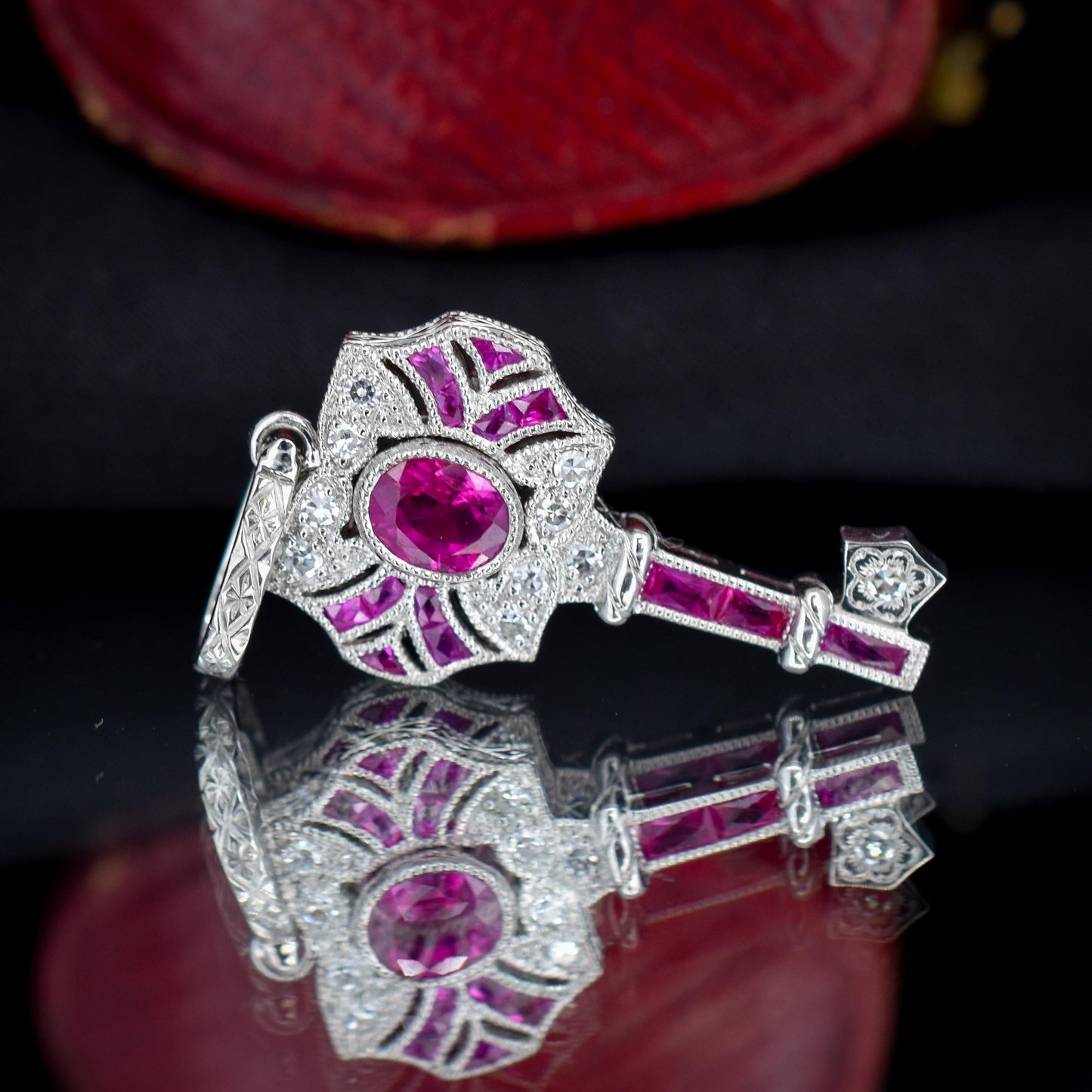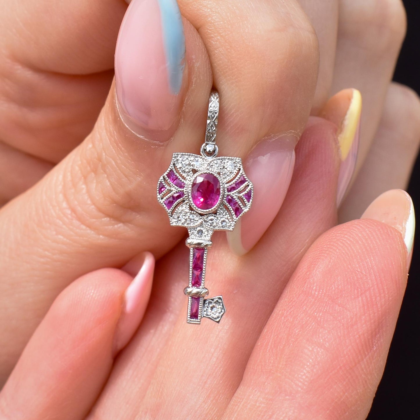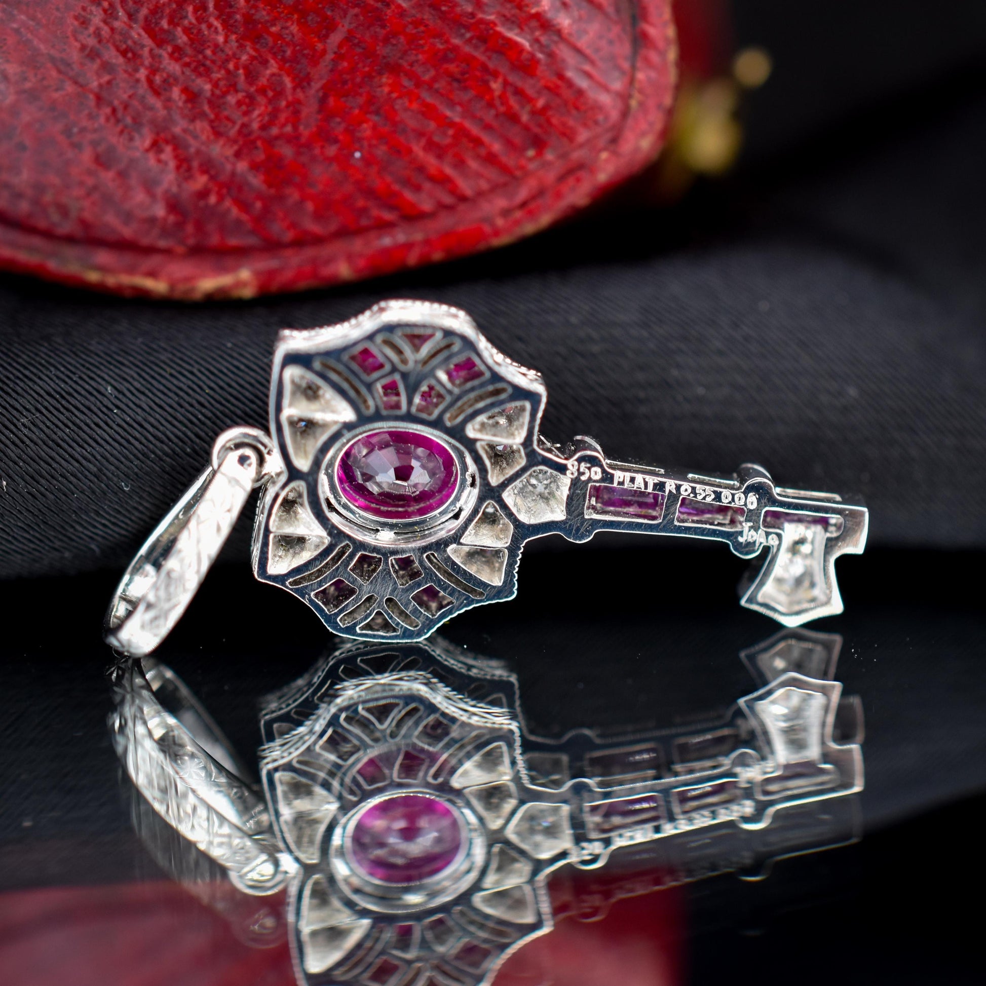 This exquisite Art Deco-inspired key charm is a stunning piece of jewellery, masterfully crafted in lustrous platinum. The design features a captivating blend of Ruby and diamonds, with the Ruby radiating a rich, deep pink that evokes a sense of elegance and sophistication.