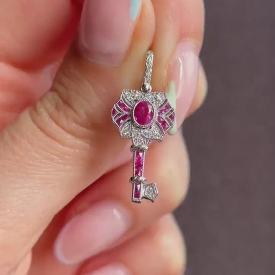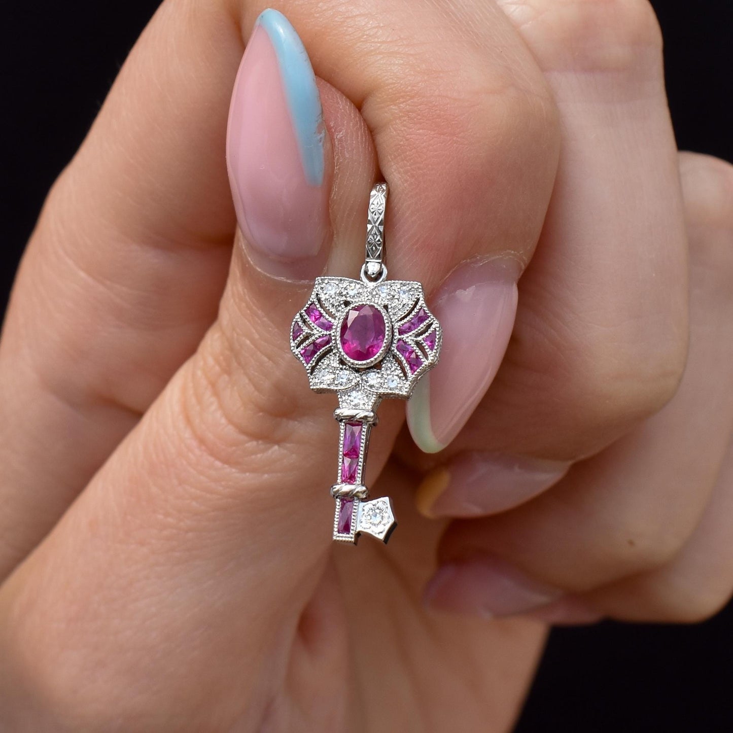 Art Deco Style Ruby and Diamond Platinum Key Pendant Charm