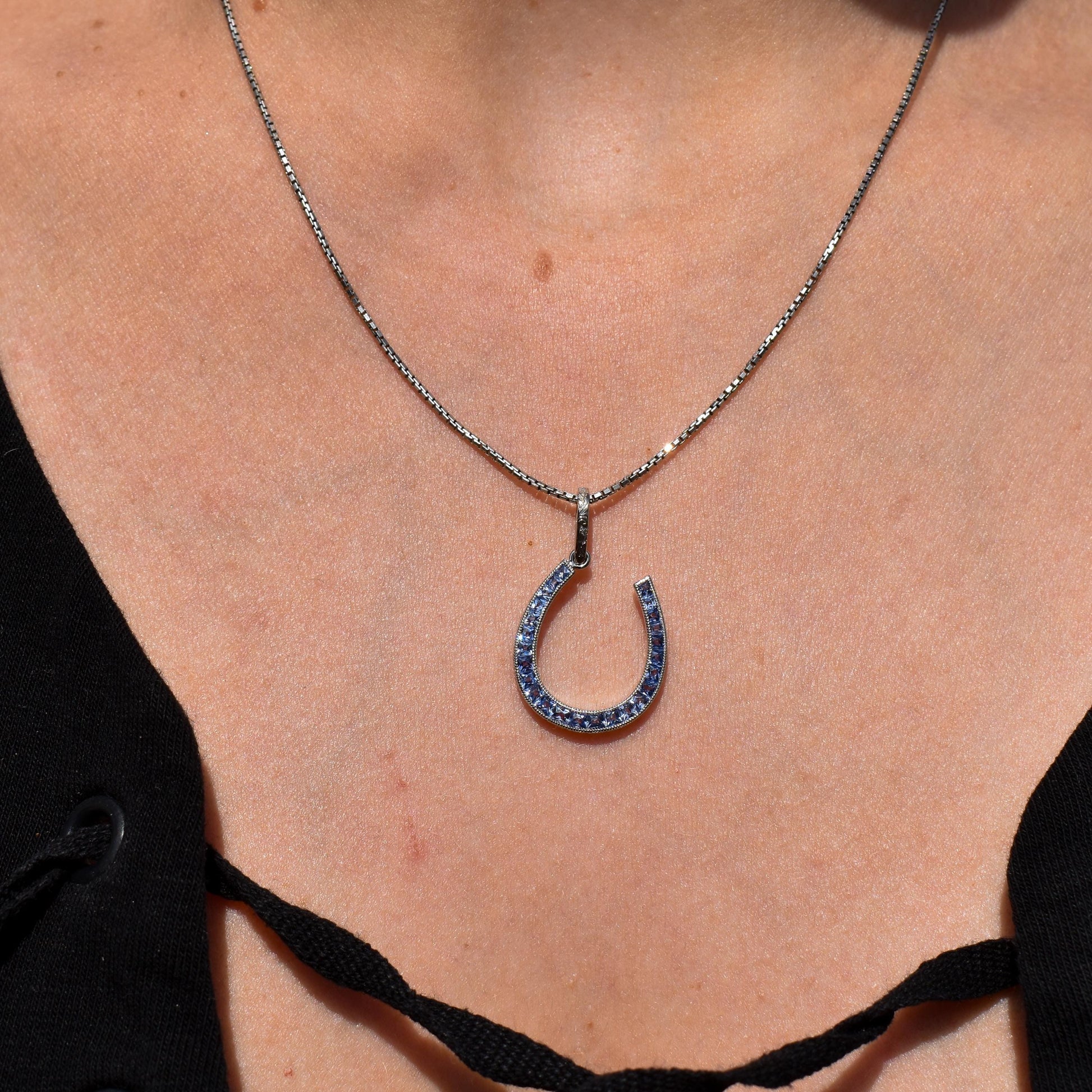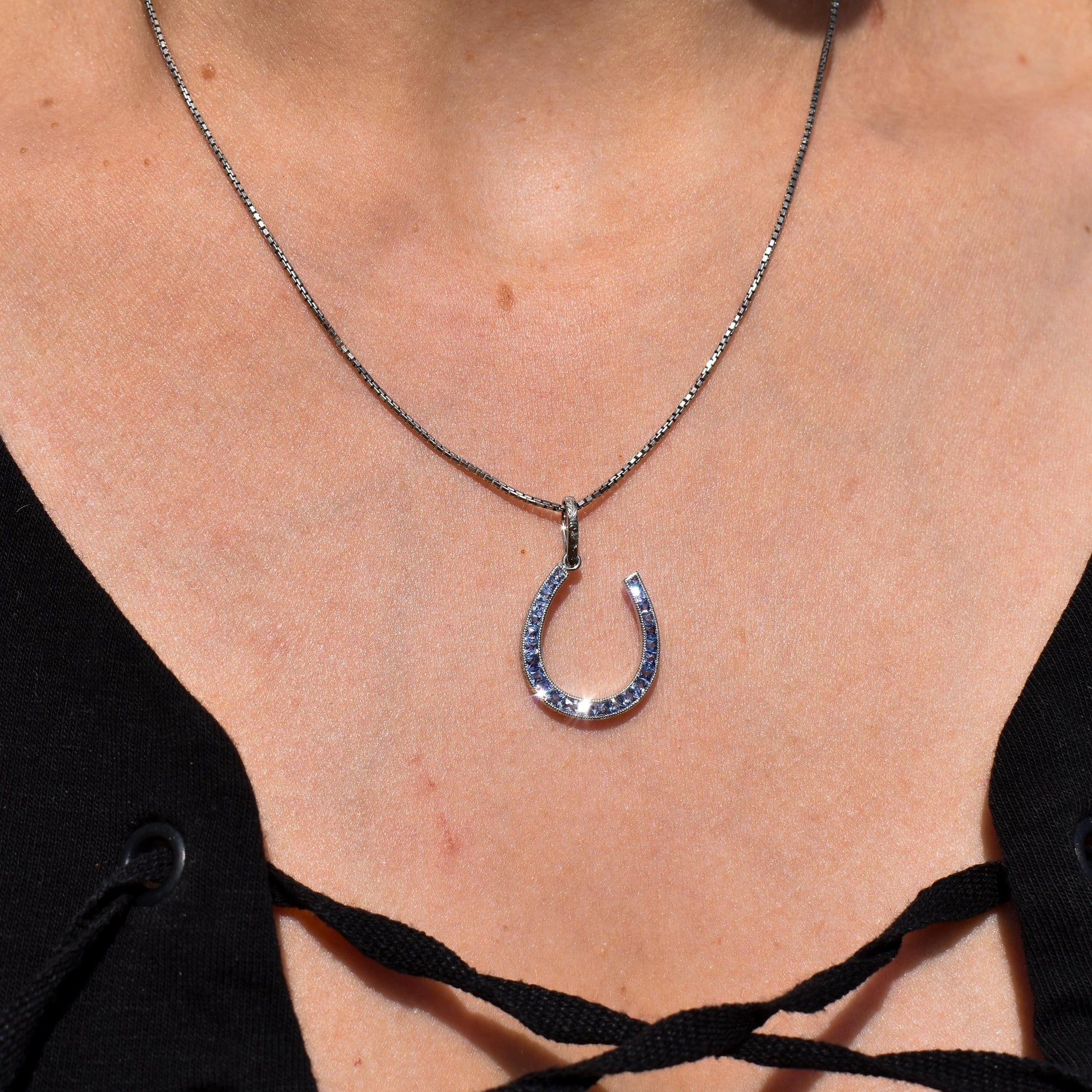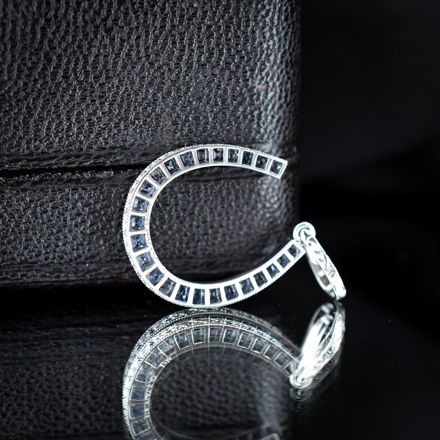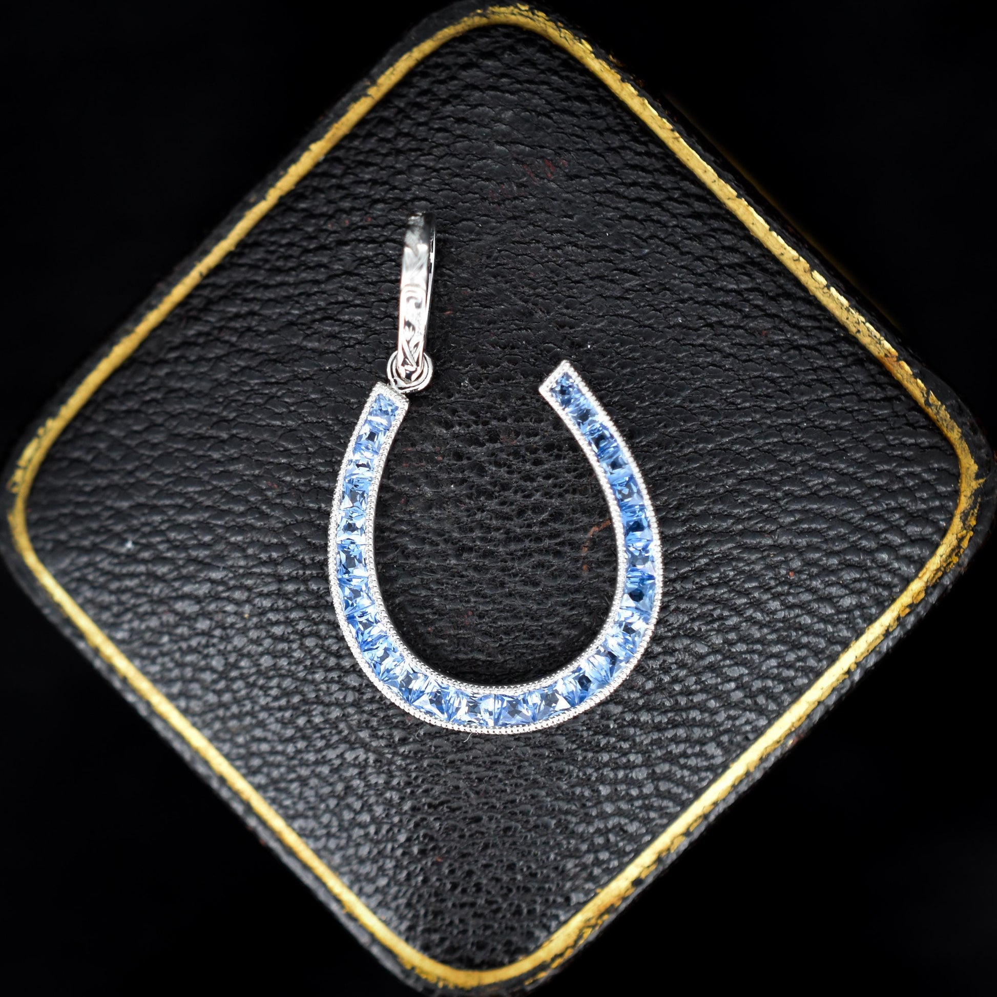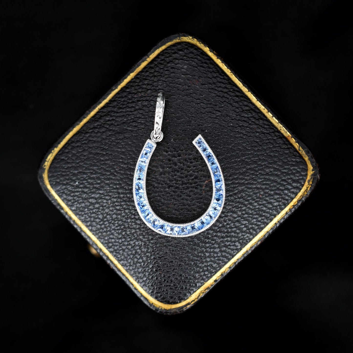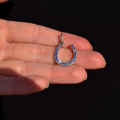 This exquisite Sapphire platinum charm has been meticulously handcrafted into a horseshoe featuring French-cut Ceylon sapphires that subtly graduate in size.