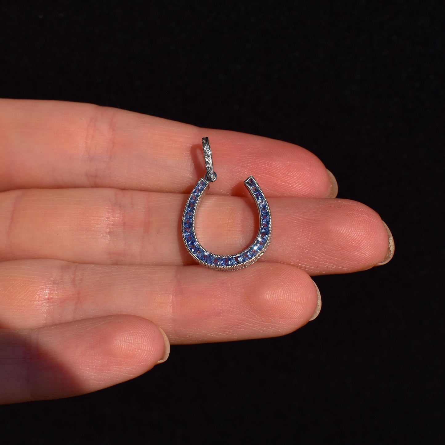 Designed in the Art Deco-inspired era, this stunning Sapphire horseshoe charm is in excellent condition. The stones are free from chips and secure within their settings. There is nothing to fault about this item!