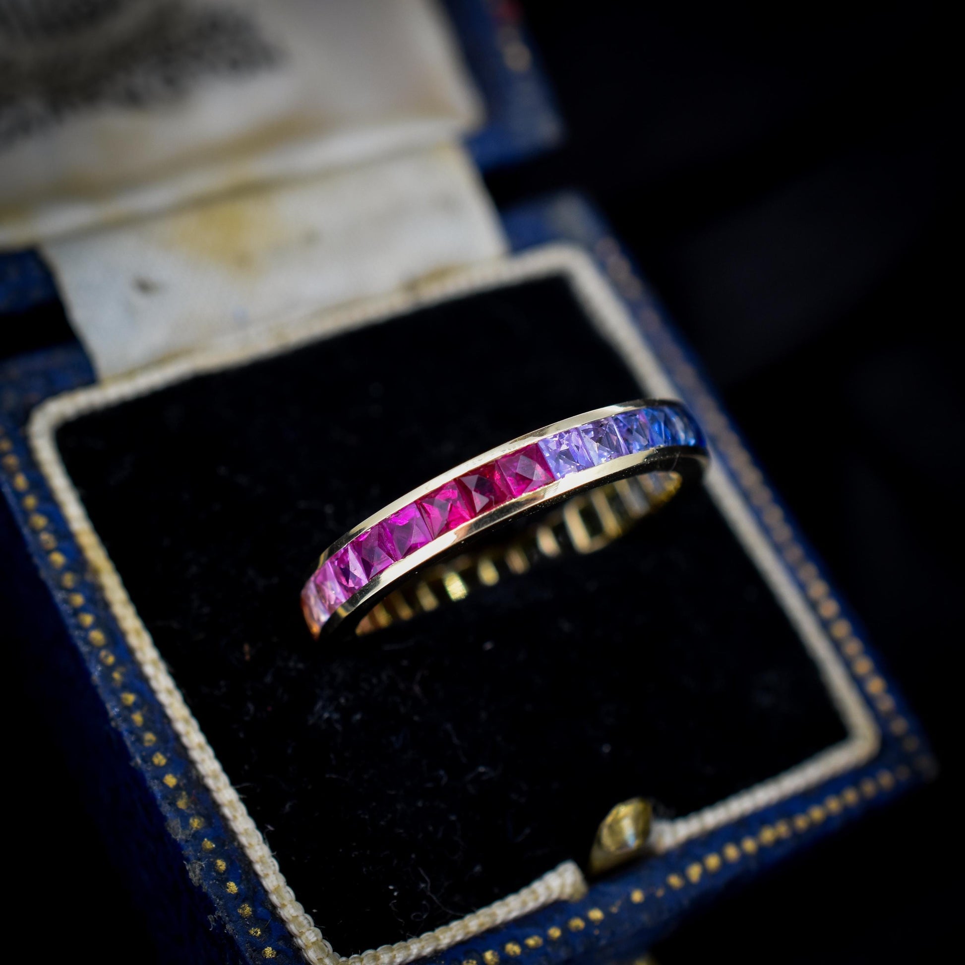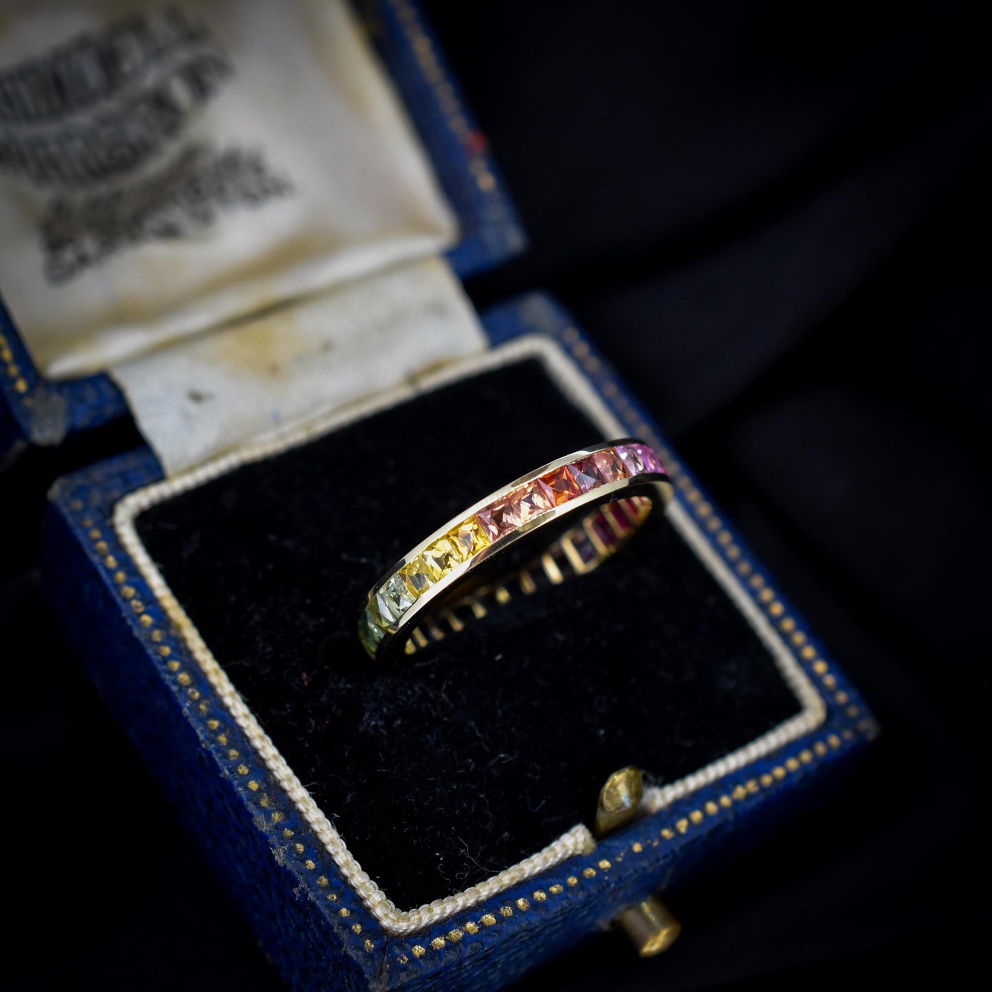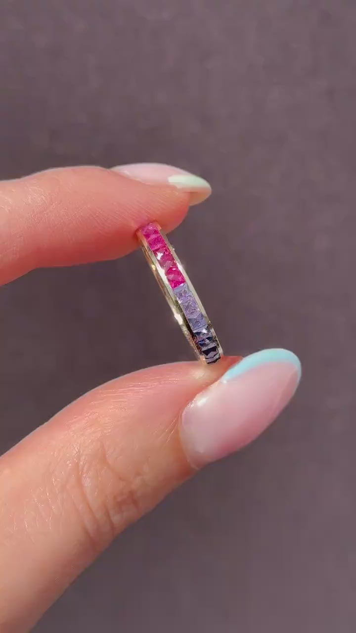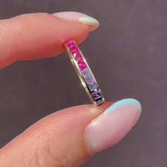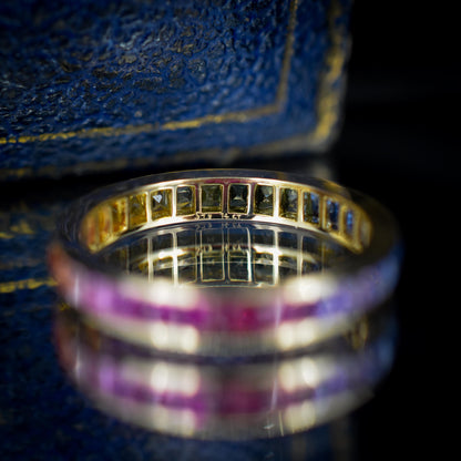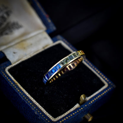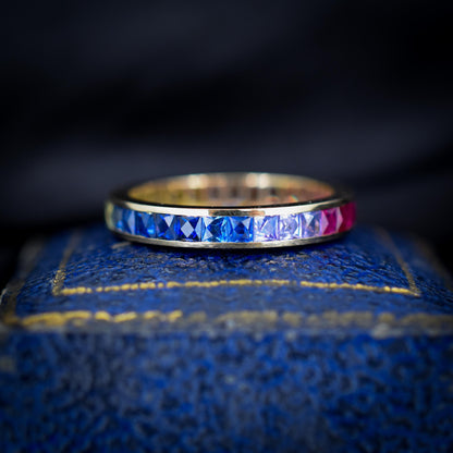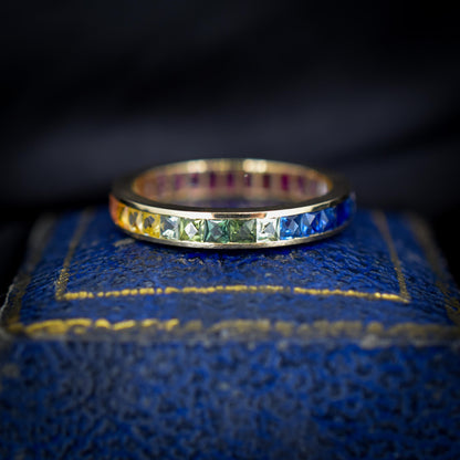 French Cut Multi Coloured Sapphire Rainbow Full Eternity 14ct Gold Band Ring