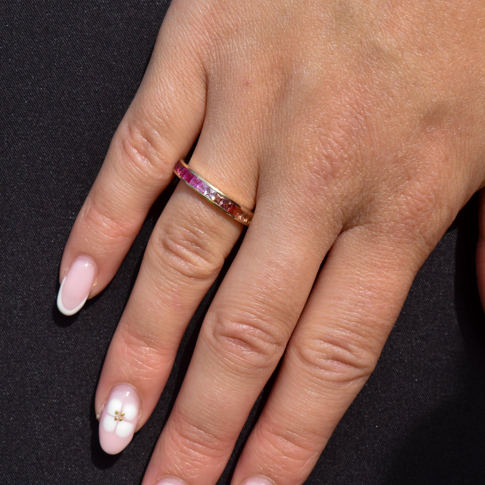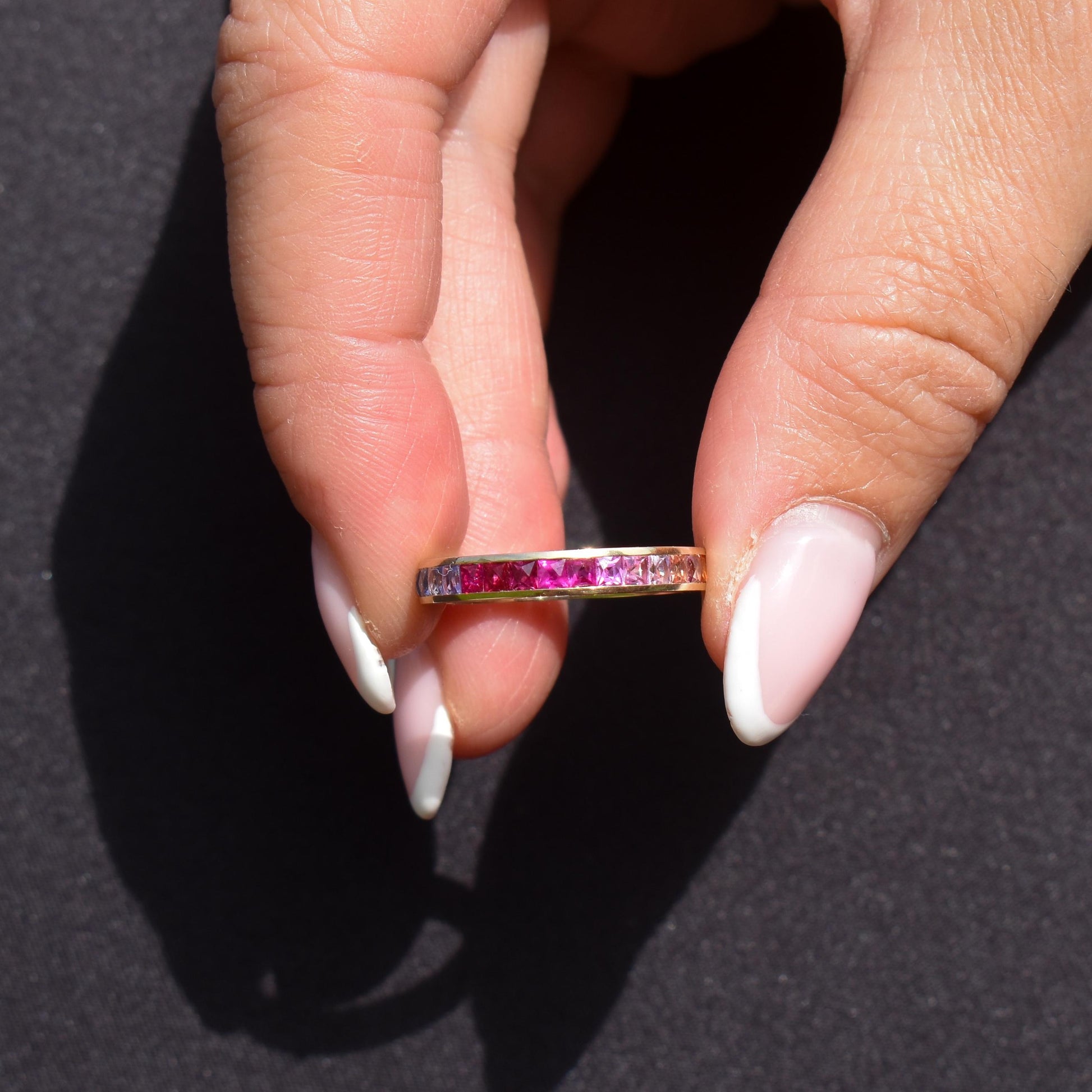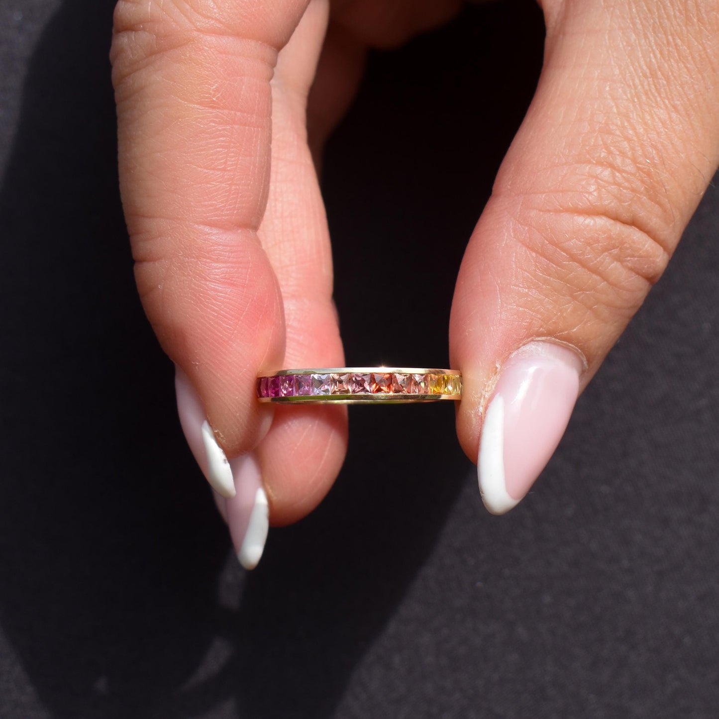 French Cut Multi Coloured Sapphire Rainbow Full Eternity 14ct Gold Band Ring