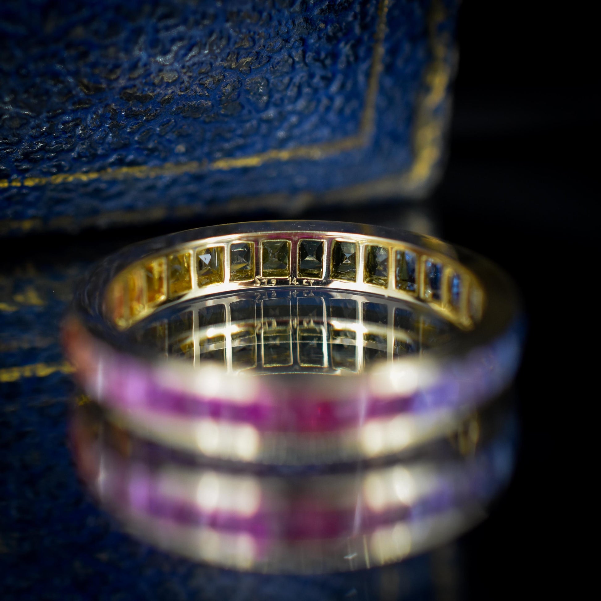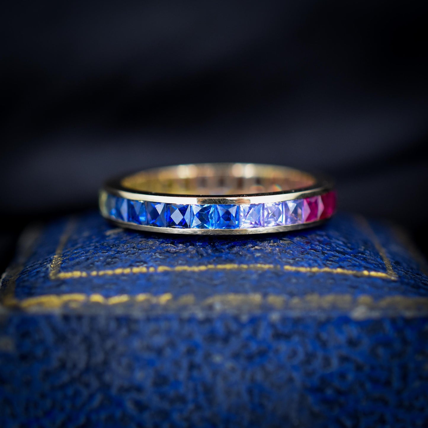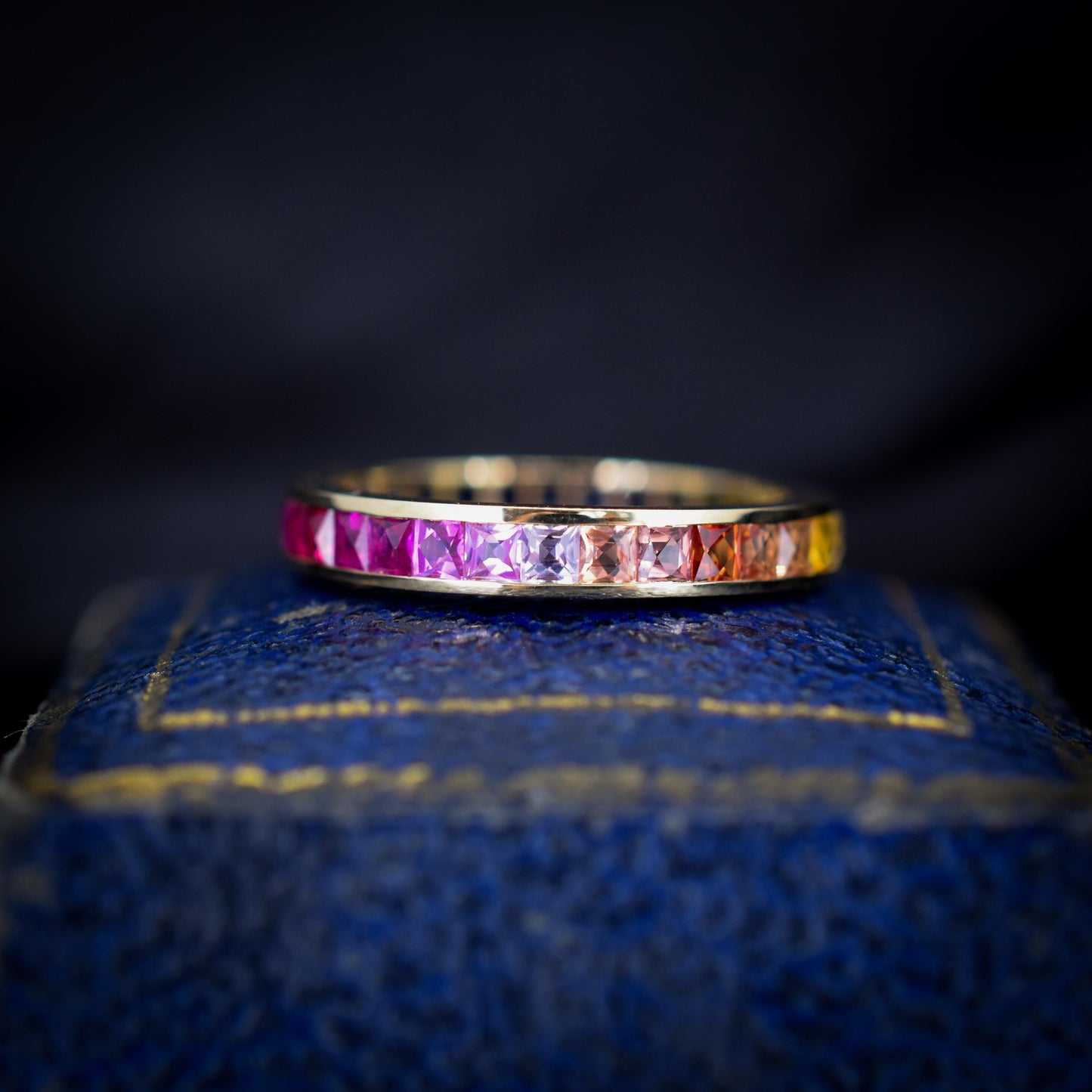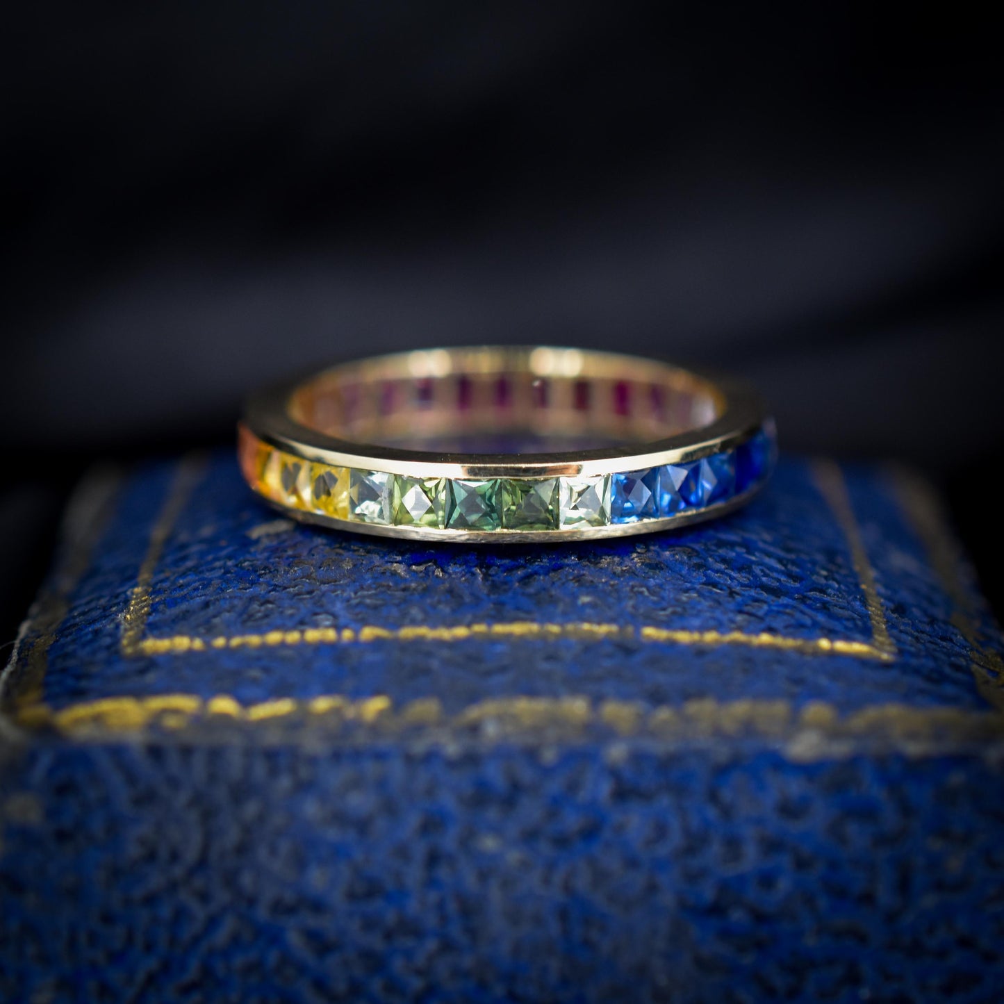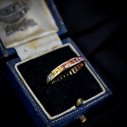 This breathtaking full eternity band features 1.9ct of French Cut Sapphires showcasing a rainbow effect, all set in 14ct yellow gold. With 30 multi-coloured natural Sapphires set with an open-back gallery, the band will surely add some splendour to your finger.
