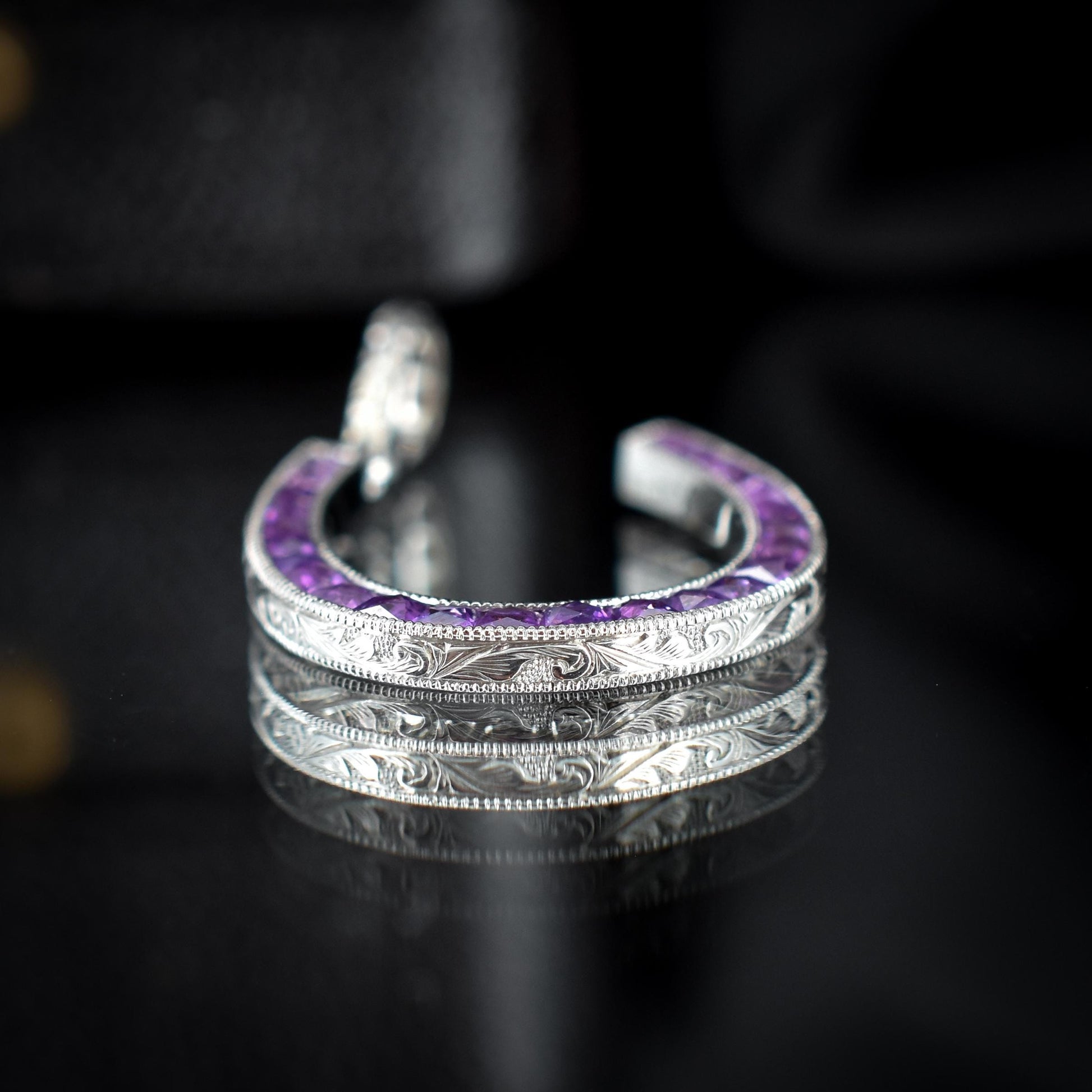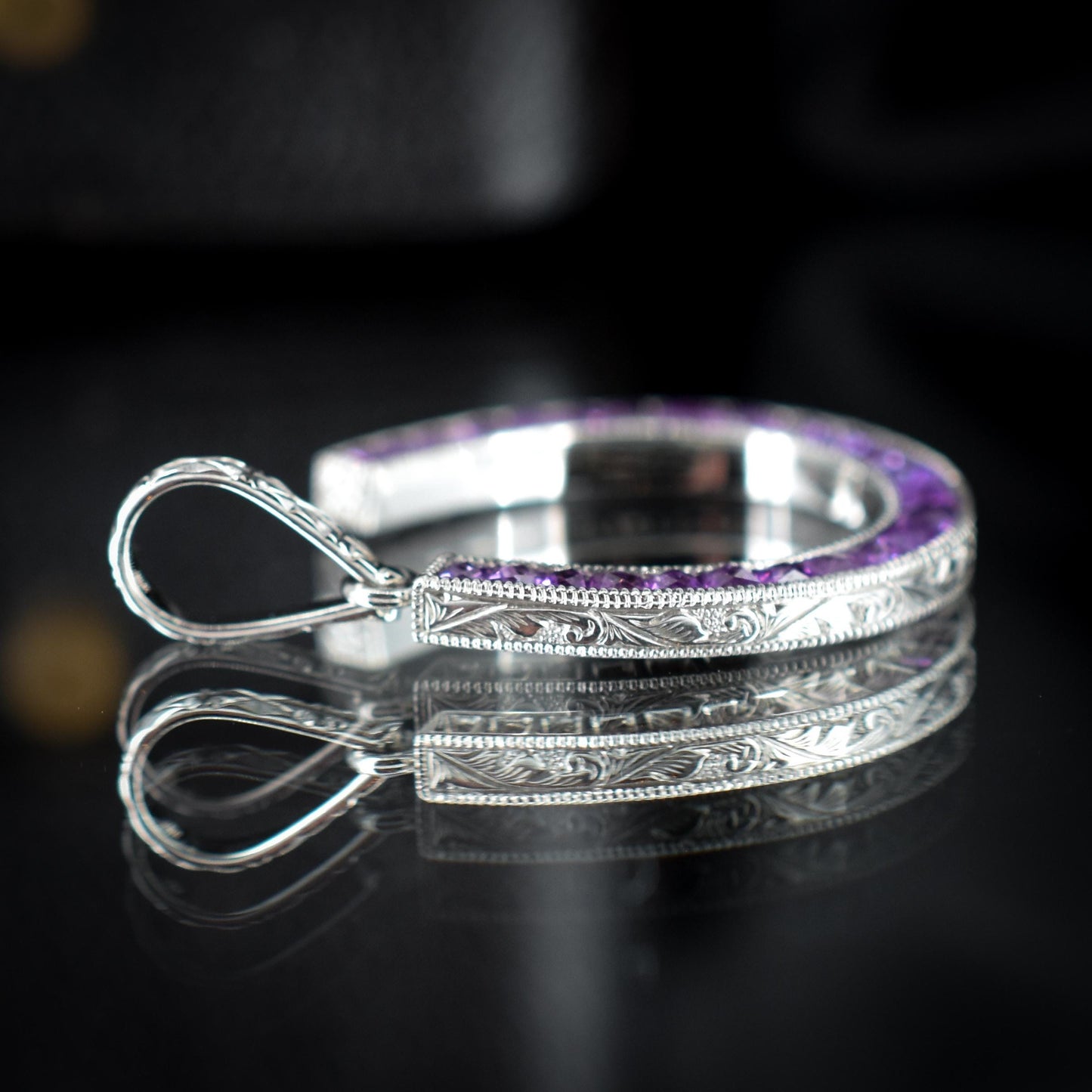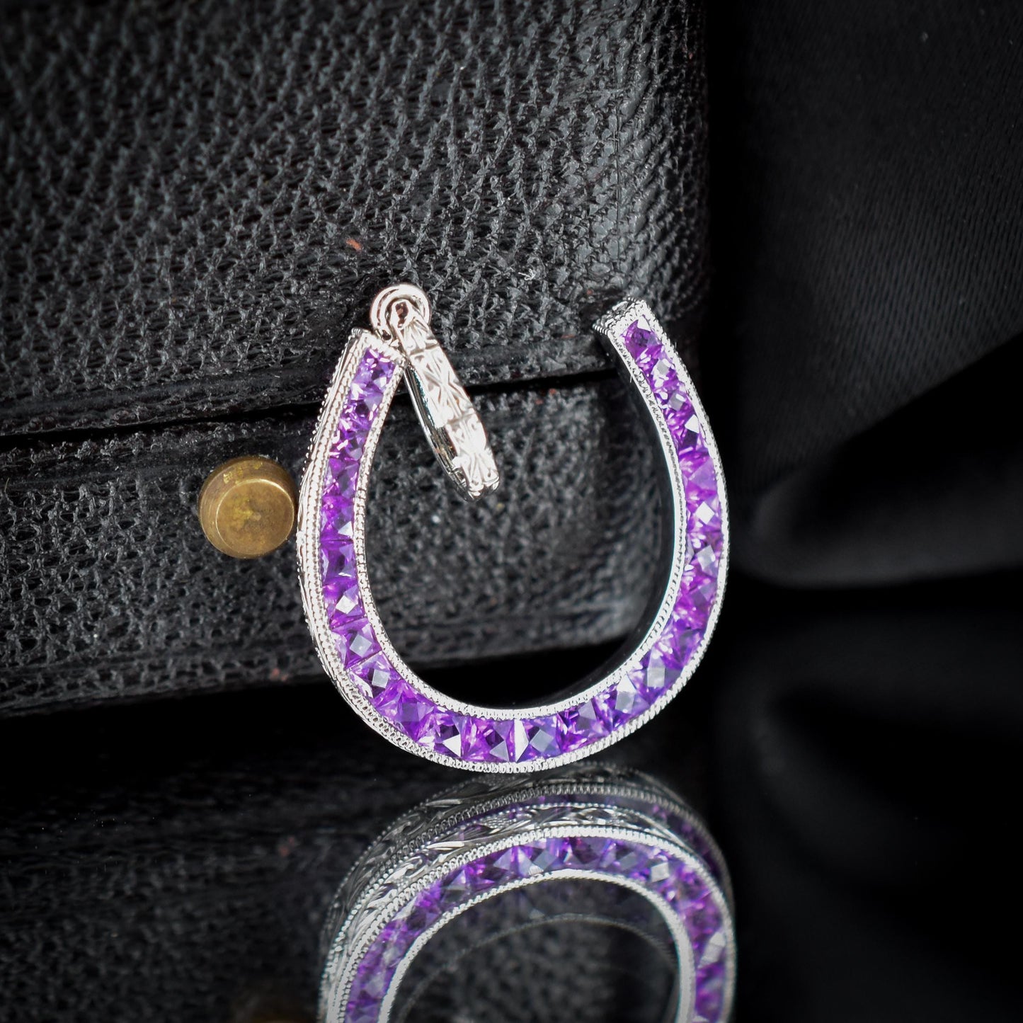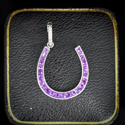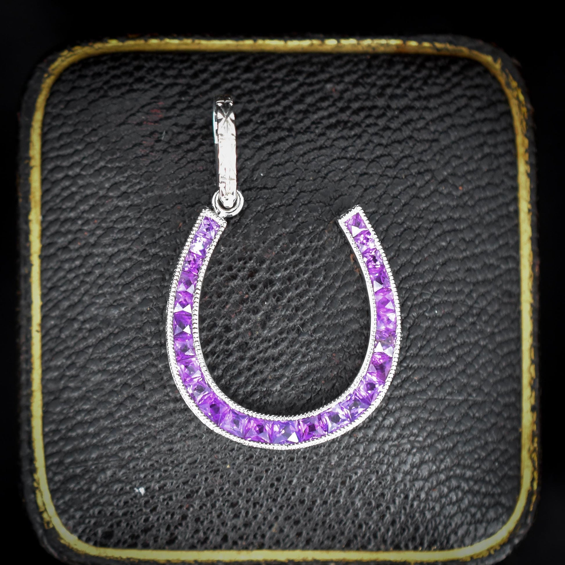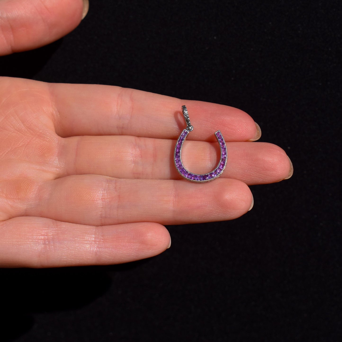 This exquisite Sapphire platinum charm has been meticulously handcrafted into a horseshoe featuring French-cut natural purple sapphires that subtly graduate in size.