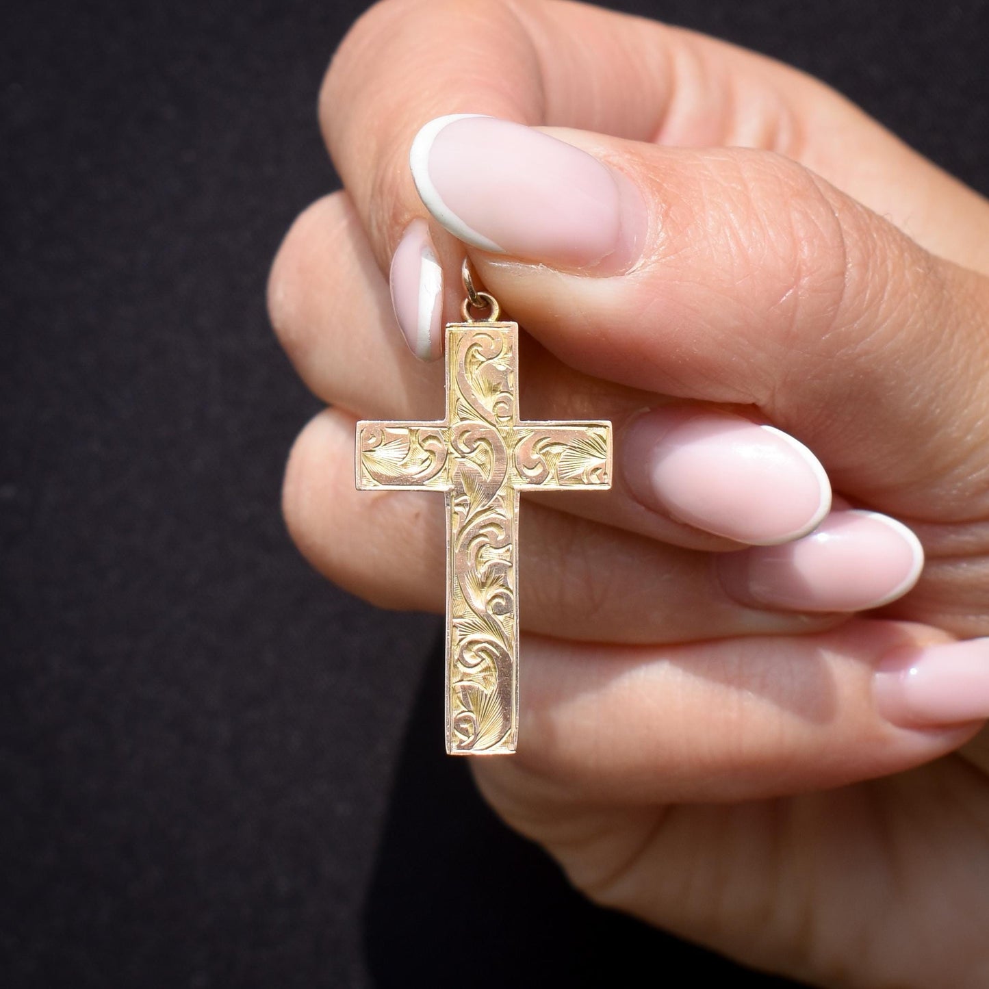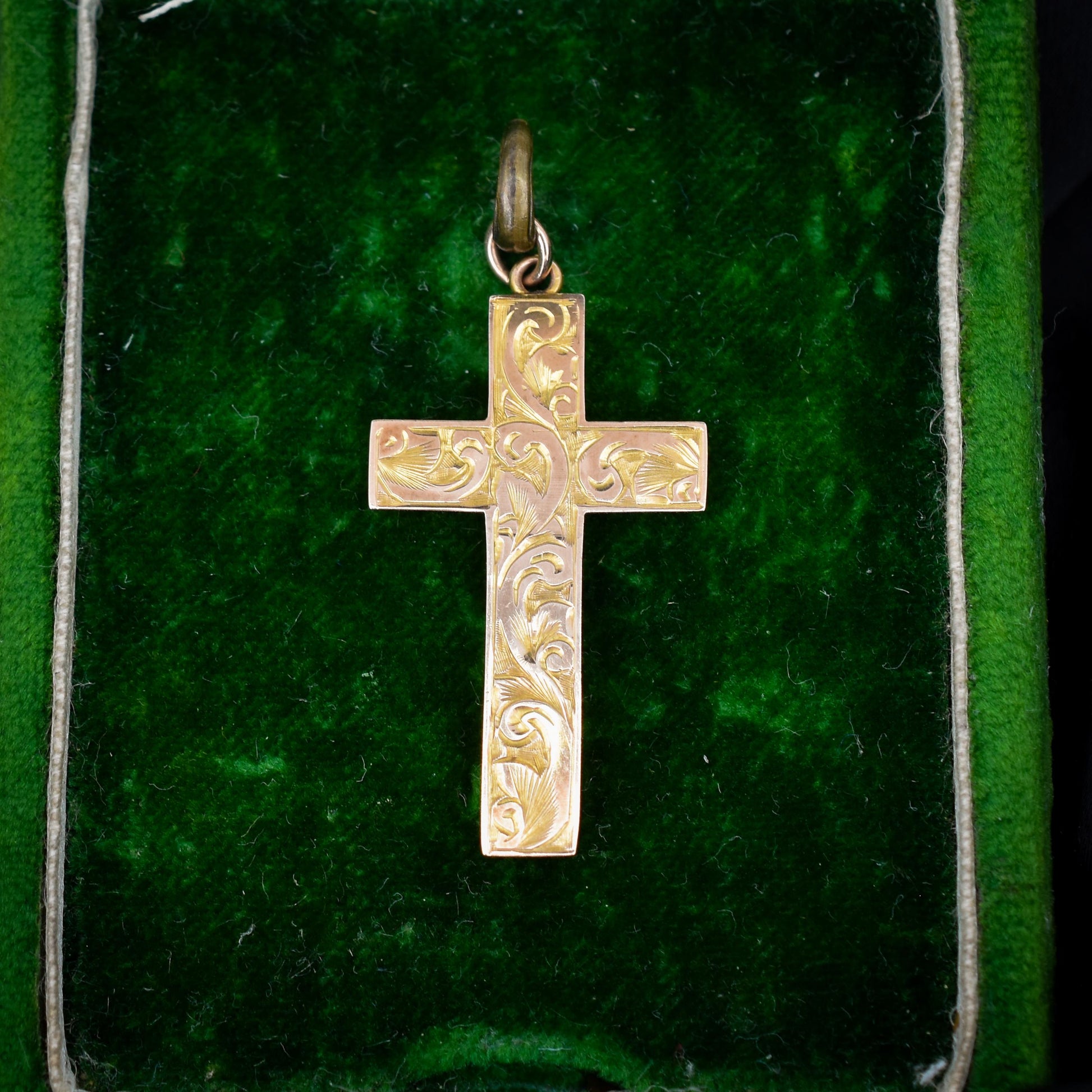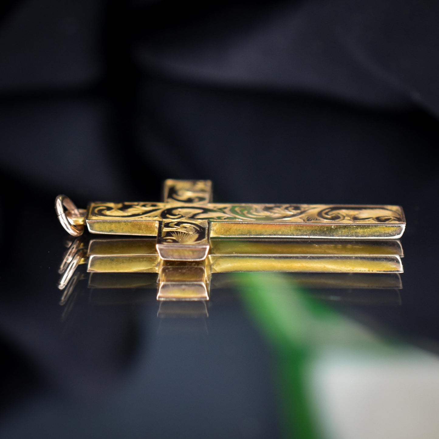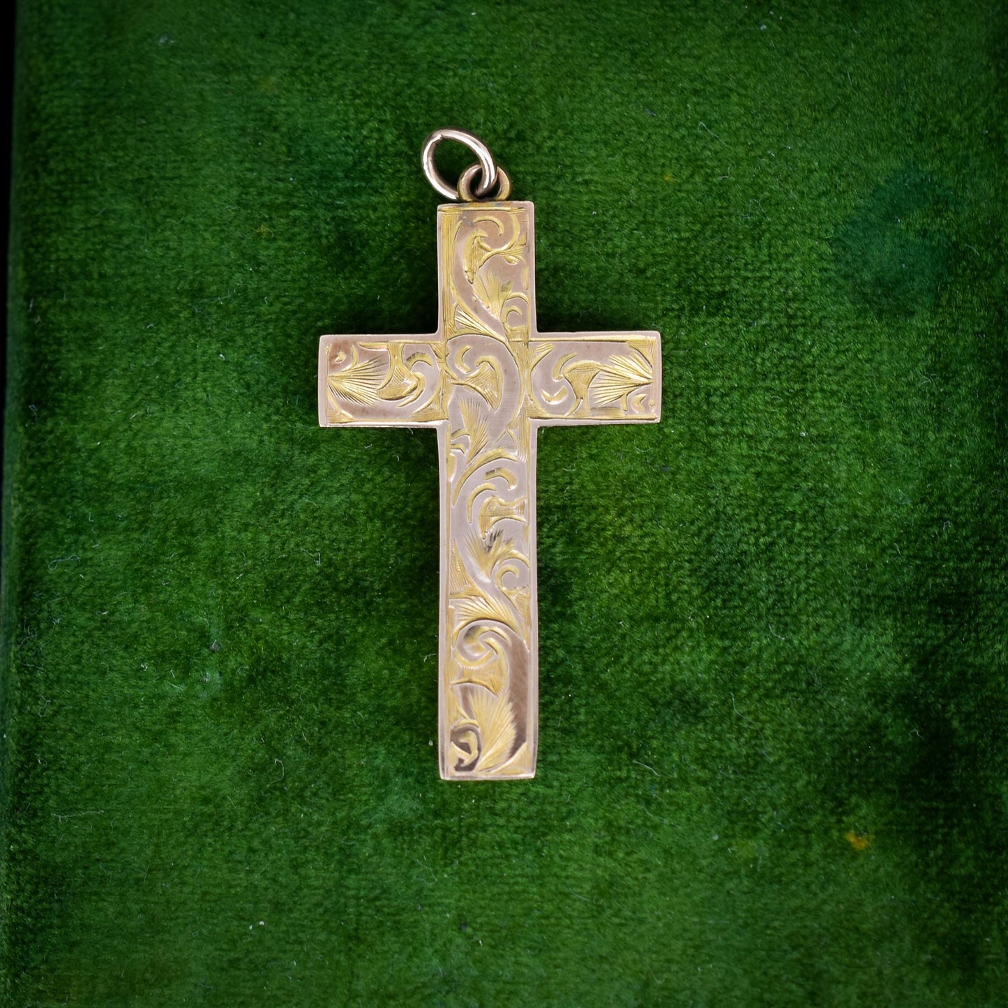 This timeless Antique cross pendant is modelled in solid 9ct Gold and features an engraved front. The cross is also hallmarked on the reverse with the maker's mark and 9ct gold.