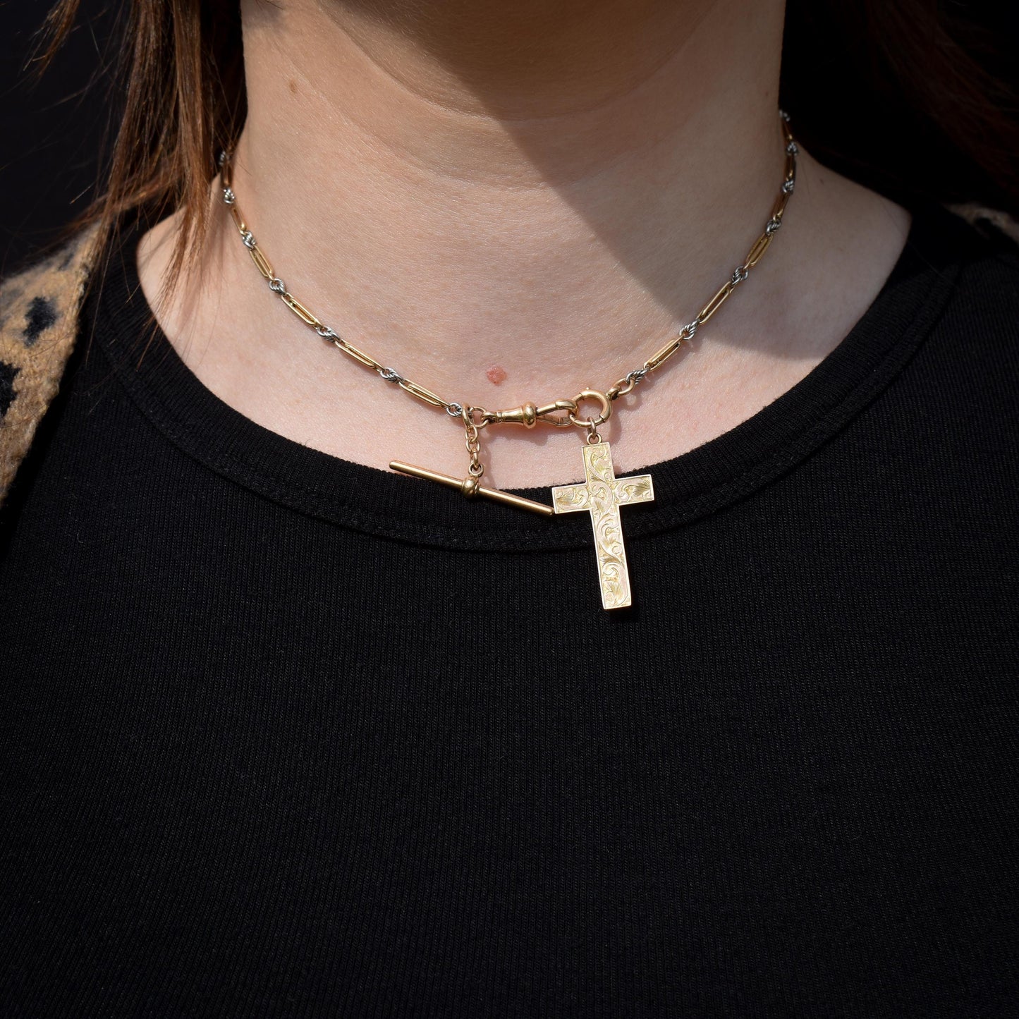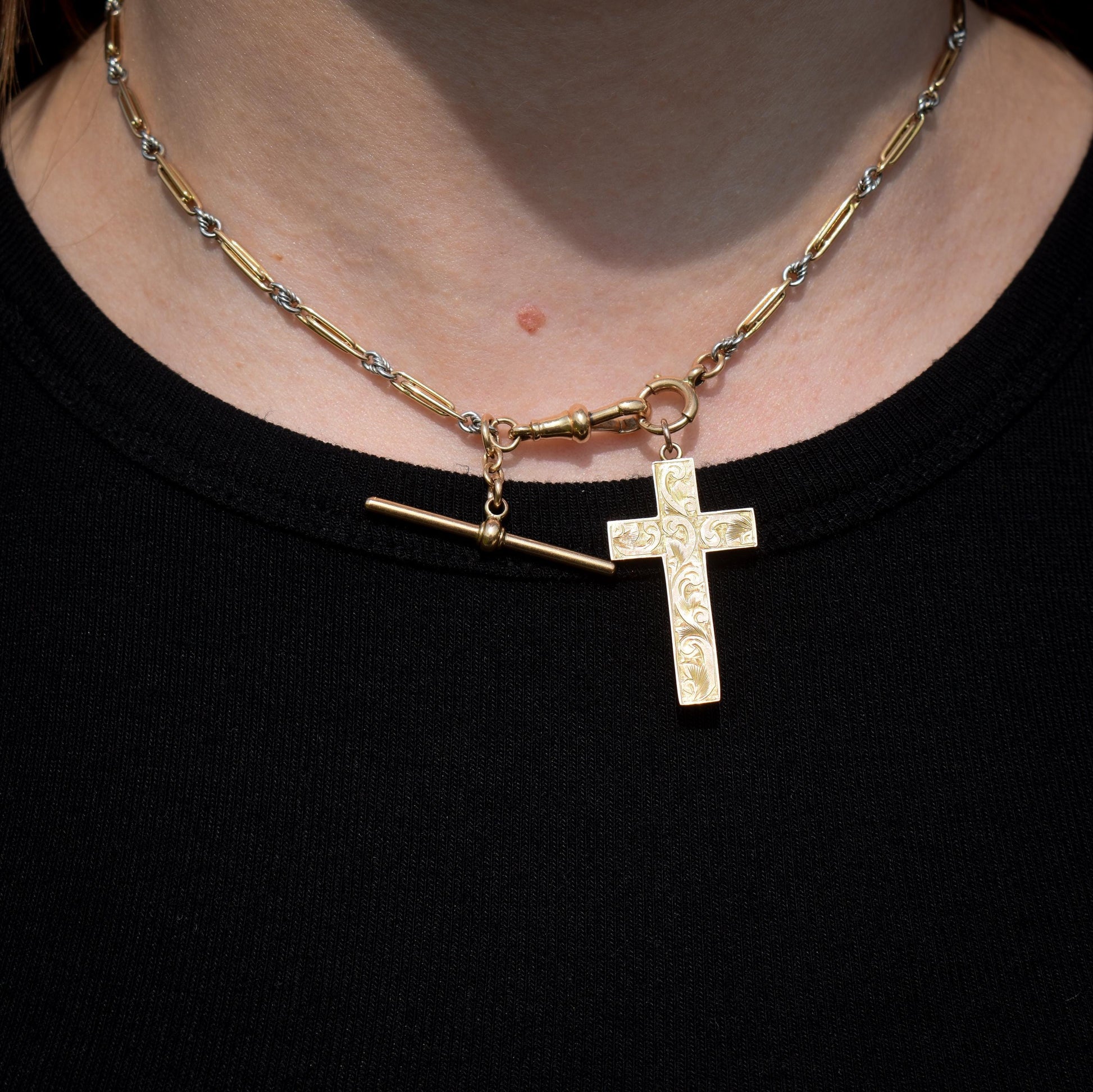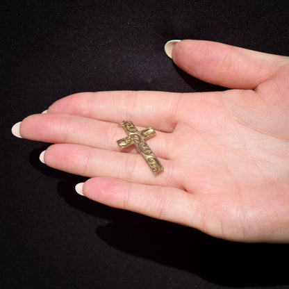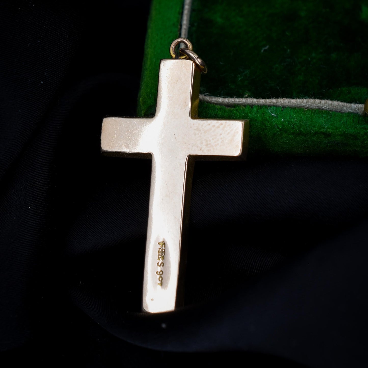 This timeless Antique cross pendant is modelled in solid 9ct Gold and features an engraved front. The cross is also hallmarked on the reverse with the maker's mark and 9ct gold.