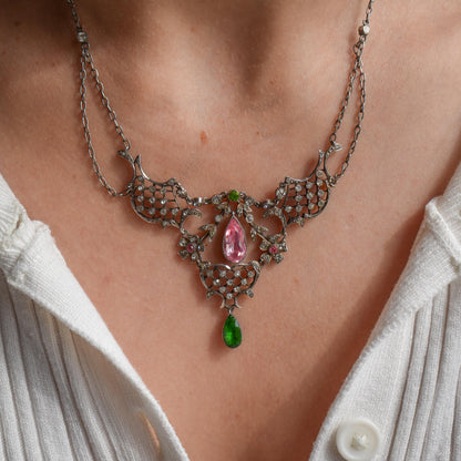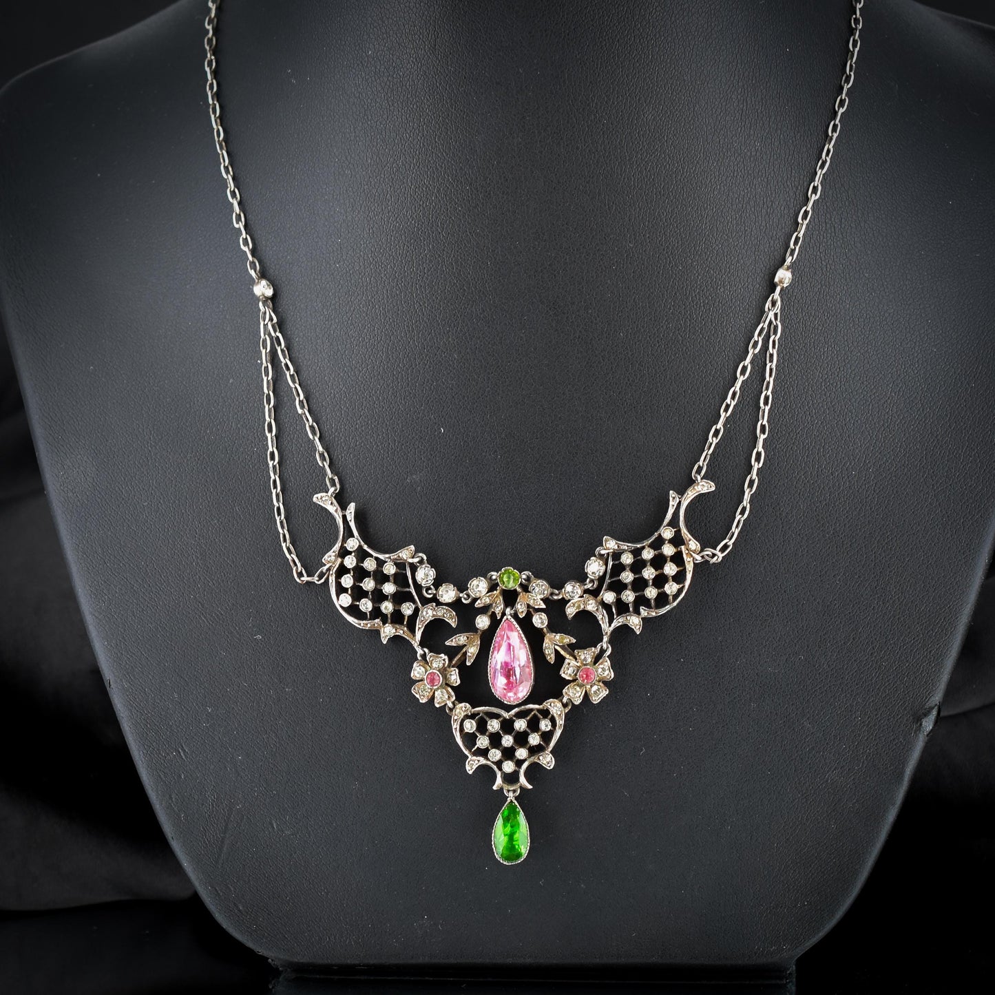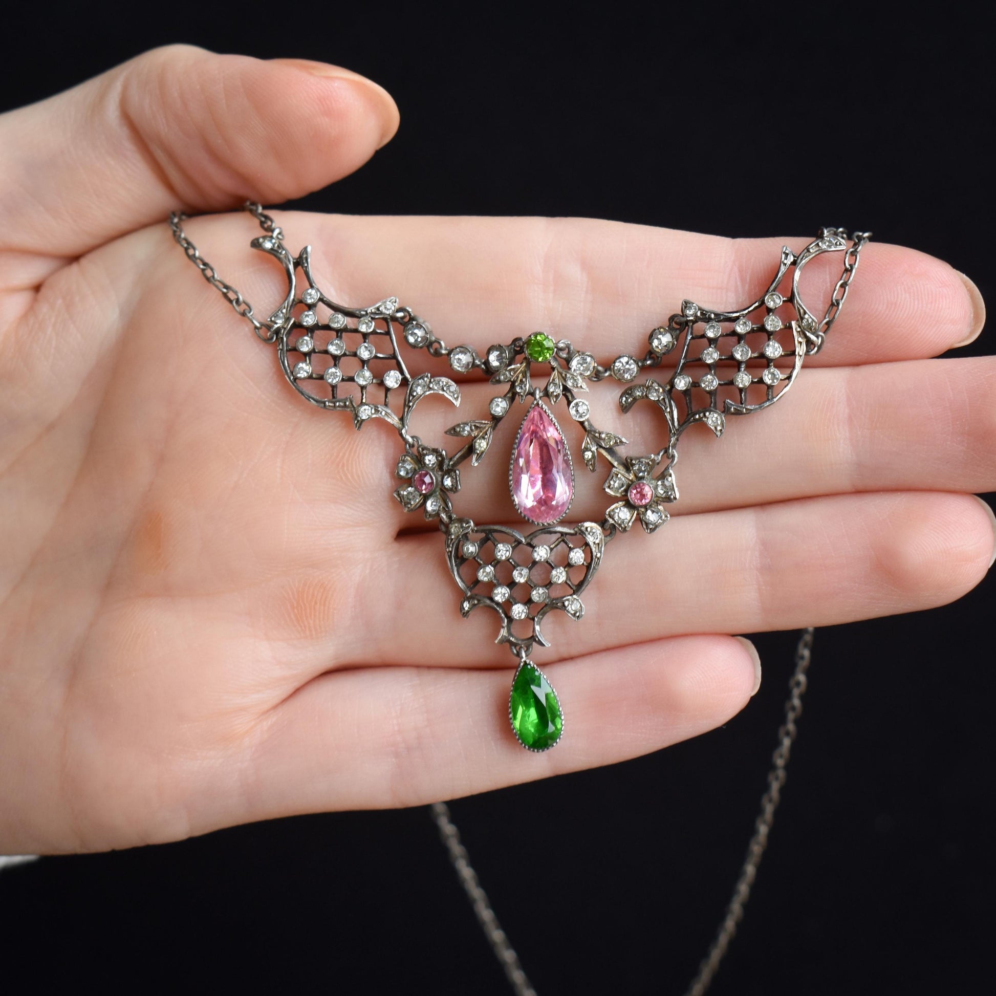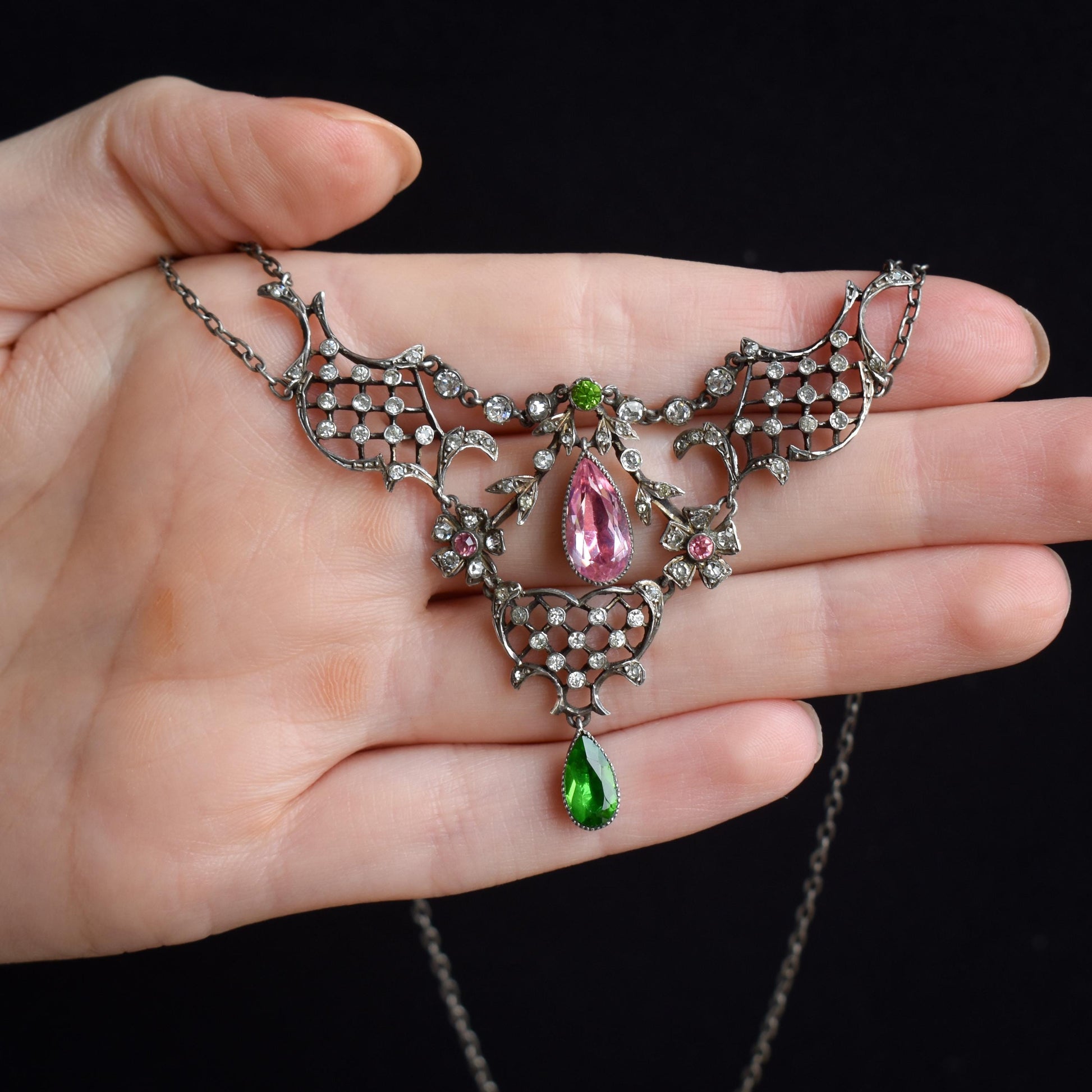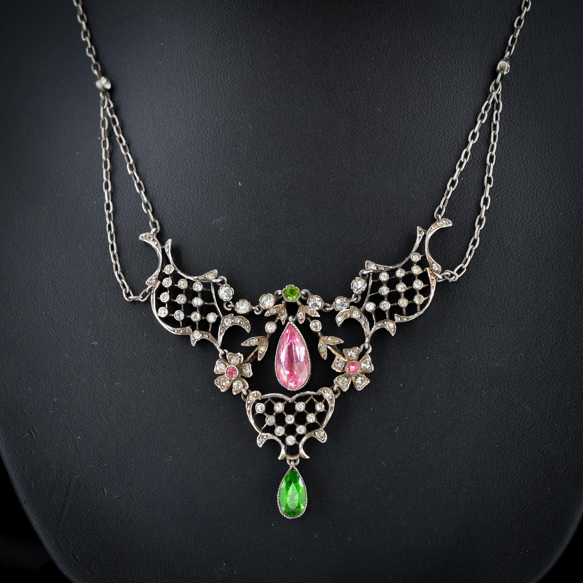 A beautiful antique lavaliere necklace from the early 1900s featuring a fabulous floral gallery consisting of loops and flowers. They’re encrusted with twinkling suffragette colours, such as white, green, and pink pastes, with larger pear-cut paste droppers dangling in the centre and from the bottom.