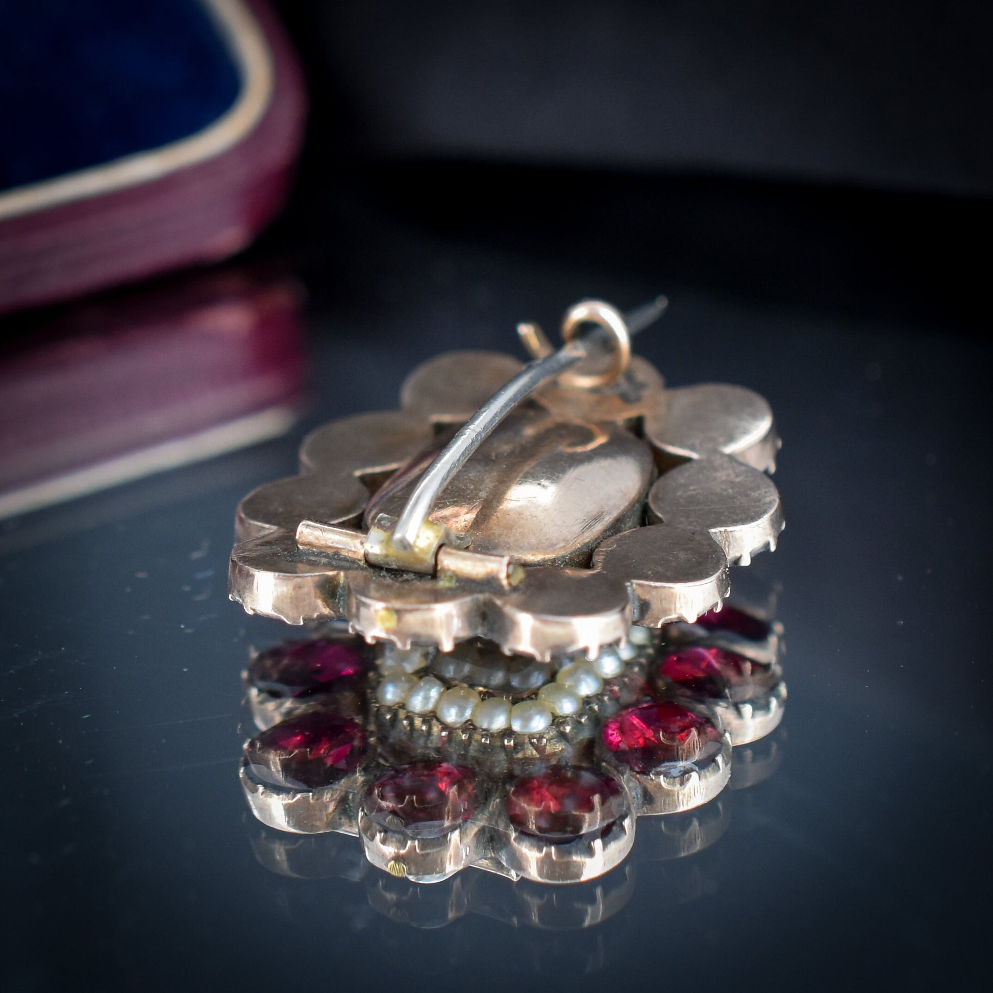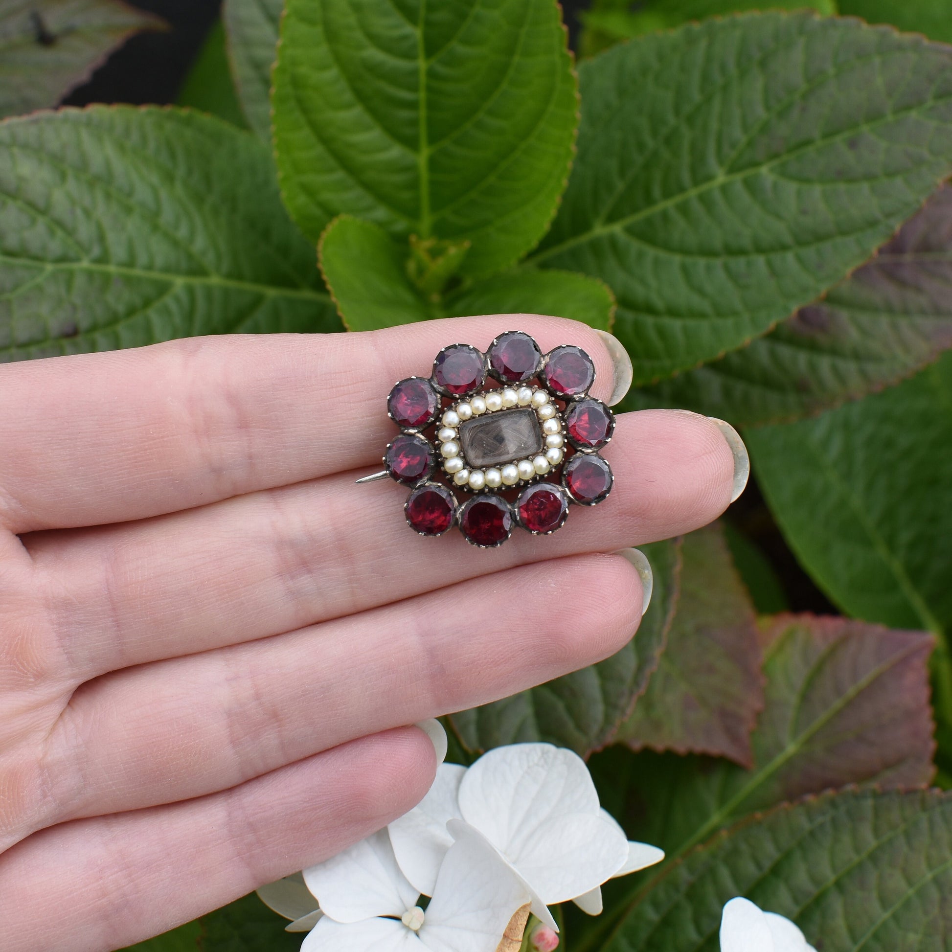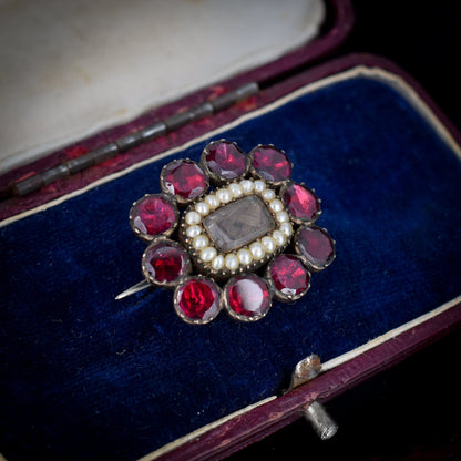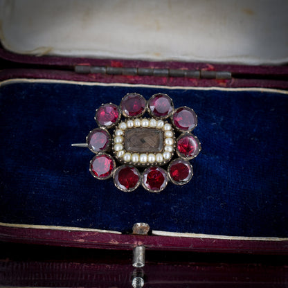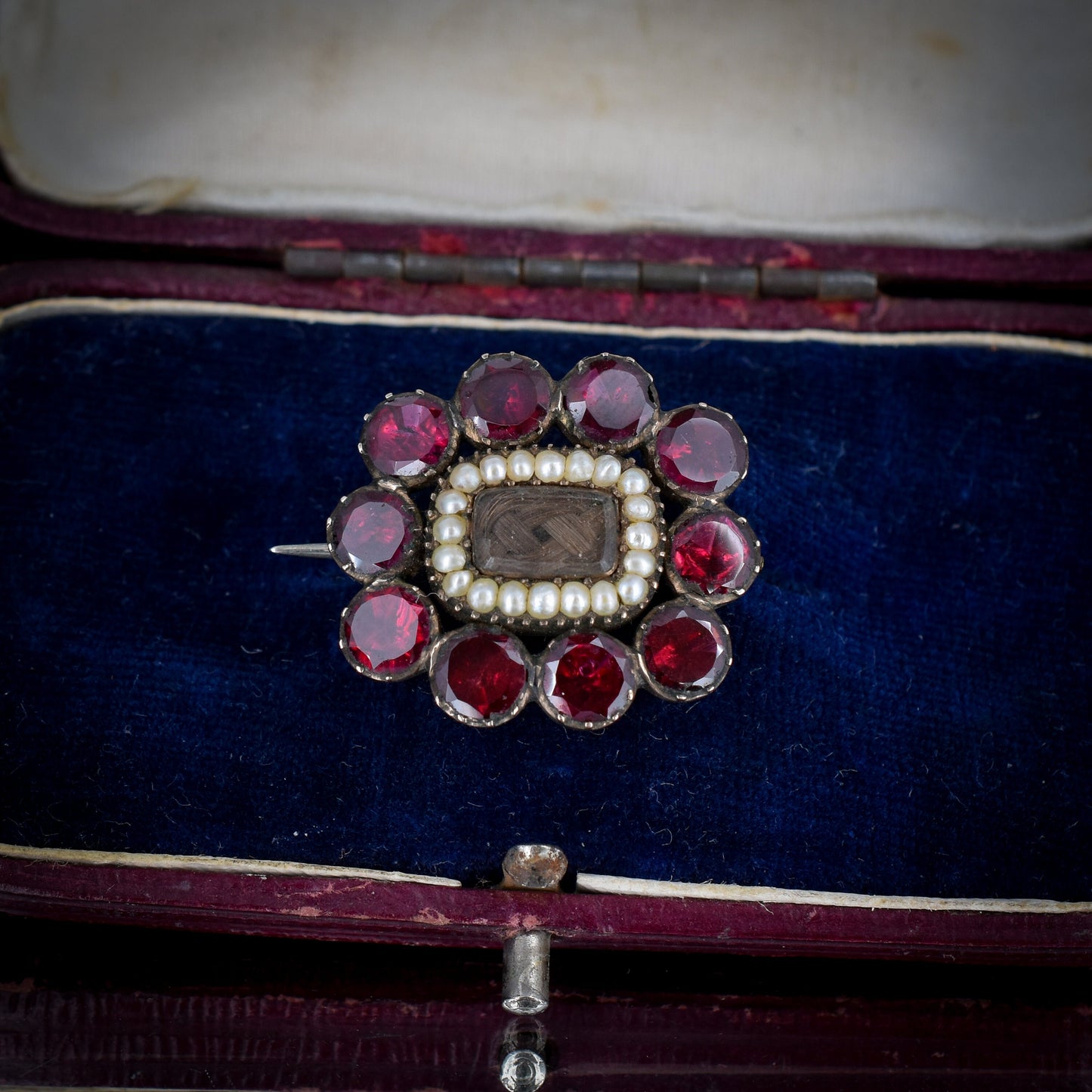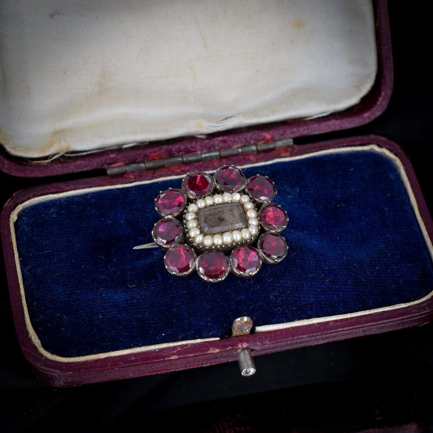 Inside the Garnet halo, there is a second halo of original natural seed Pearls surrounding a glass casing containing fine plaited hair. Hair was often used in jewellery during the Georgian and Victorian pieces as a sign of remembering a loved one.