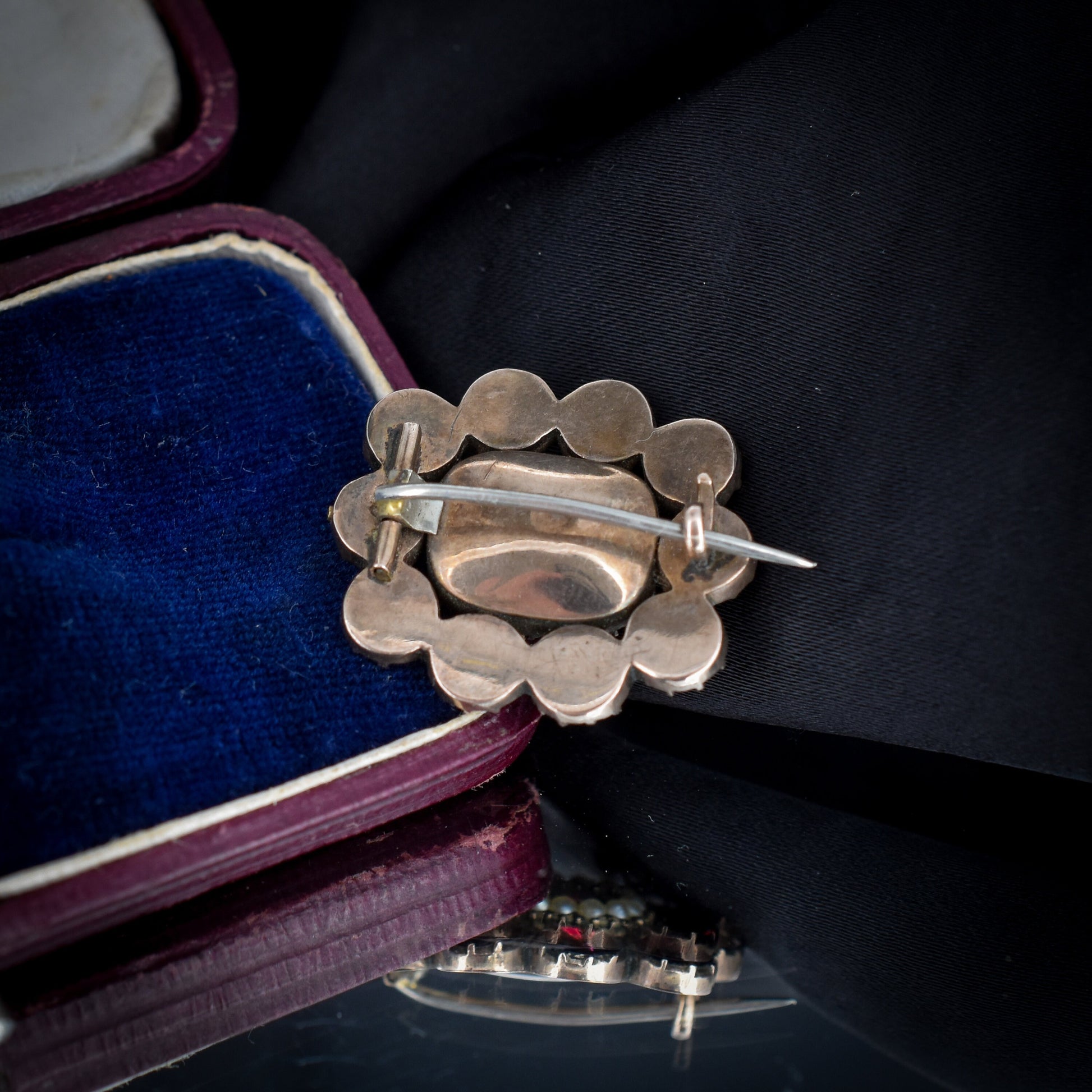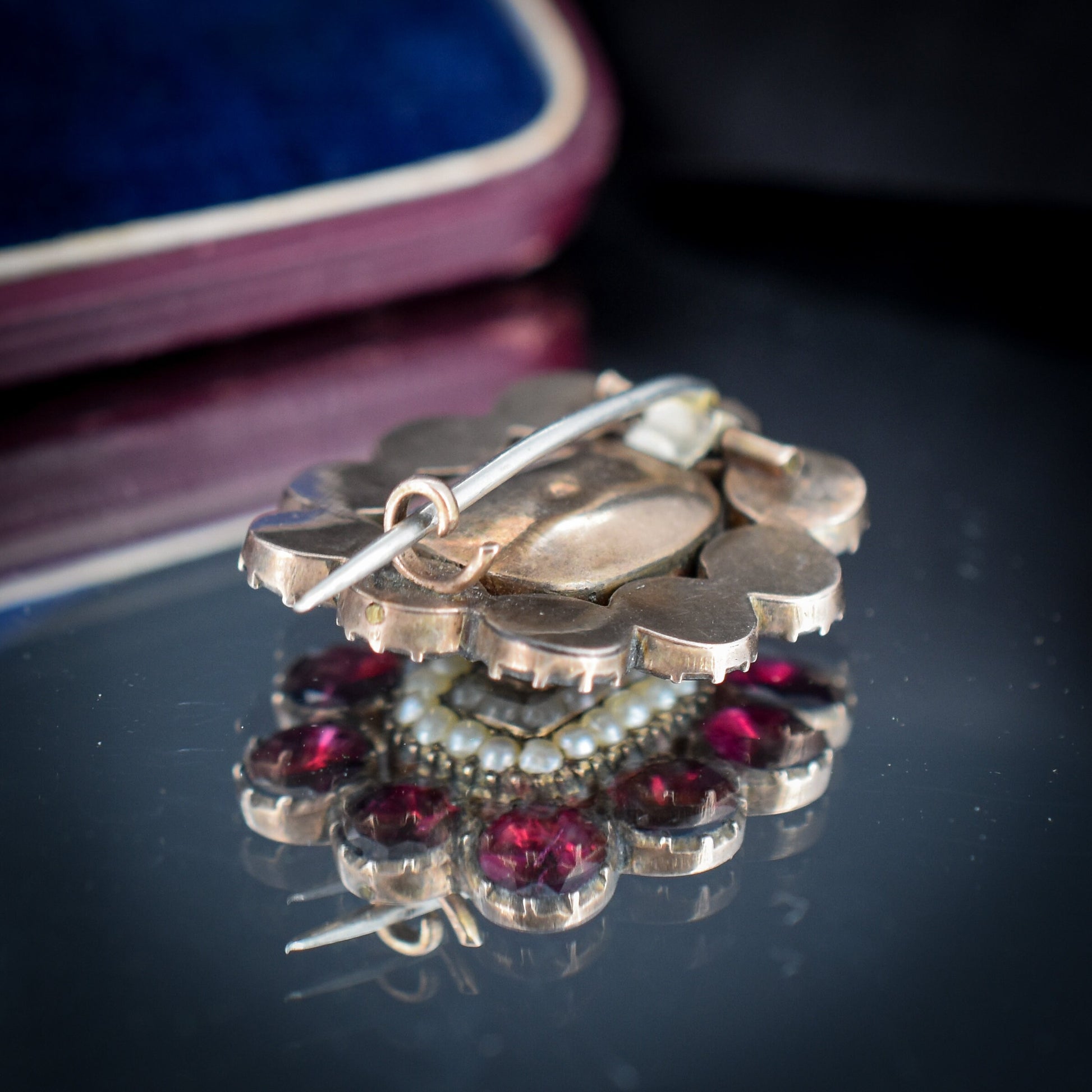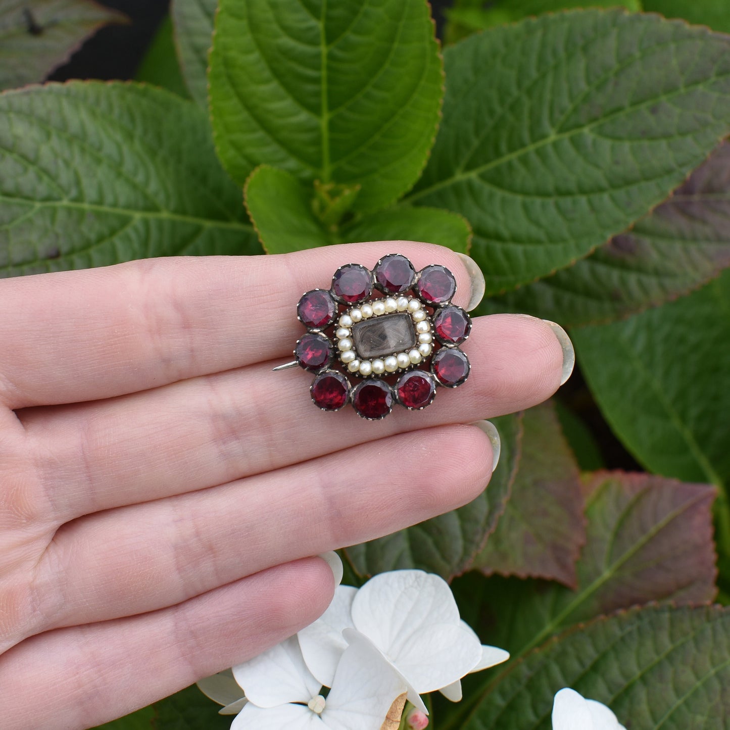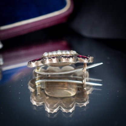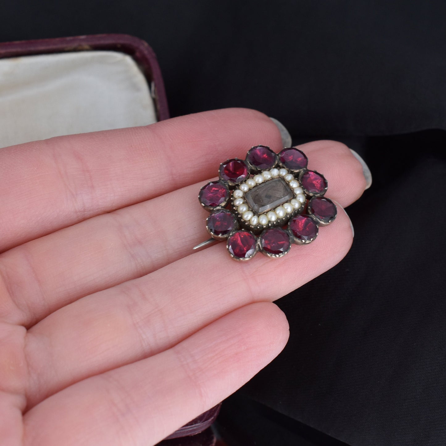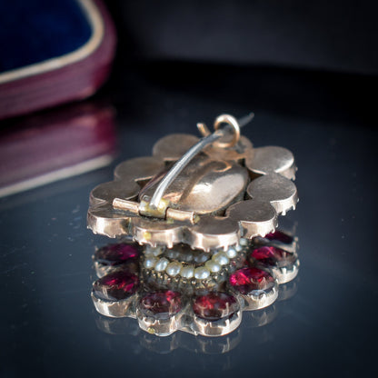 This stunning Antique flat cut Garnet and Pearl mourning pin dates to the early 1800's and is set in 9ct Gold.