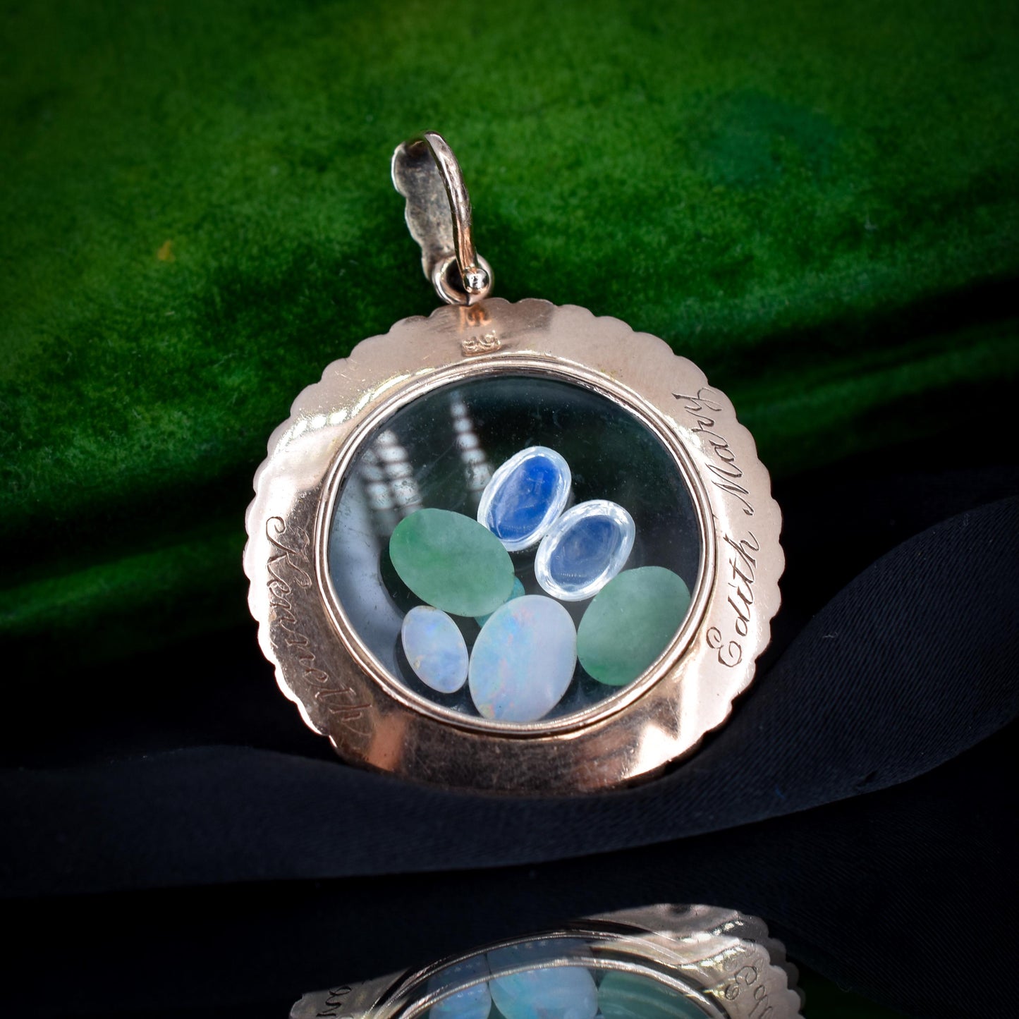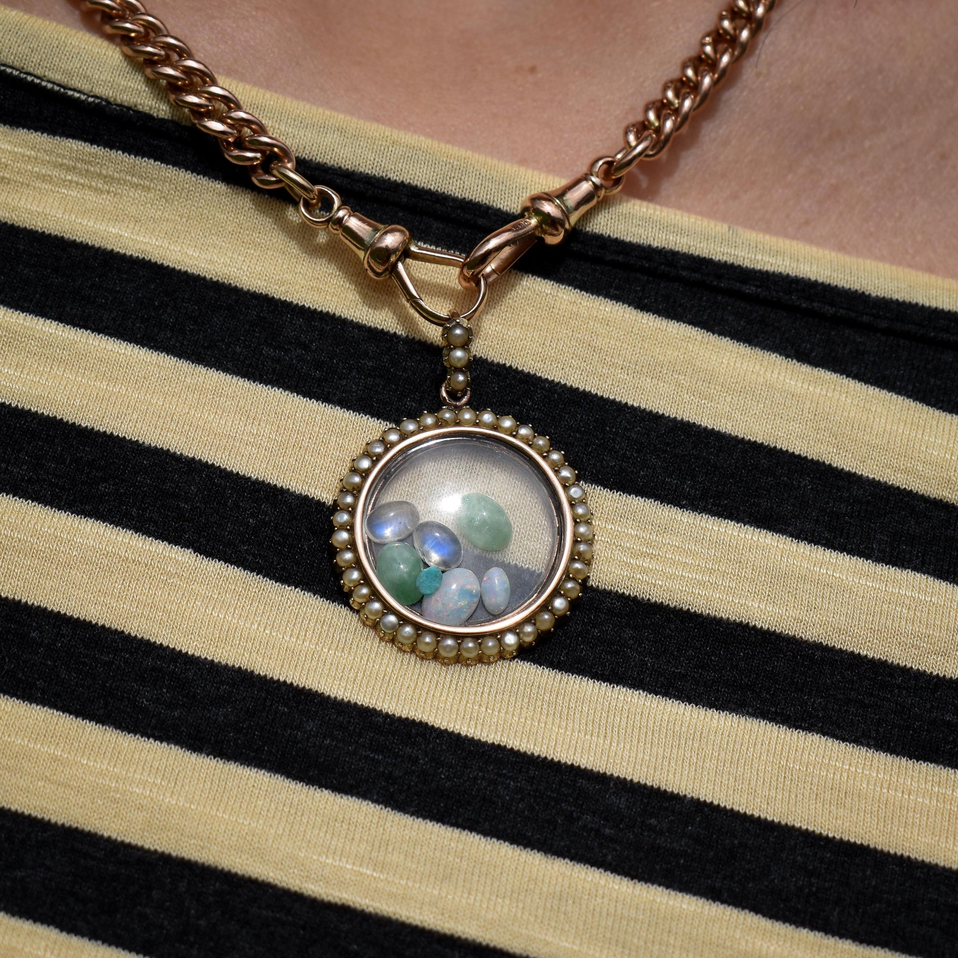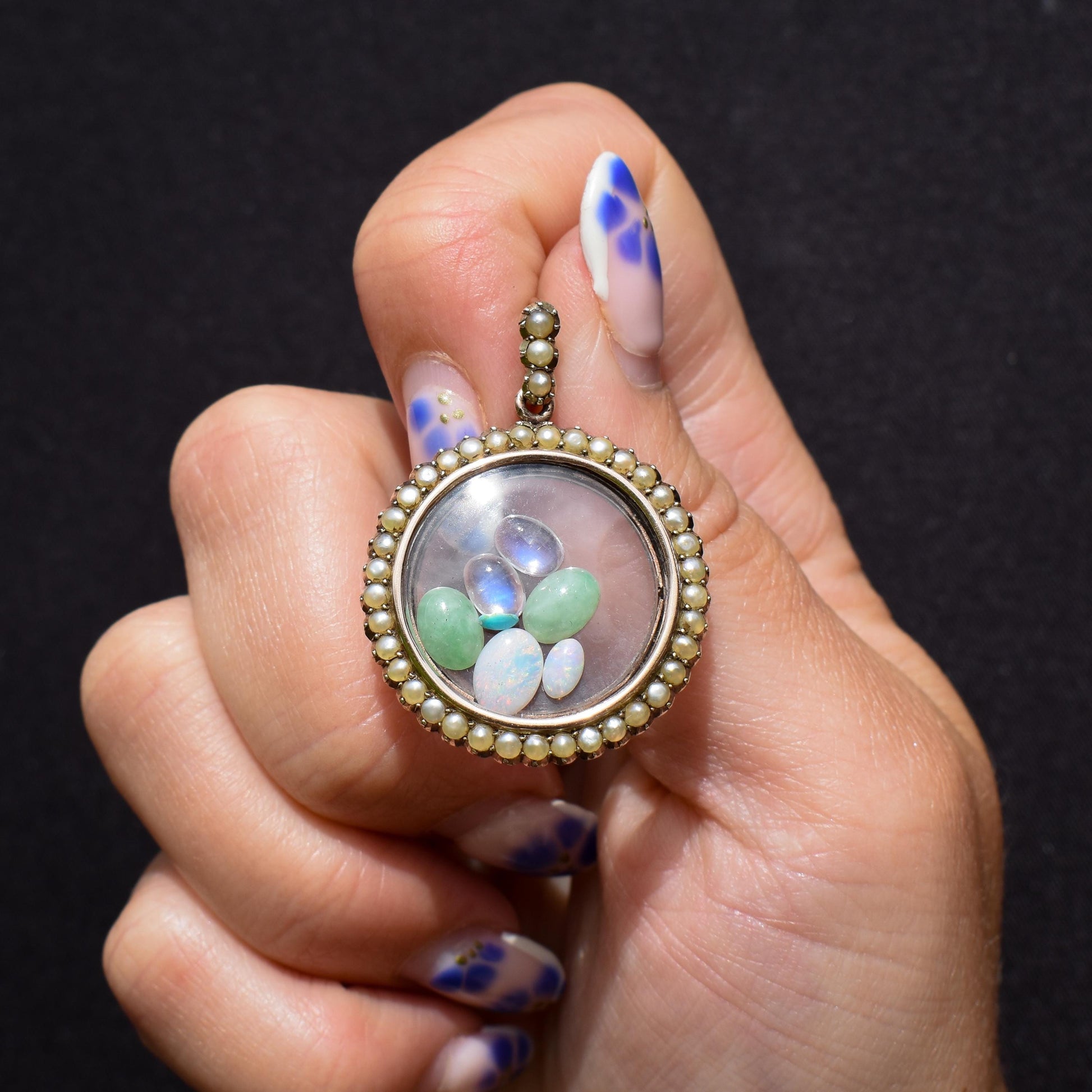 We found this antique piece as a plain locket and had it transformed into a gemstone shaker locket, adding a colourful confetti of natural gemstones. The stones inside the locket are Moonstone, Jade, Turquoise, and some wonderful opals, all Natural.