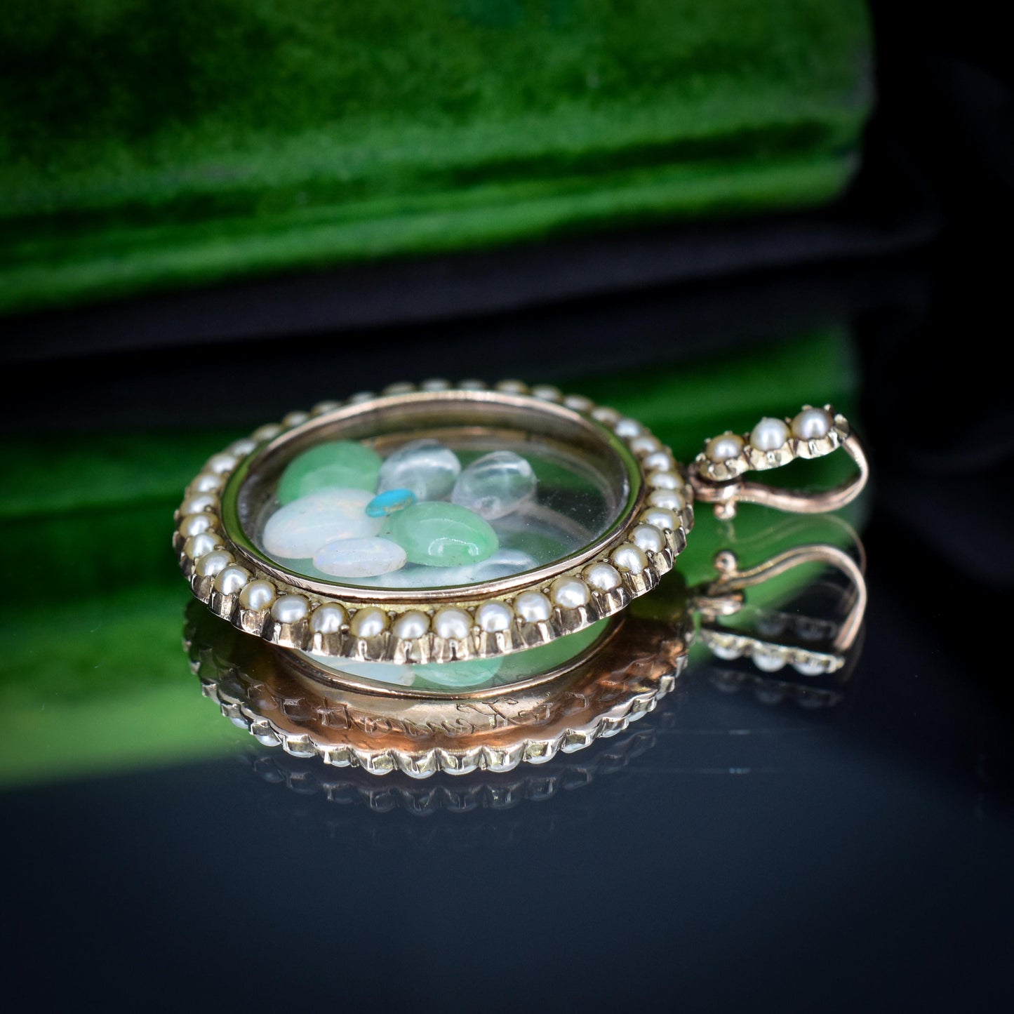 This quality Antique locket dates to the Edwardian period and is set with a 9ct Gold frame and glass centre. It has been designed beautifully, featuring thirty-seven seed pearls around the border and three more on the bail, giving it an elegant look.
