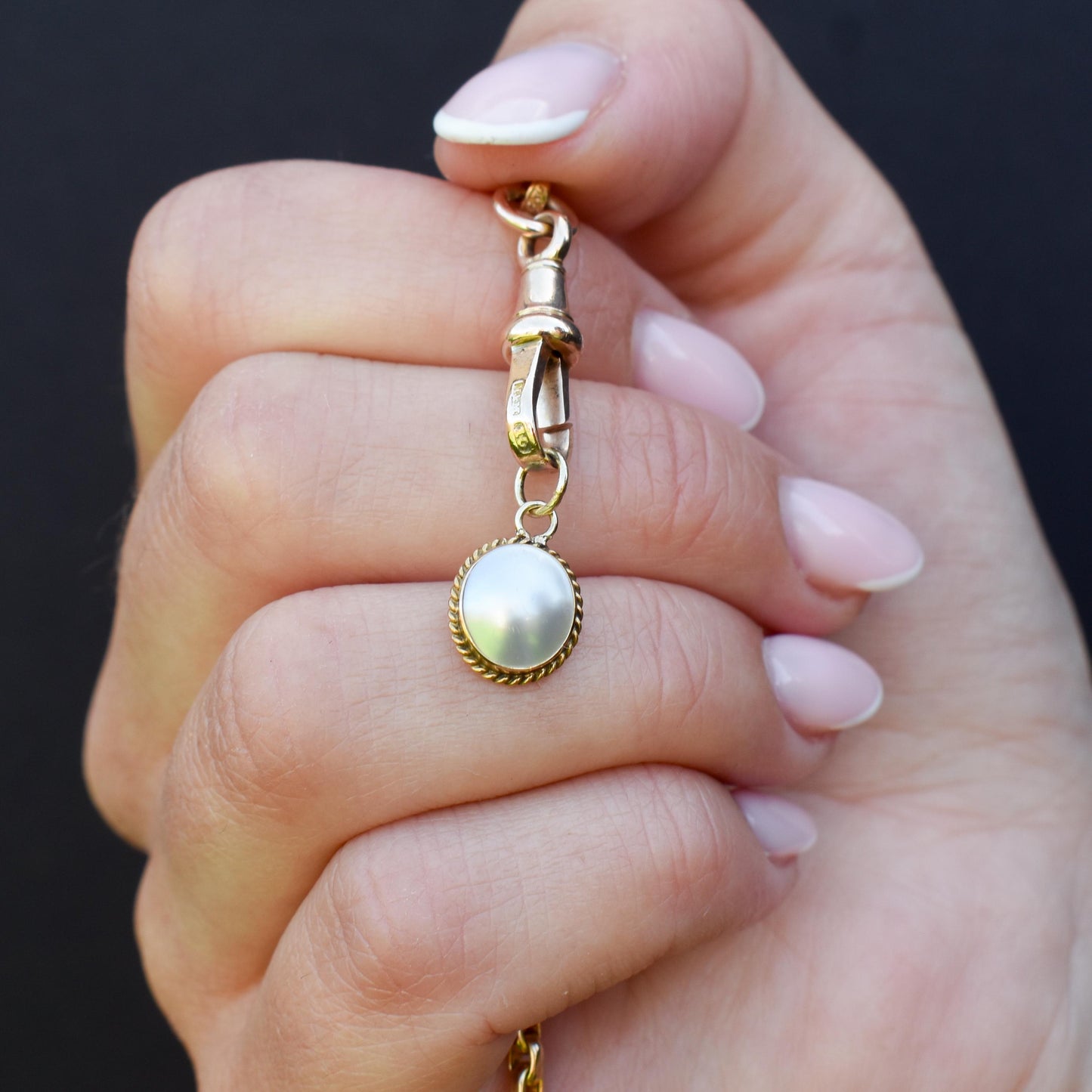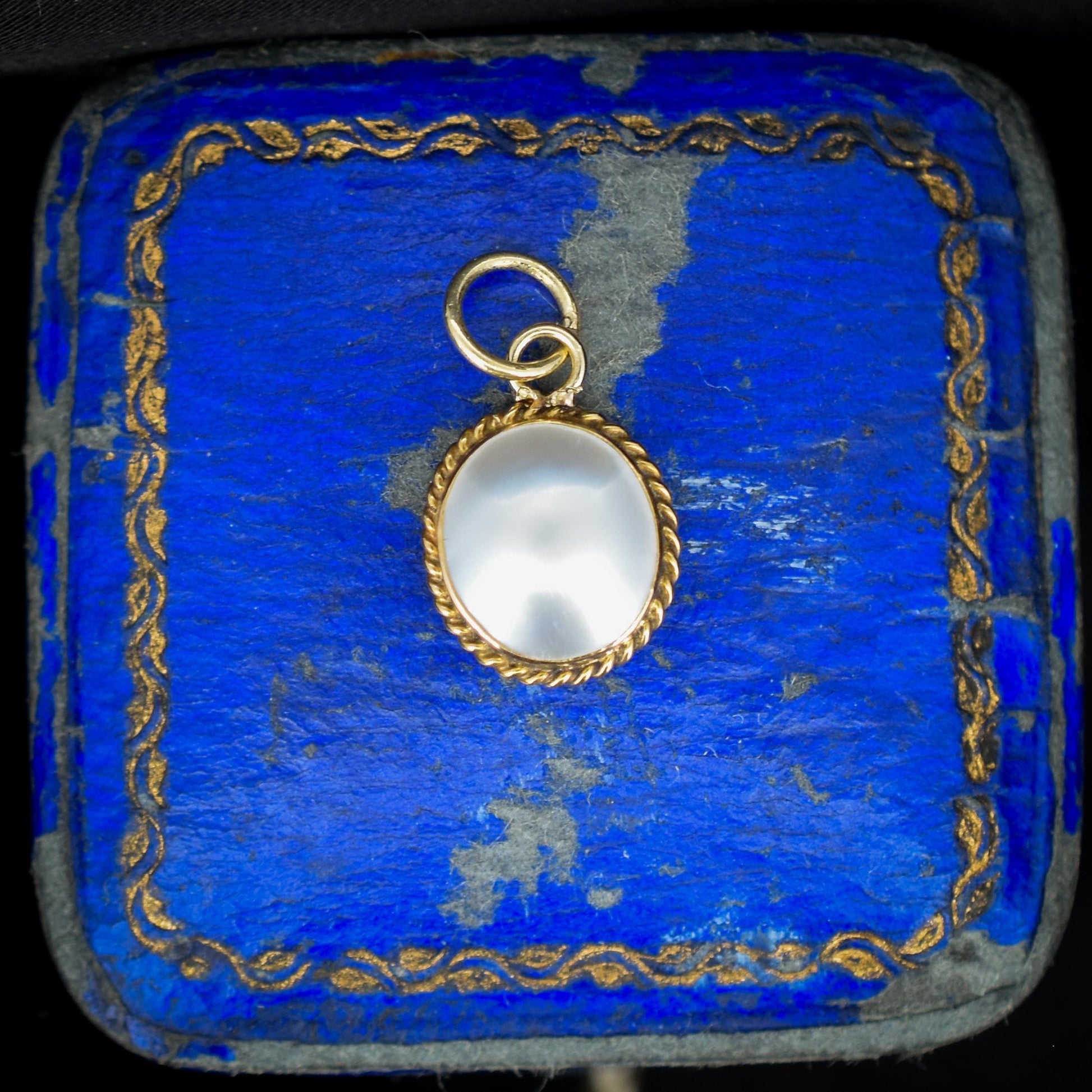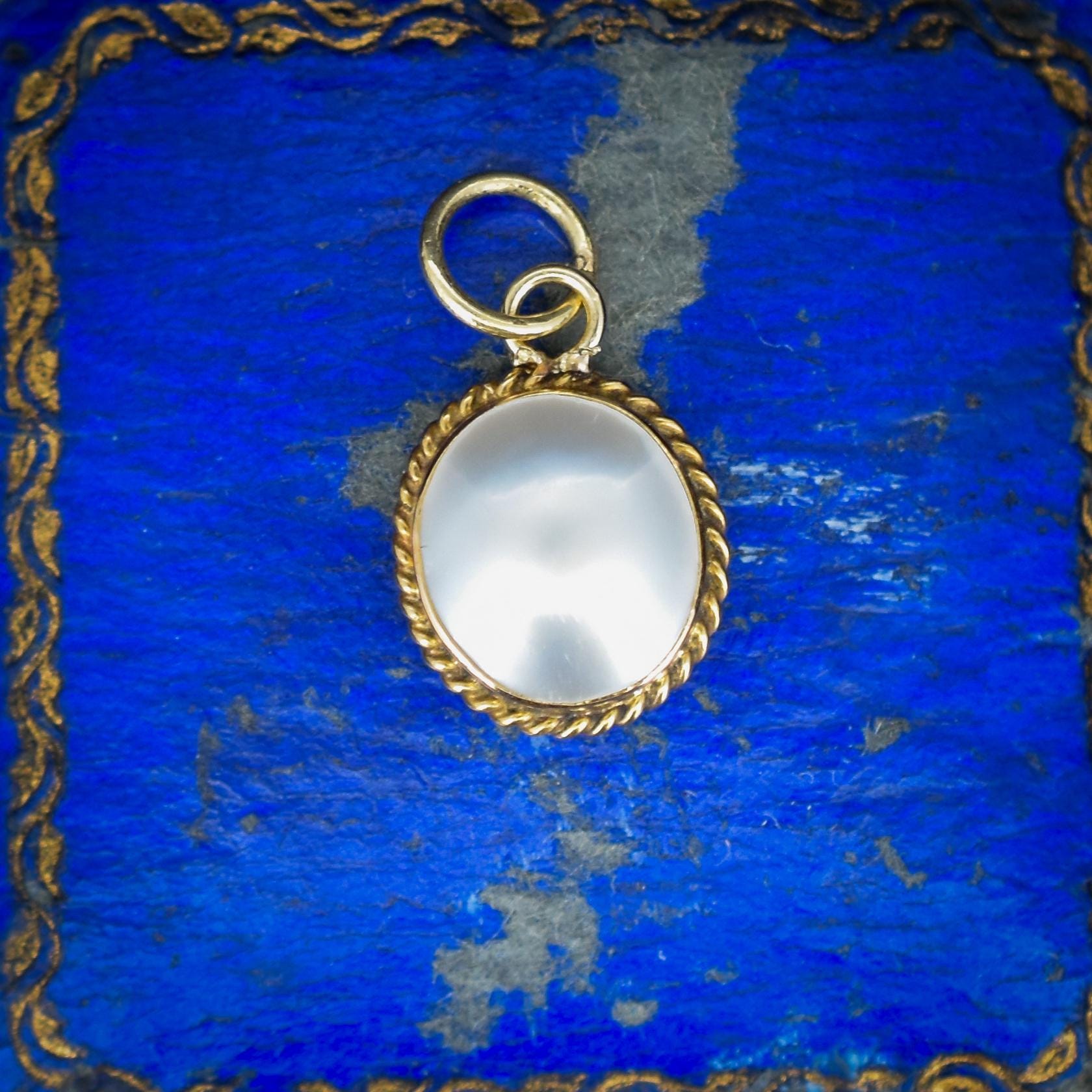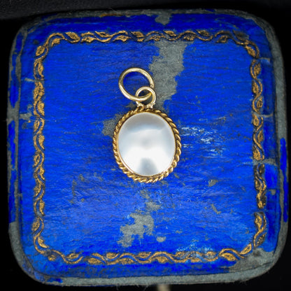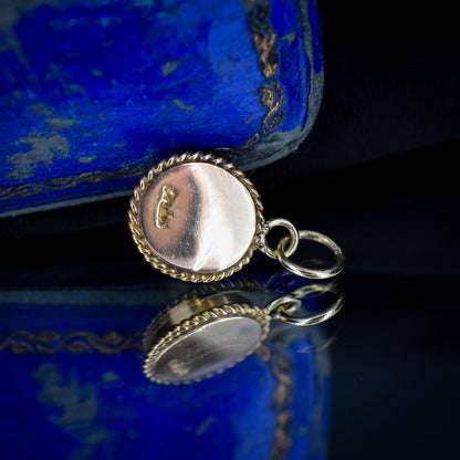This exquisite antique charm features a Pearl set in a 9ct gold bezel border with a pretty rope twist boundary to elevate this charming piece.
