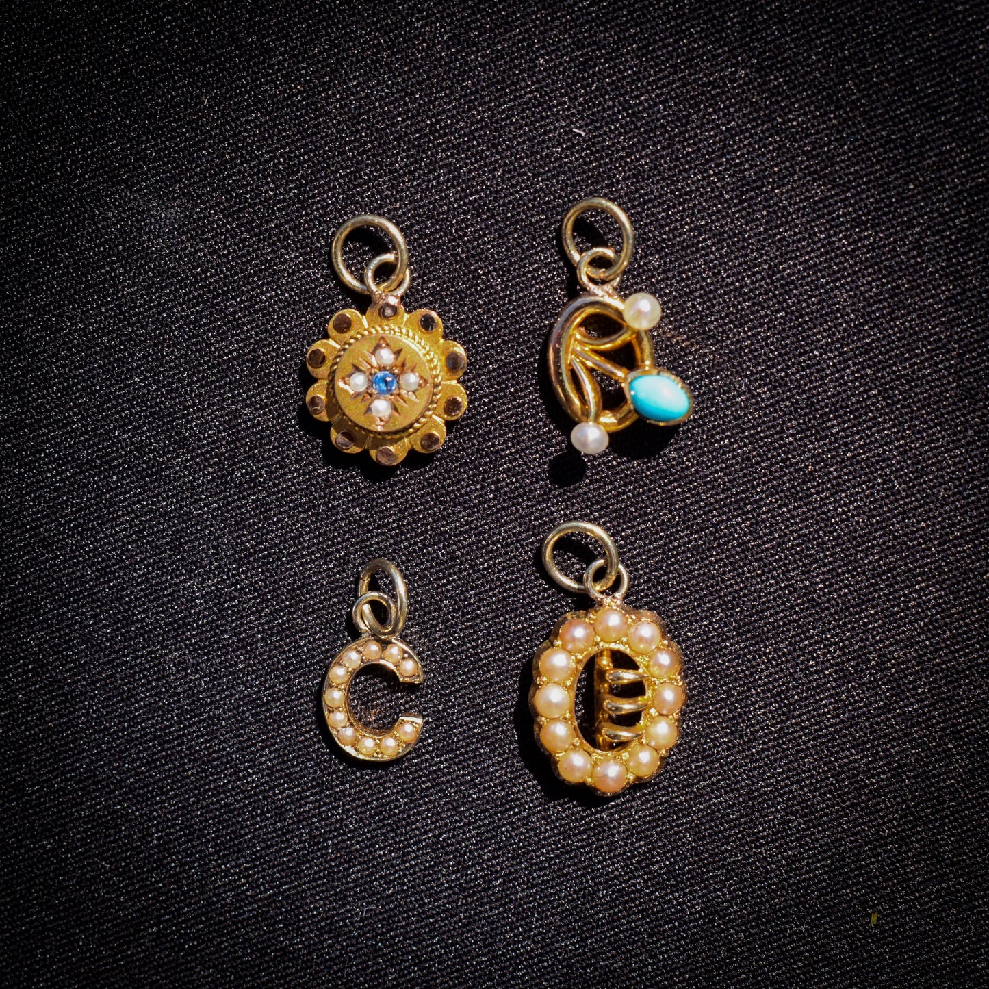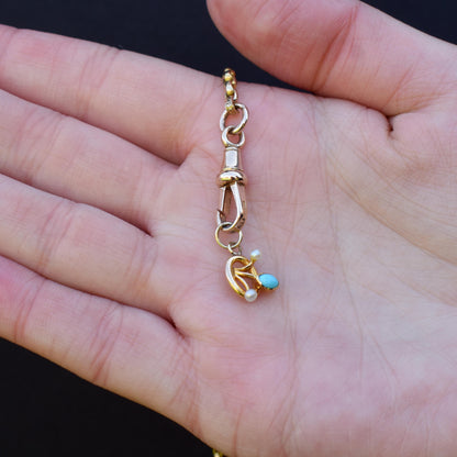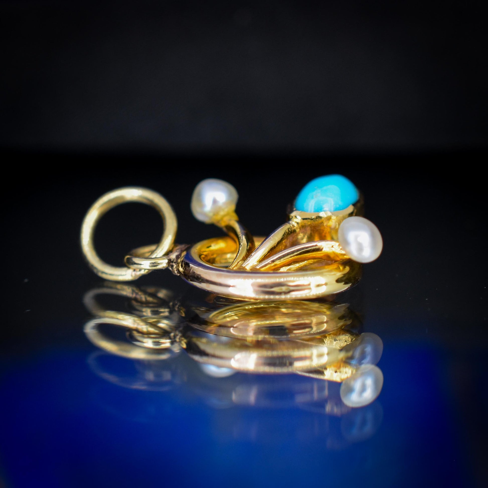 This exquisite antique flower charm, crafted in 15ct gold, showcases a delicate arrangement of turquoise and pearls to beautifully represent blooming flowers.