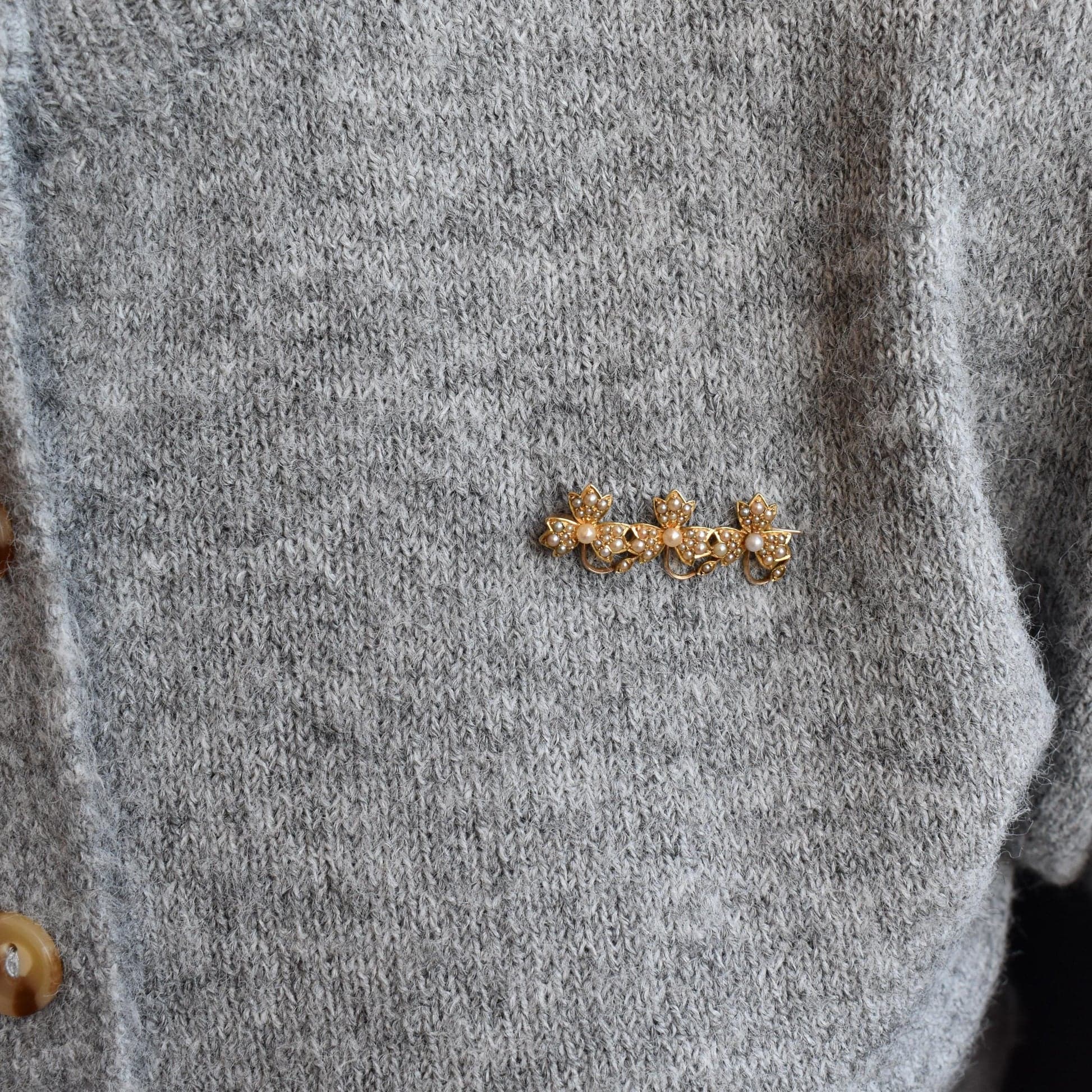 Antique Victorian 15ct Gold Pearl Triple Clover Brooch