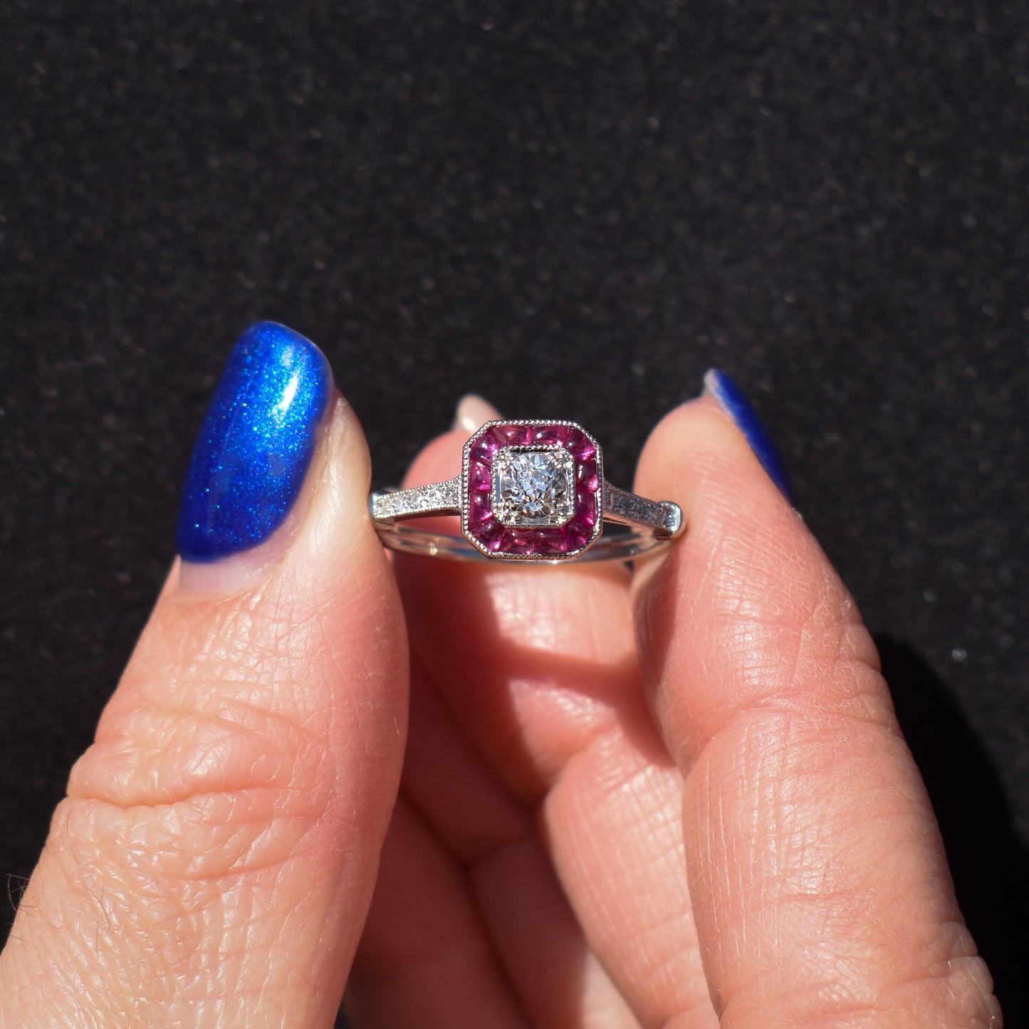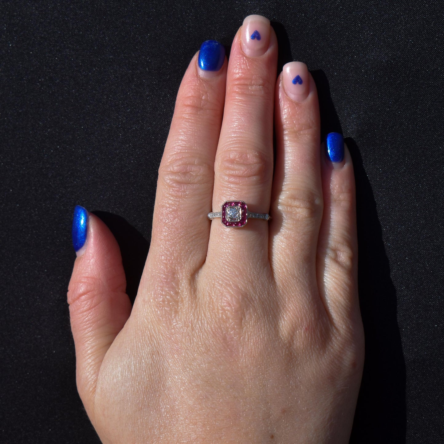 This stunning Art Deco-style ring features a central .25ct Old Cut Diamond surrounded by a halo of 0.40ct calibre-cut Rubies, modelled in Platinum.