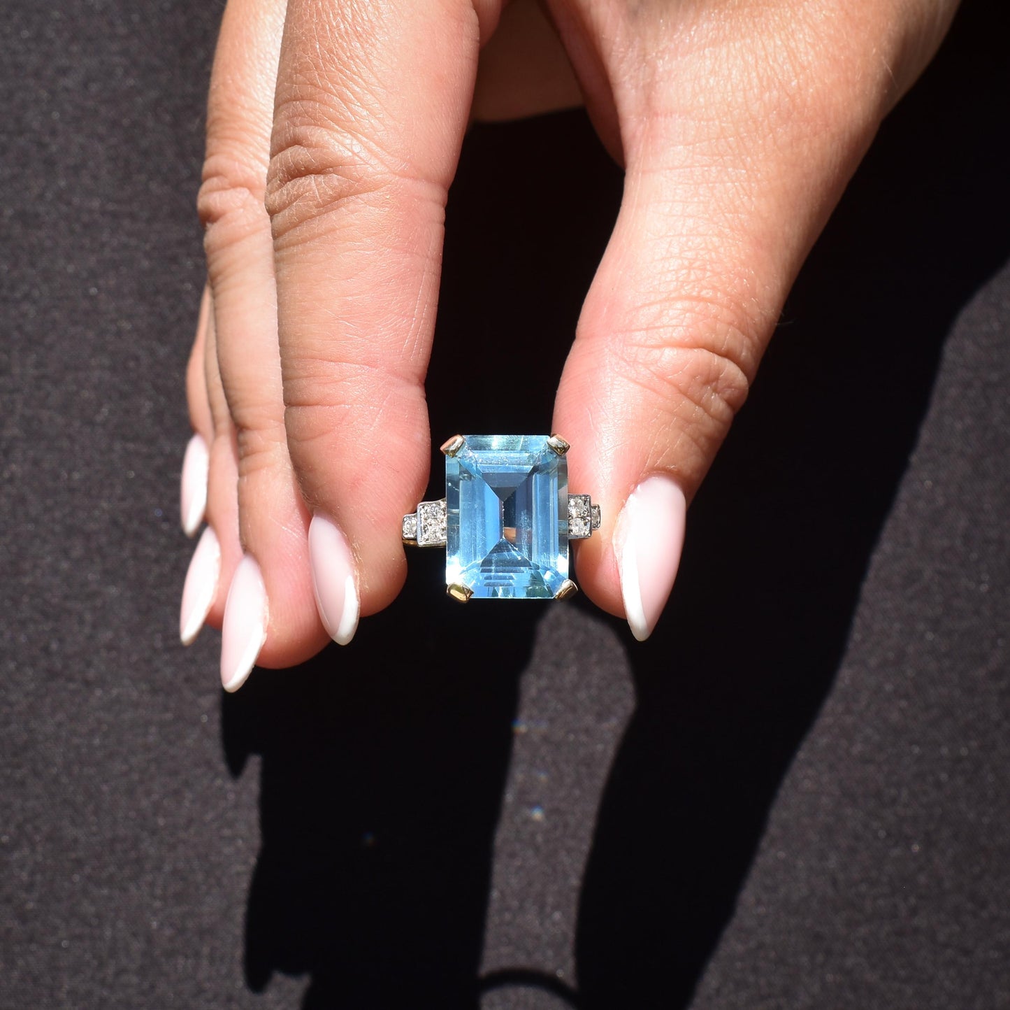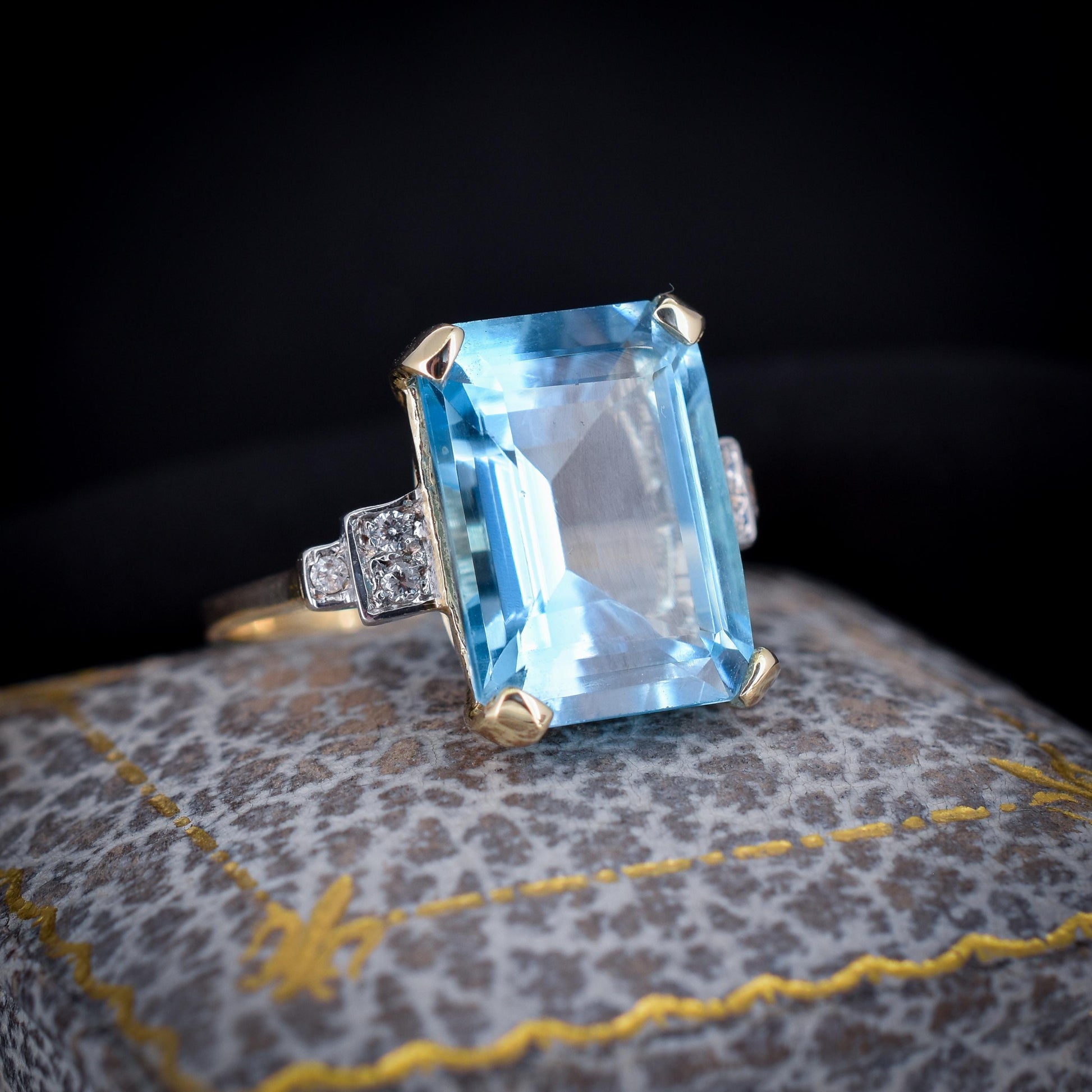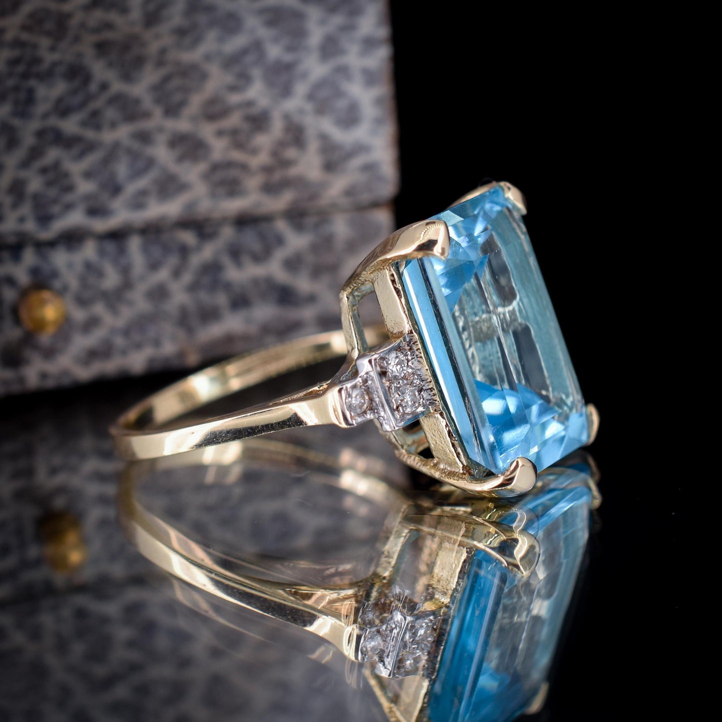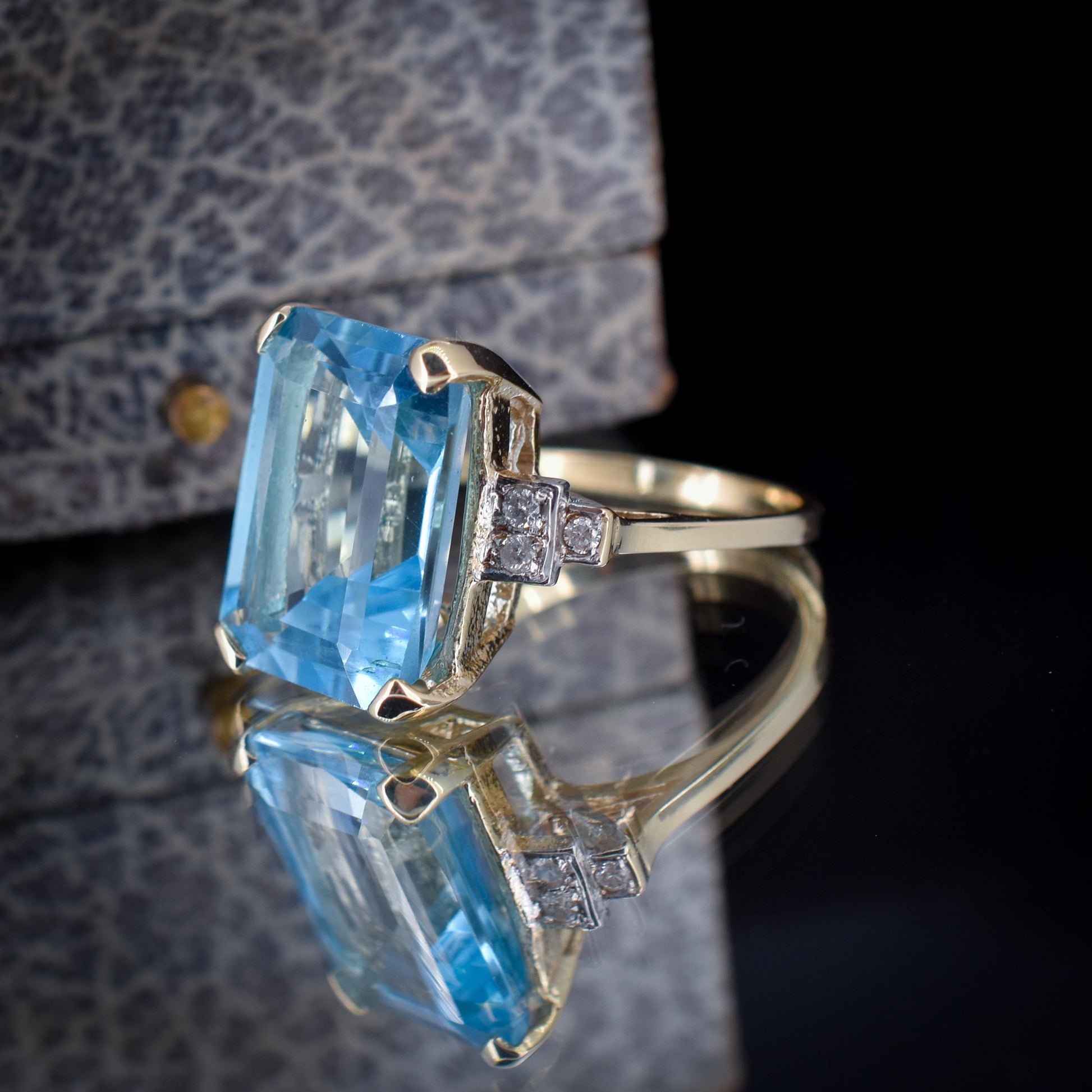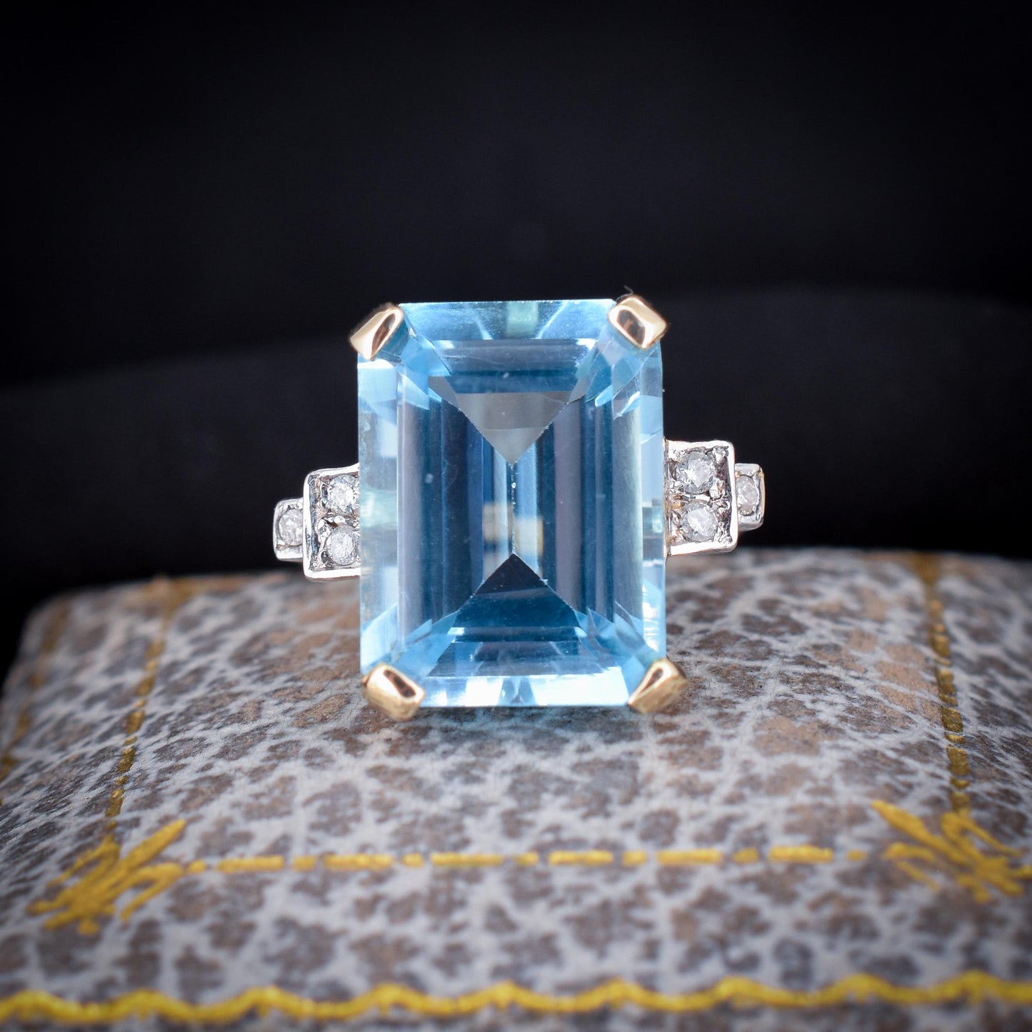 This statement Art Deco Style ring features a beautiful Emerald cut sky Blue Topaz gemstone, set with Diamond shoulders, modelled in 9ct Gold throughout.