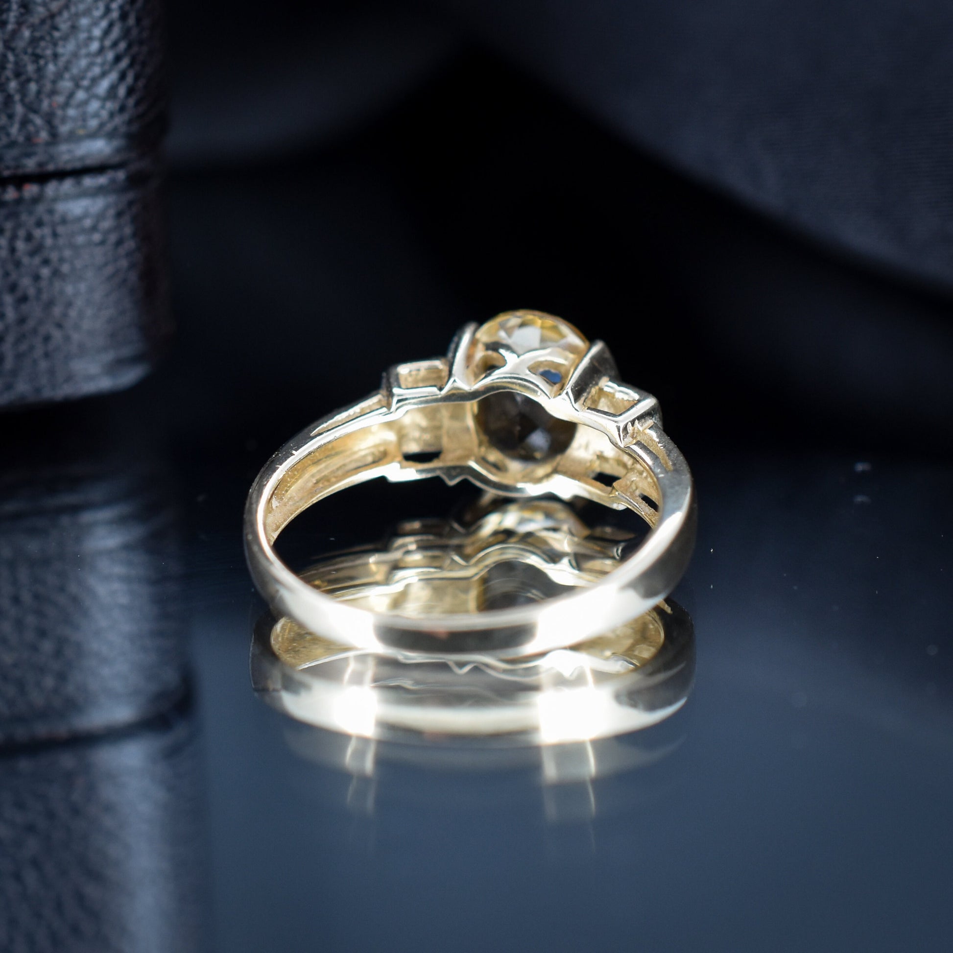 This quality Vintage Citrine ring features a 1.40ct Citrine gemstone set beautifully in a half bezel setting with patterned shoulders, modelled in 9ct Yellow Gold.