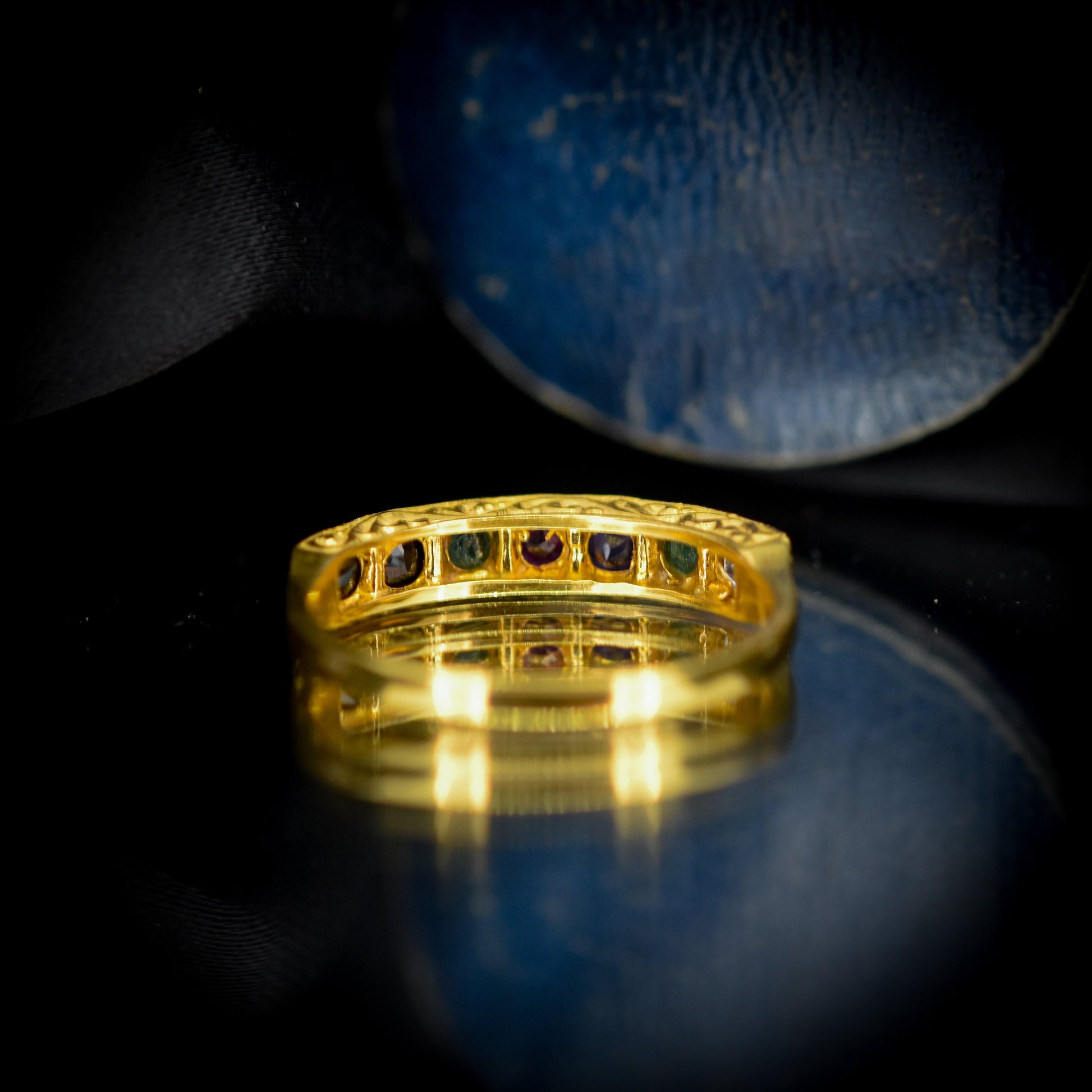 This quality Acrostic band features the word 'DEAREST' spelt out with precious gemstones. Diamond (Paste), Emerald, Amethyst, Ruby, Emerald, Sapphire and Topaz are all set in Silver and gilded in 18ct Gold.