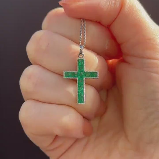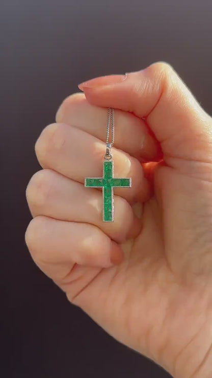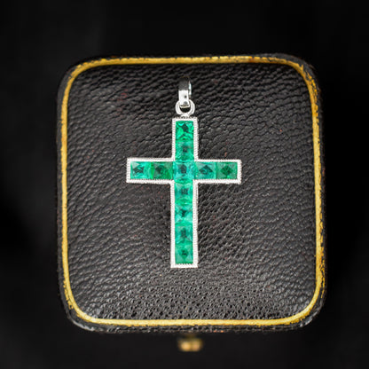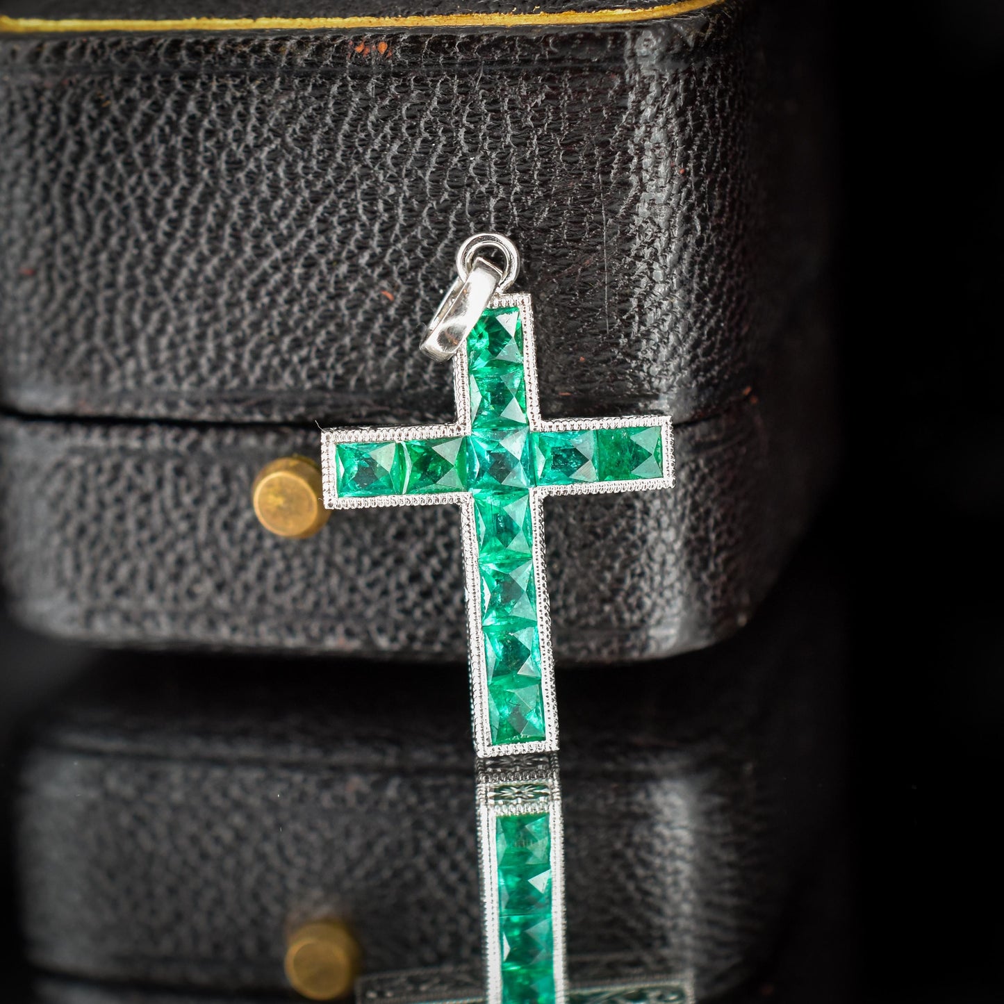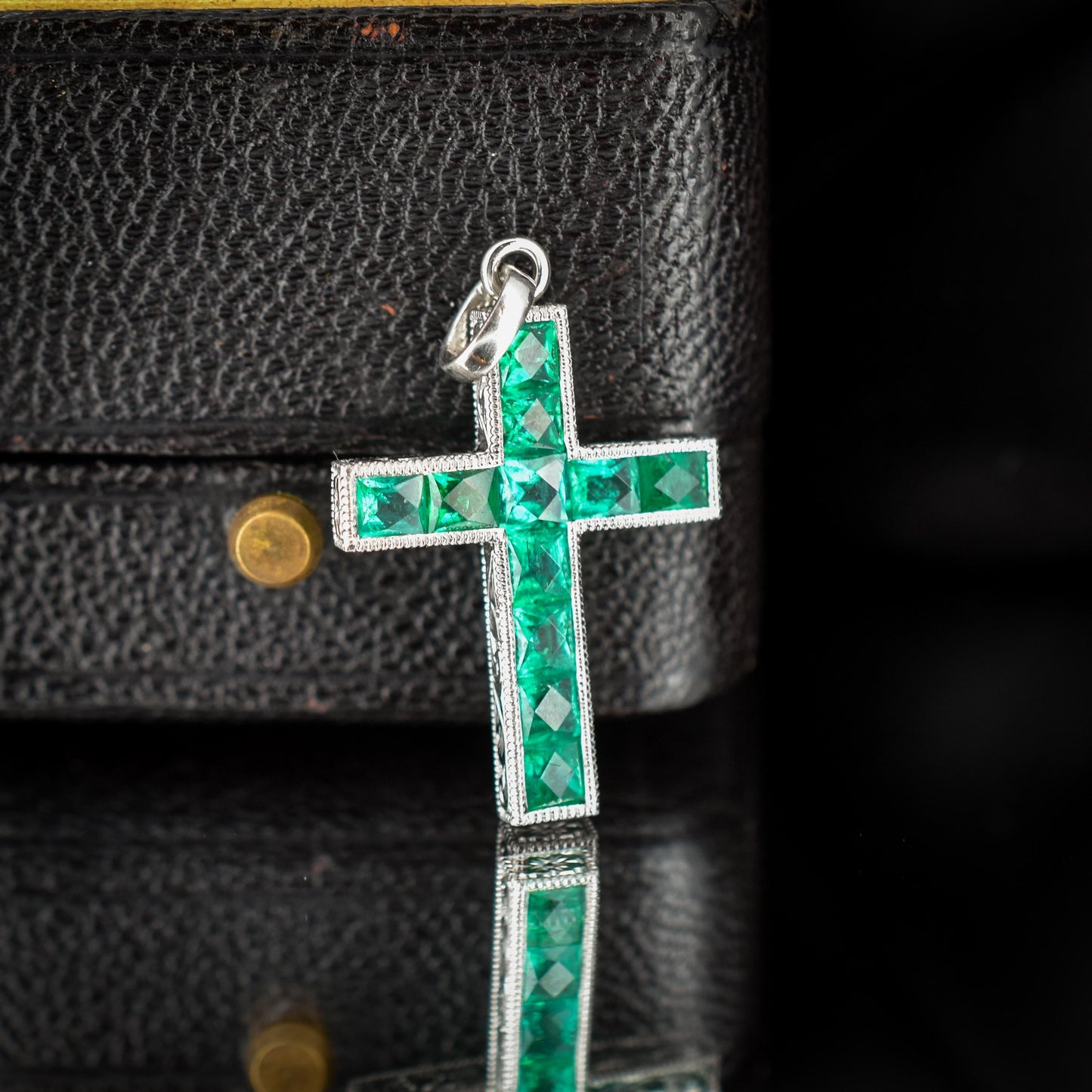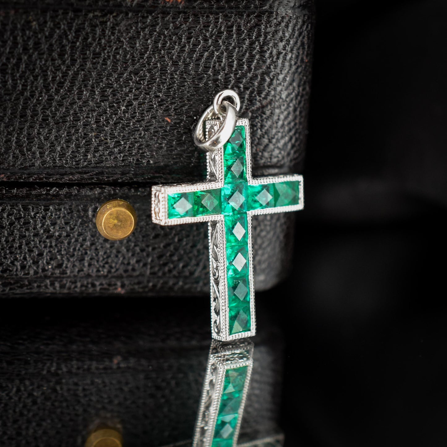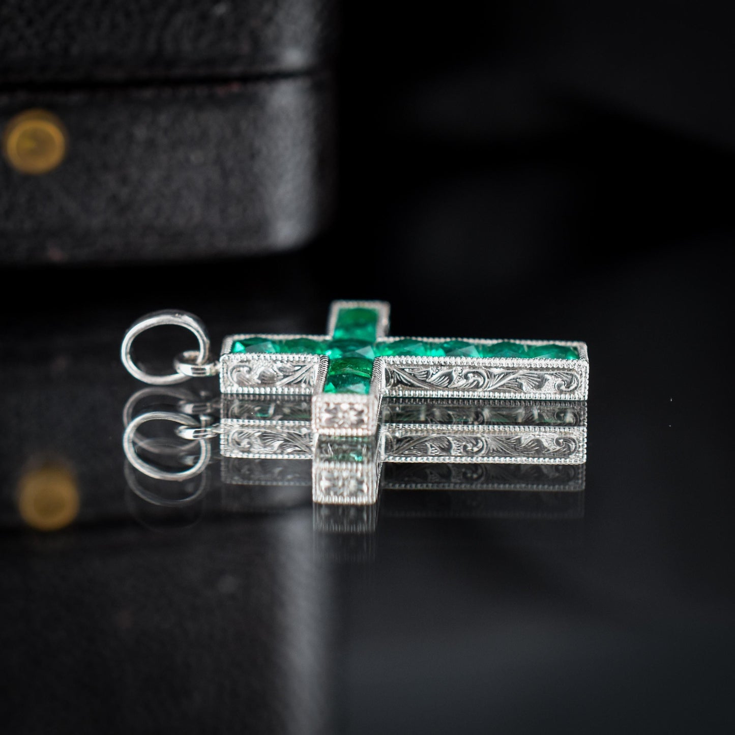 Designed in the Art Deco-inspired era, this stunning Emerald cross charm is in excellent condition. The stones are free from damage and secure within their settings.