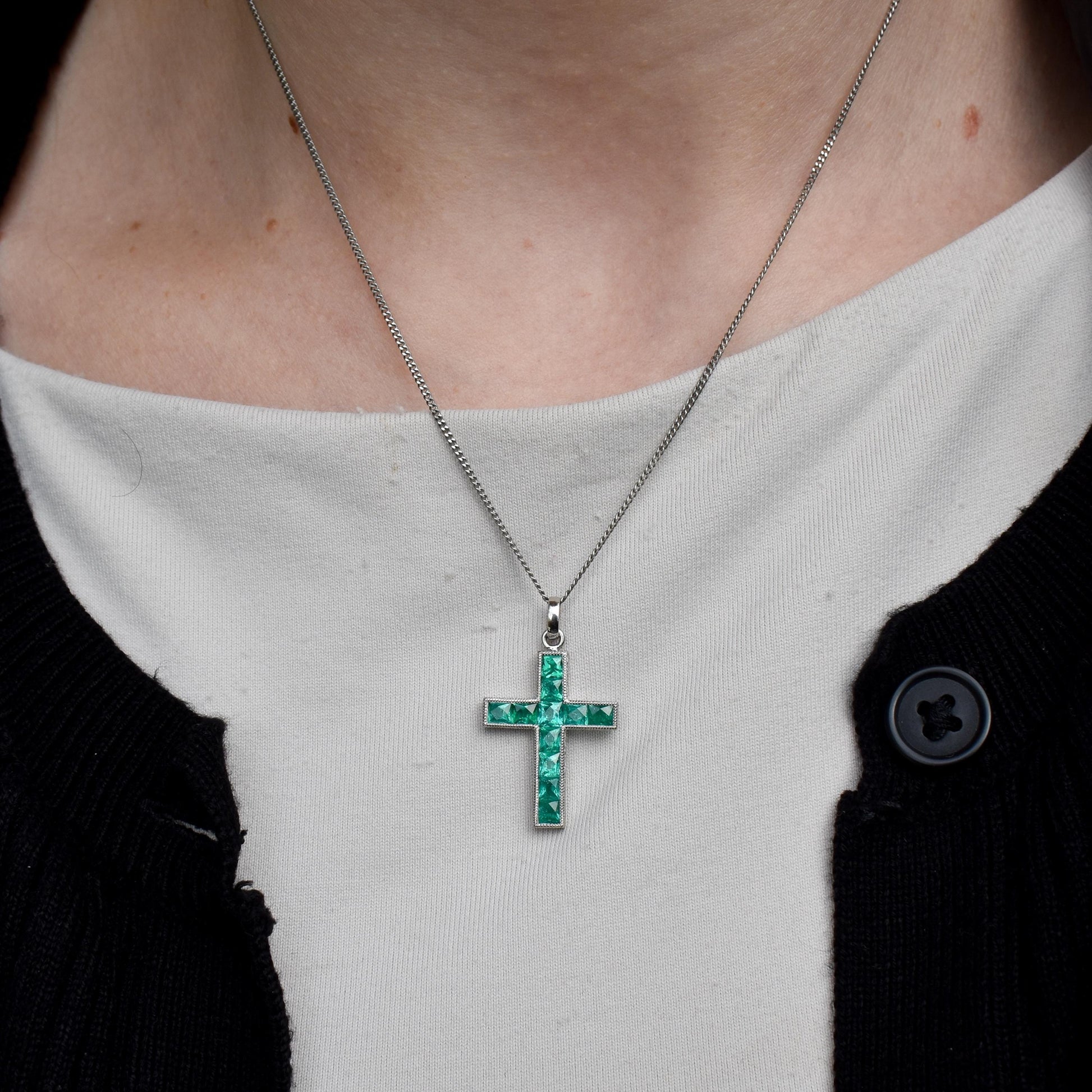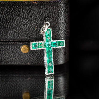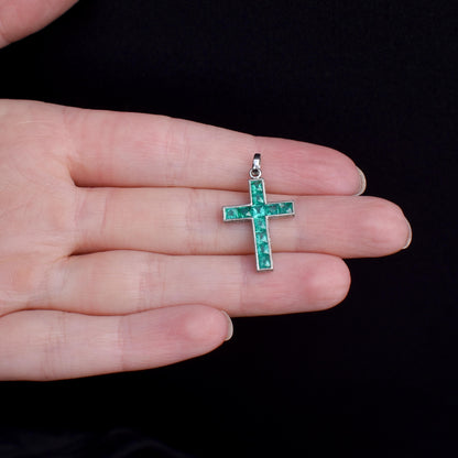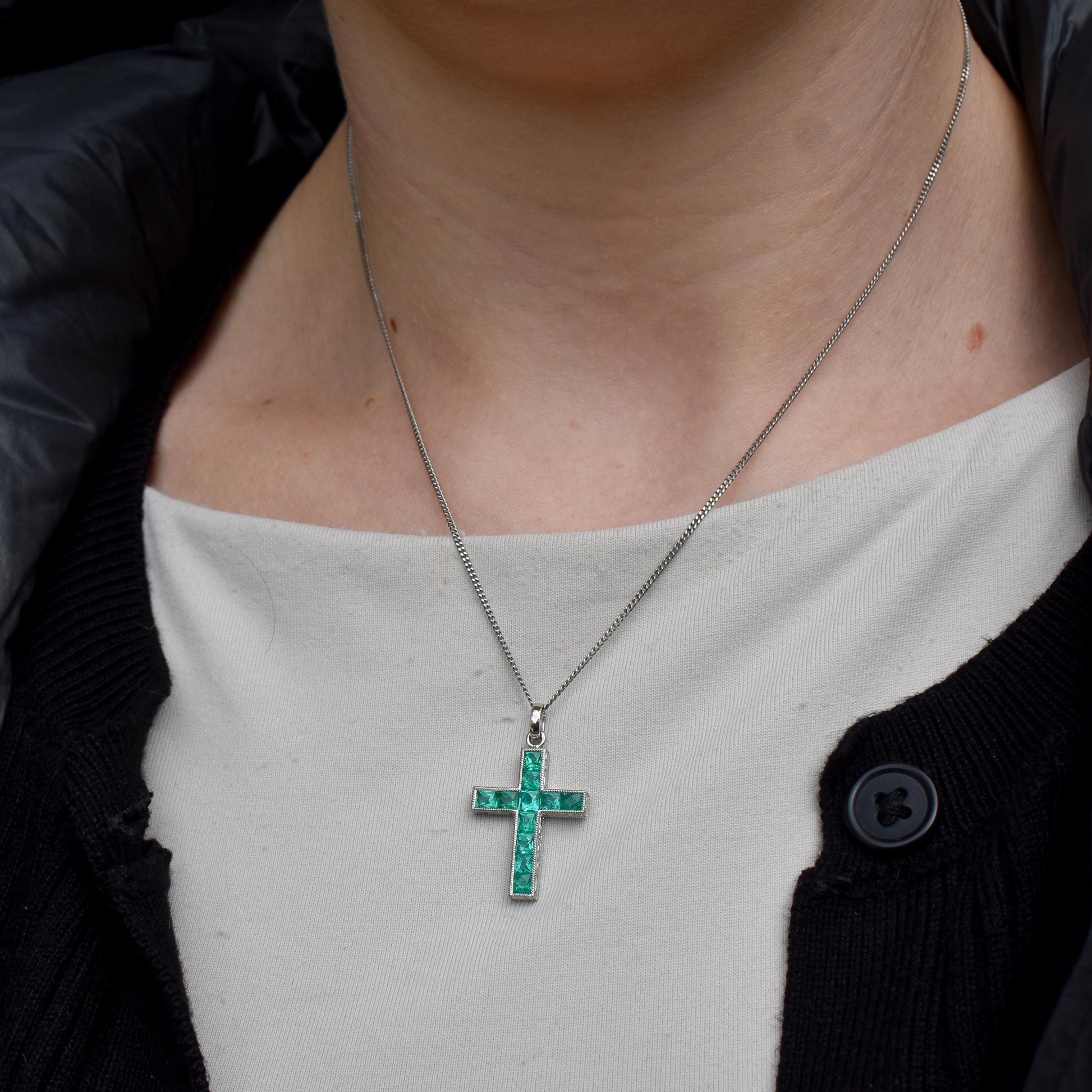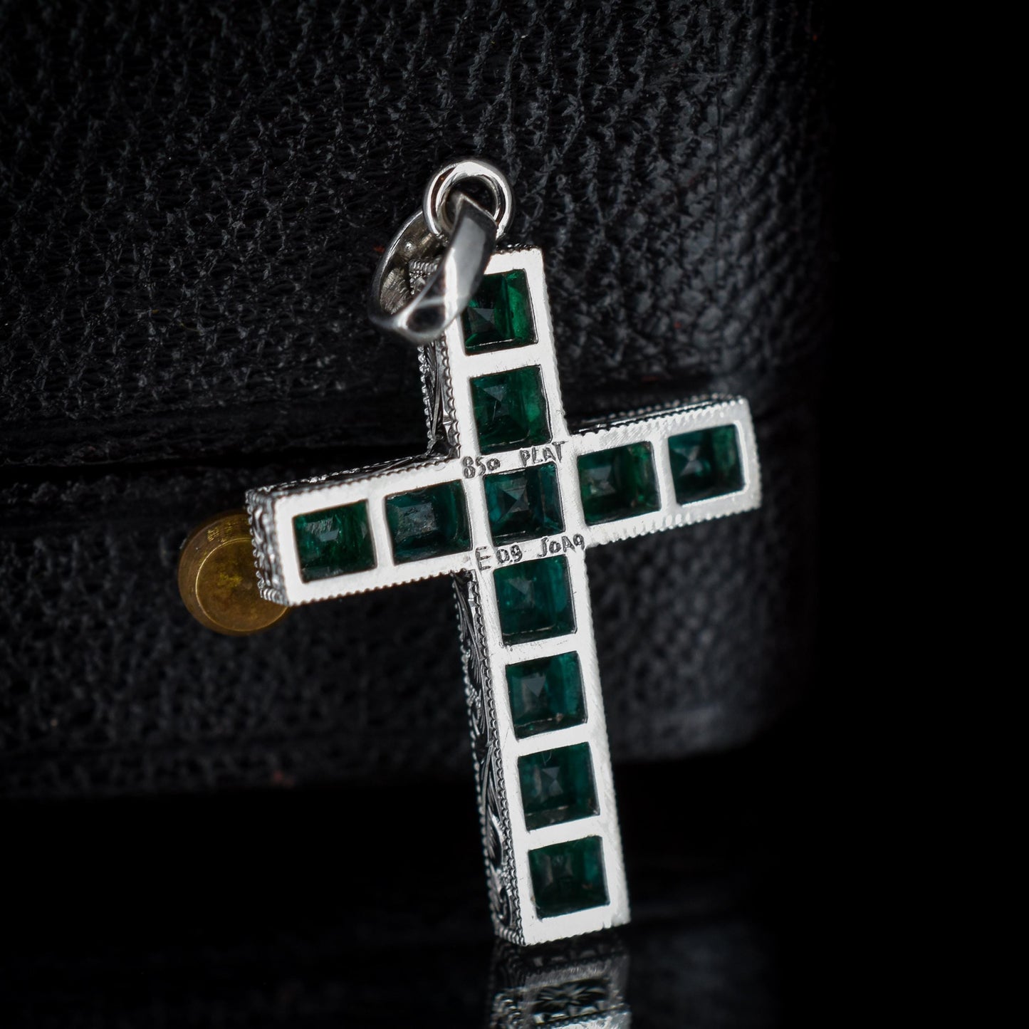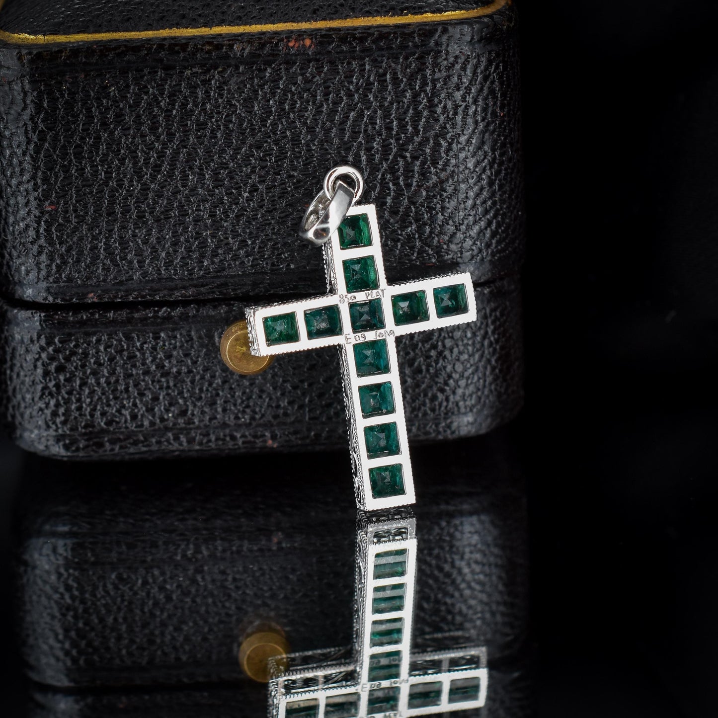 This exquisite Emerald platinum charm has been meticulously handcrafted into a religious cross featuring eleven French-cut natural Emeralds weighing an impressive total of 0.90ct.