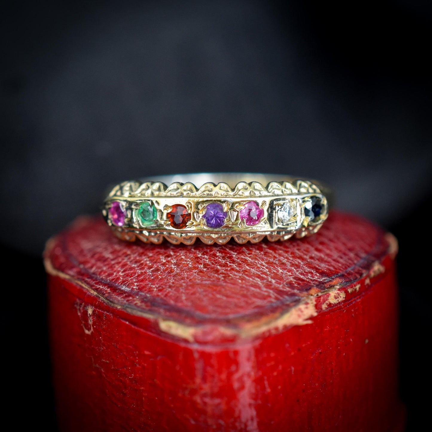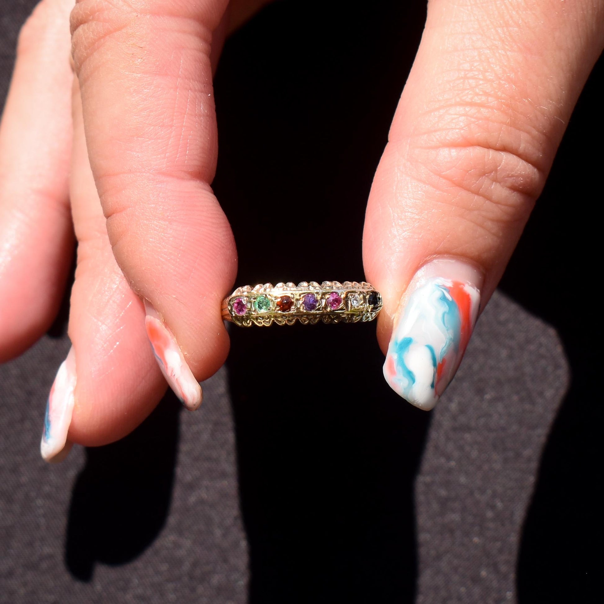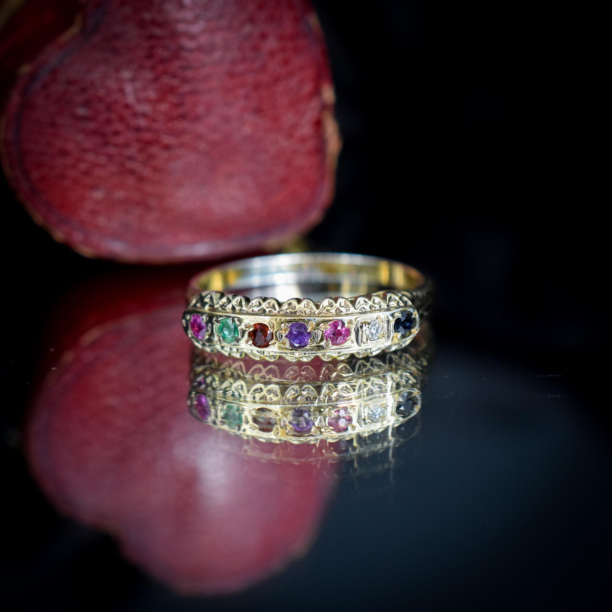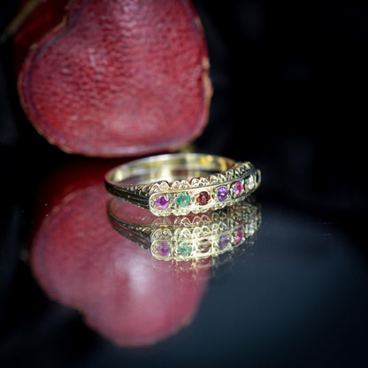 REGARDS Acrostic Multi-Gemstone Gold on Silver Band Ring – Antique Style