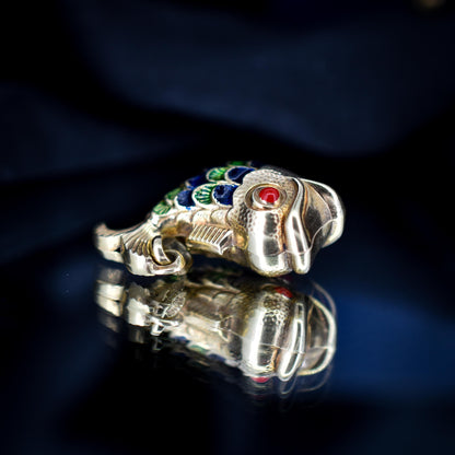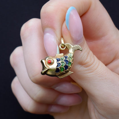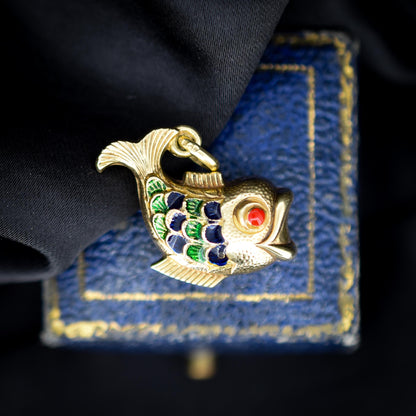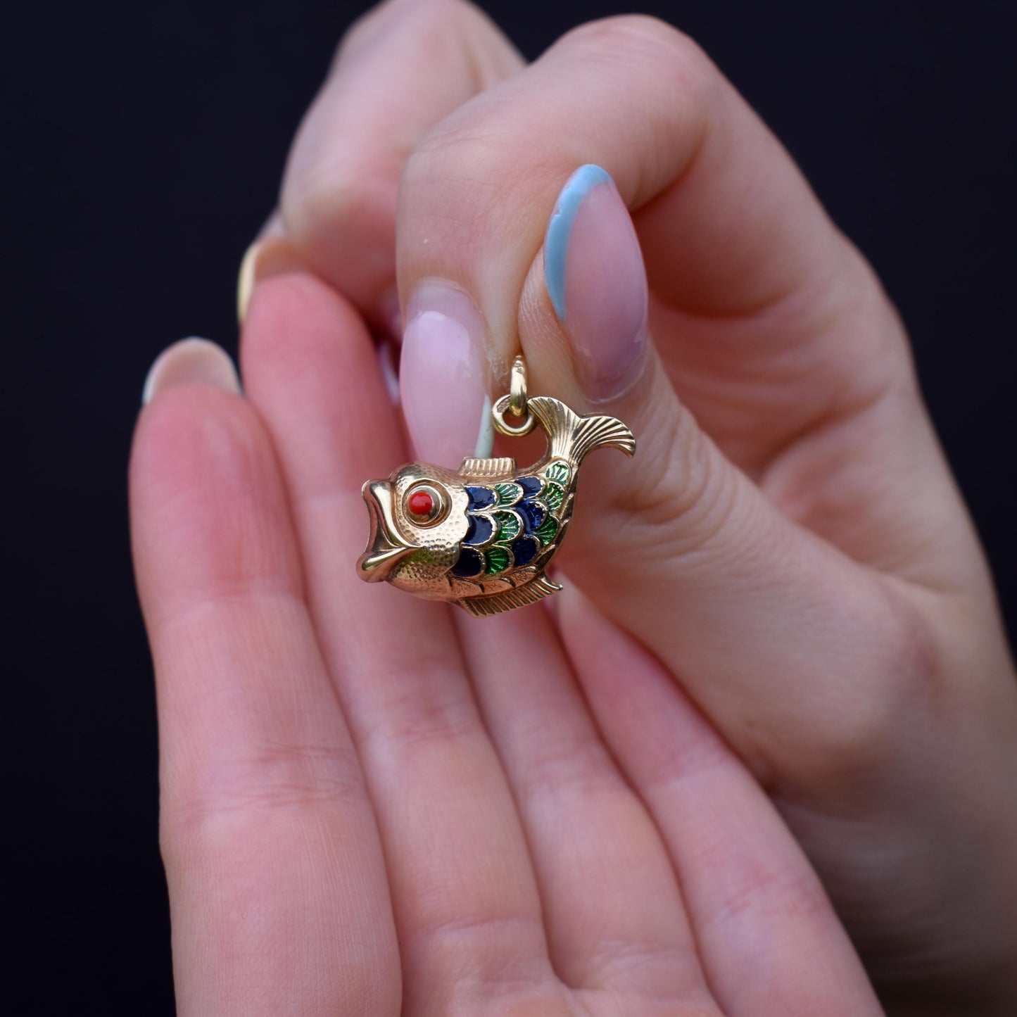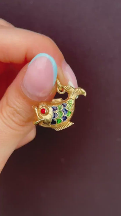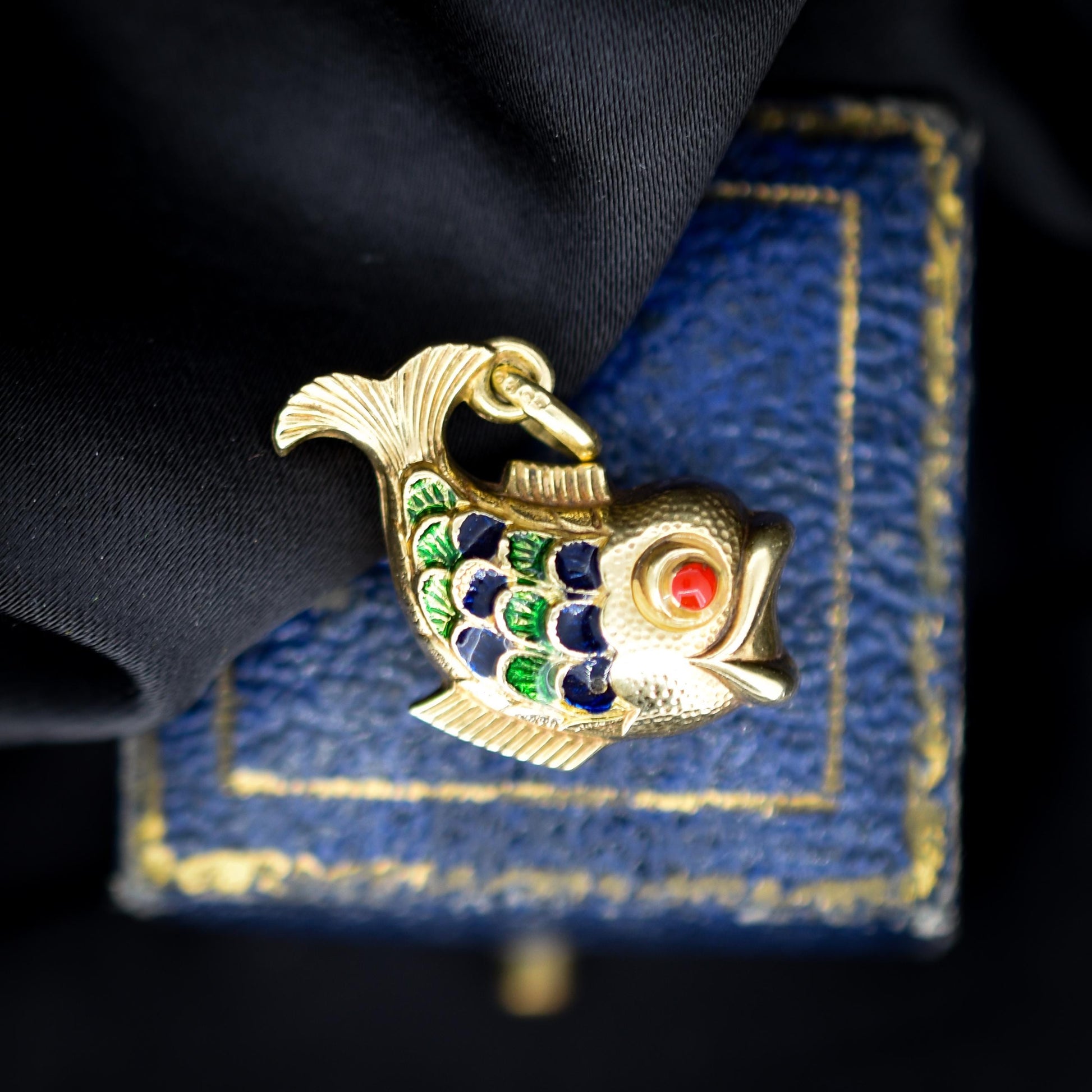 This unique fish pendant is made of 9ct yellow gold. It features detailed blue and green enamel highlighting the fish's scales.