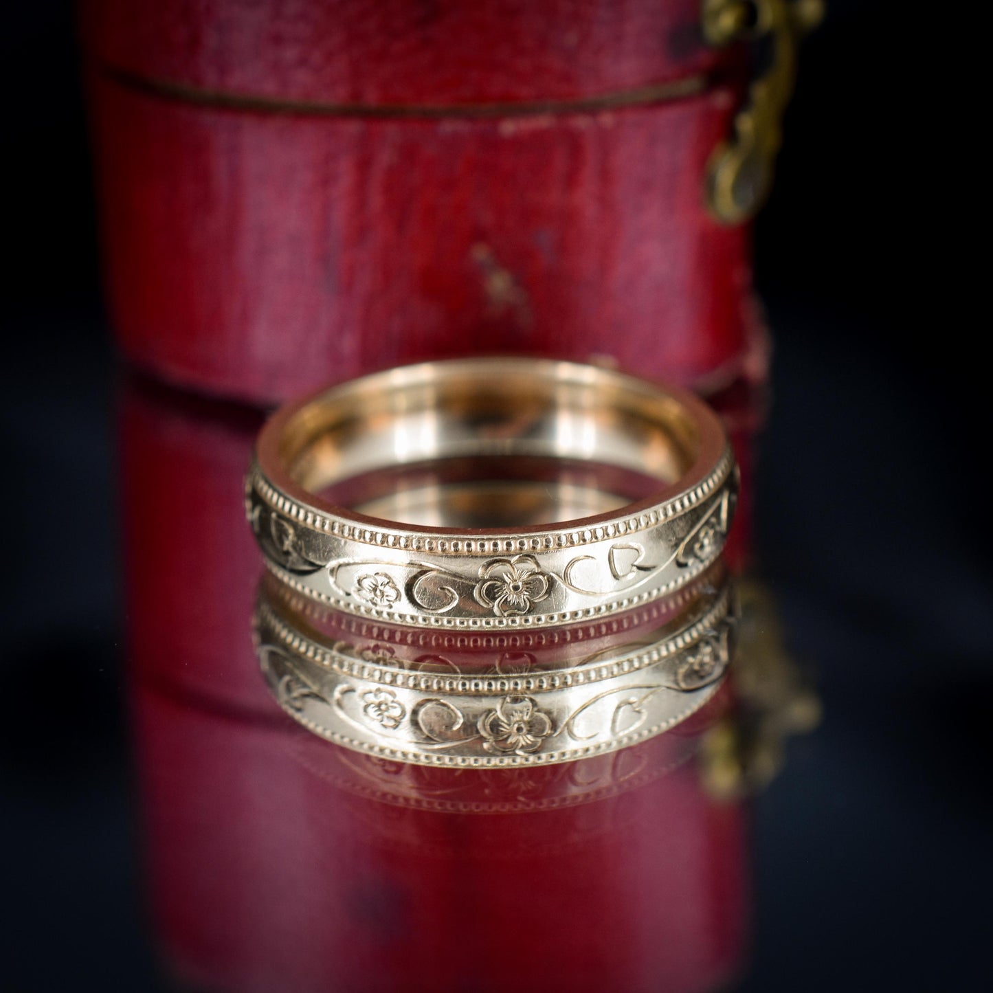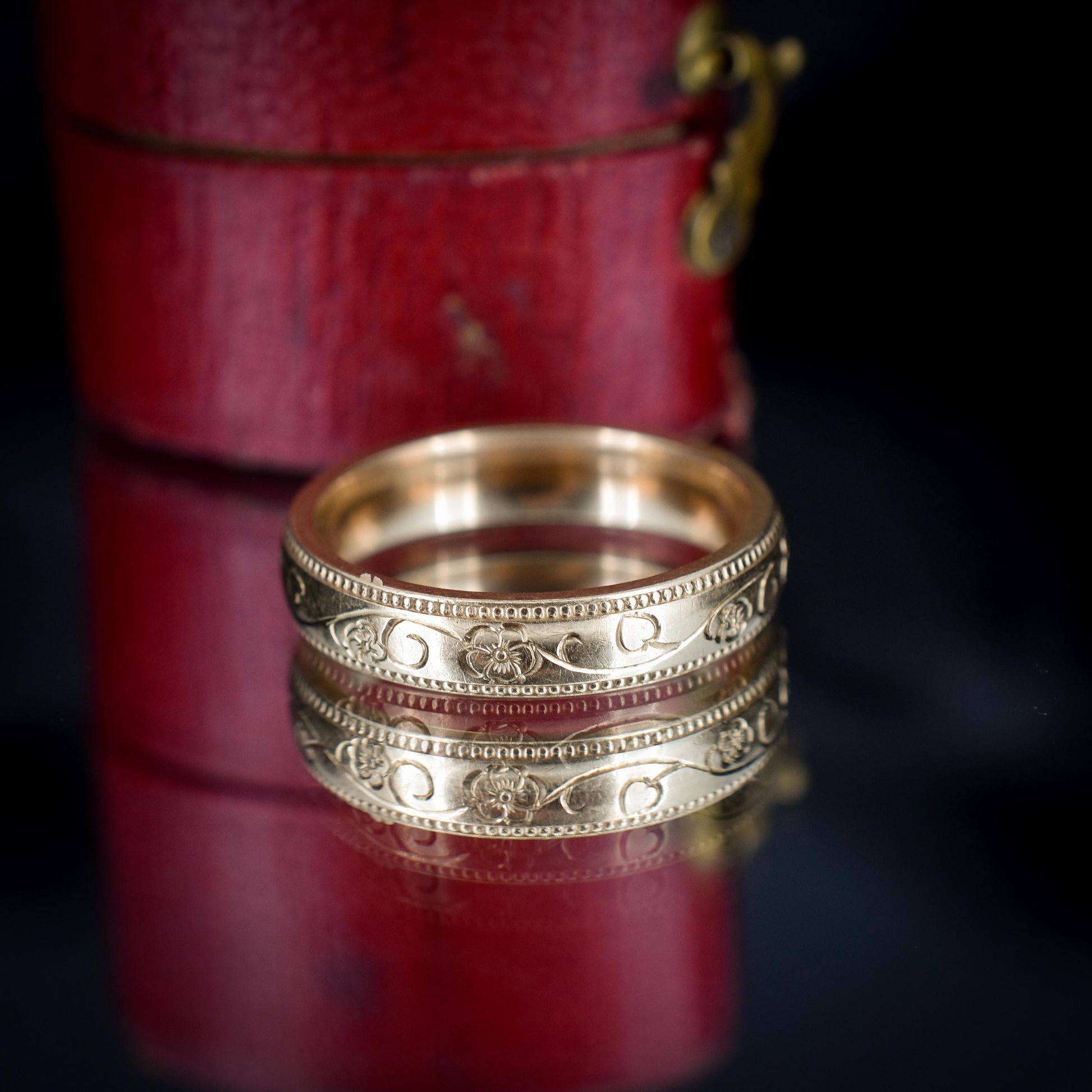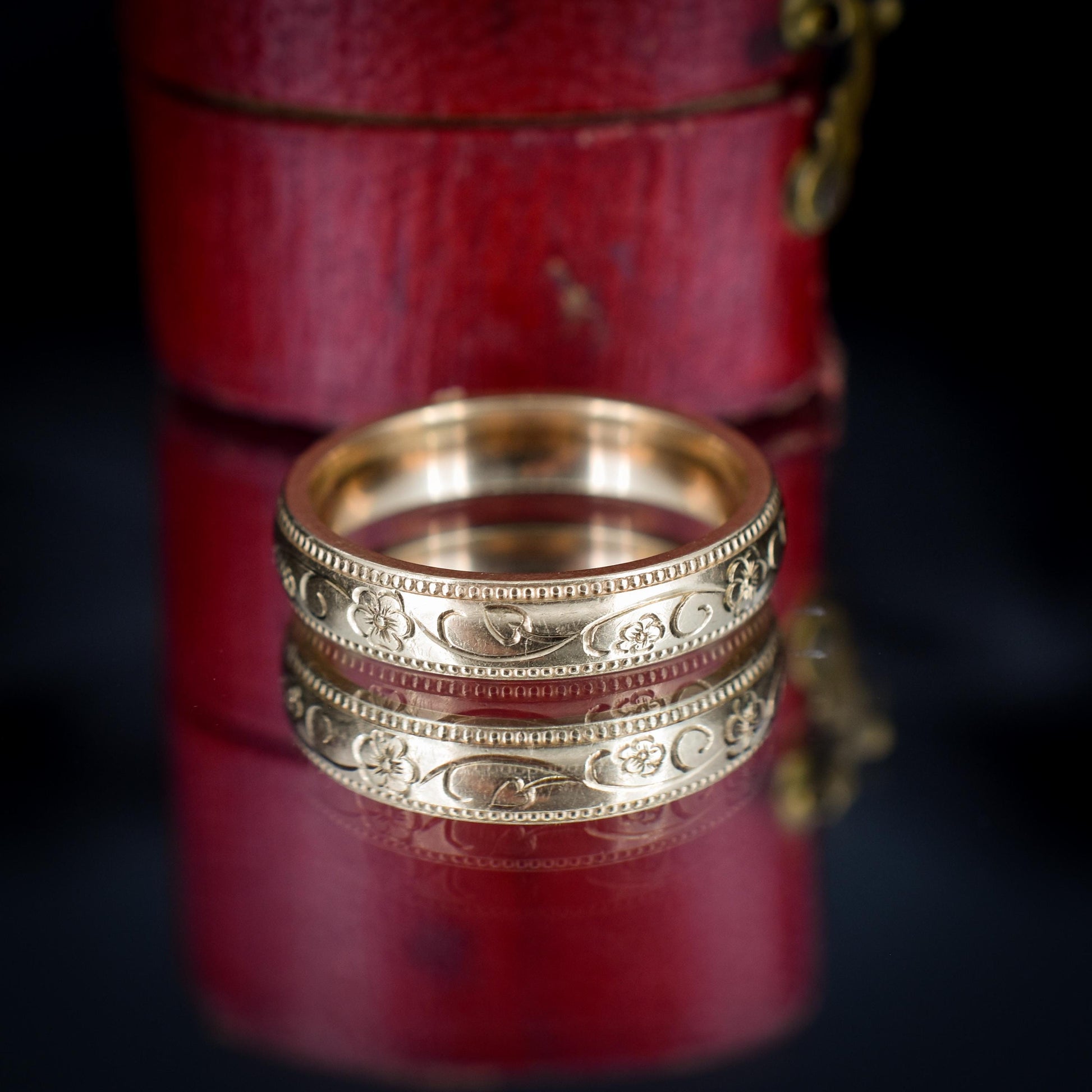 This unique Vintage Gold Band is adorned with an intricate patterned floral engraving around the ring with a domed-shaped profile, making the ring comfortable to wear. The band is modelled in 9ct Yellow Gold and is hallmarked for London.