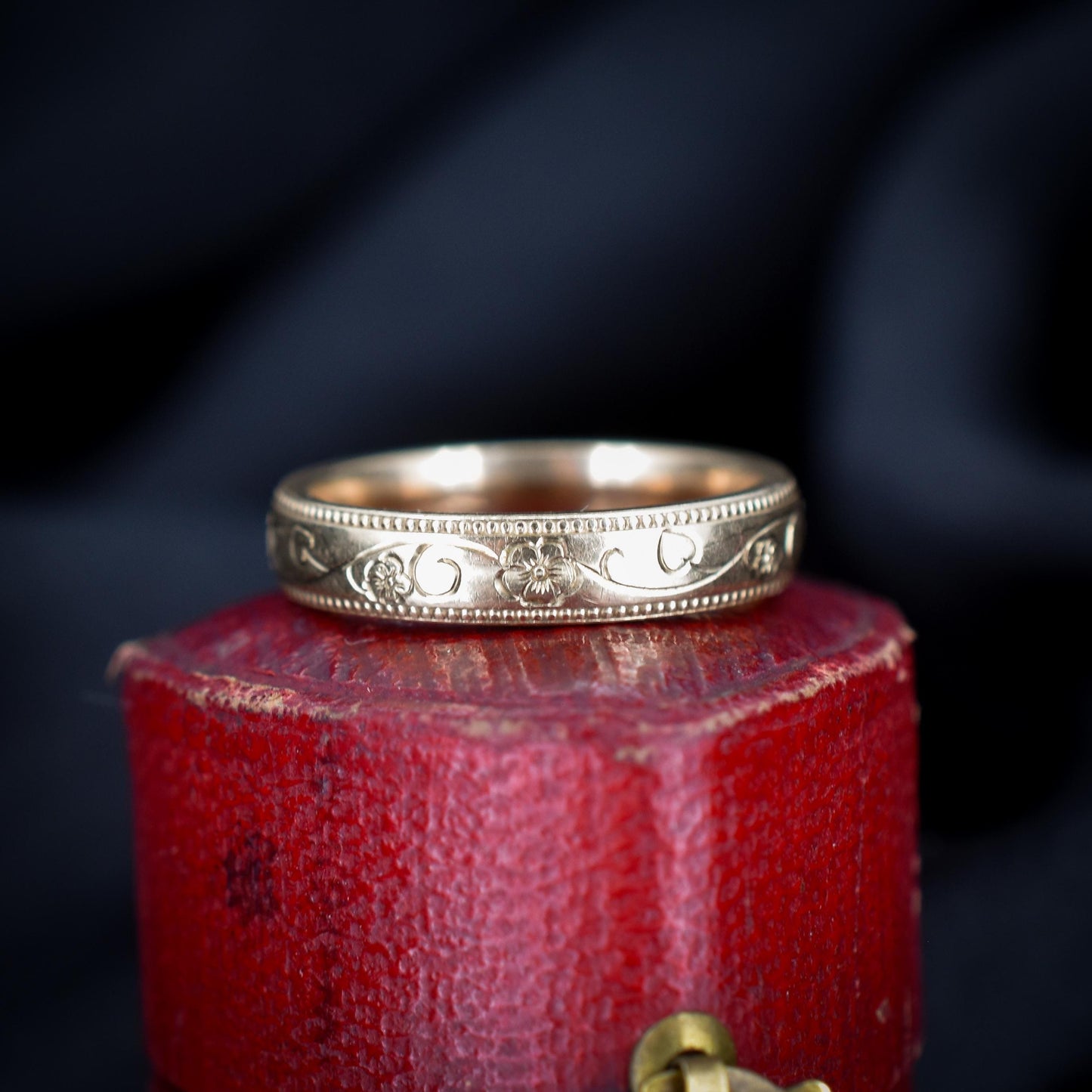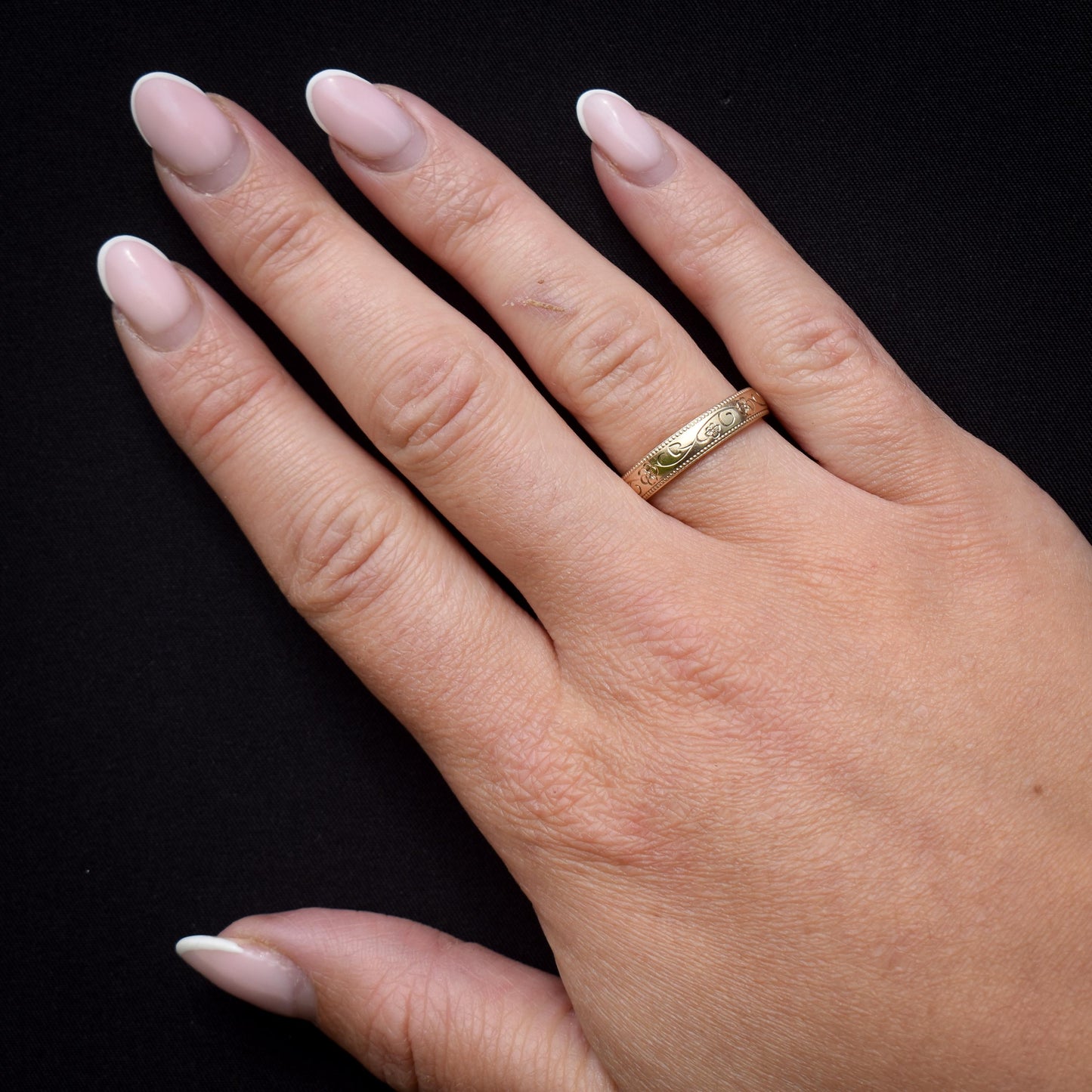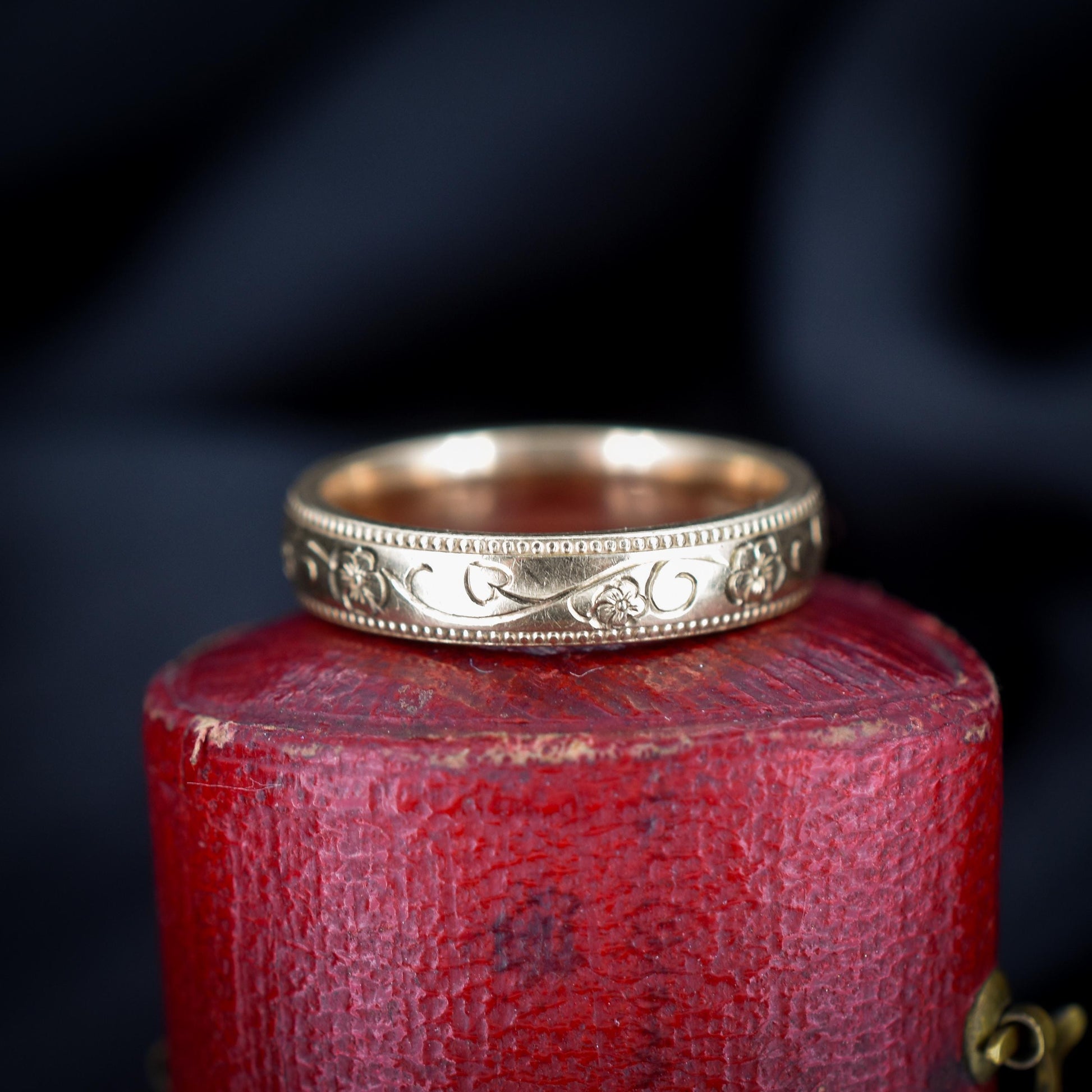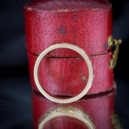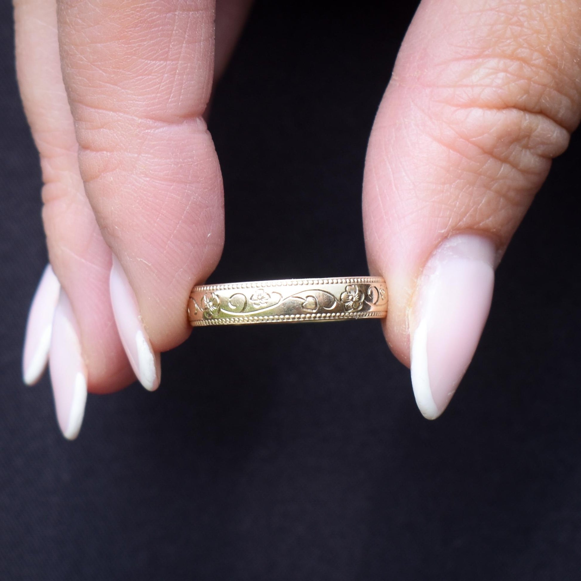 This pretty vintage Gold band remains in excellent condition for its age. The lovely engraving pattern seems untouched, and the ring has crisp hallmarks inside the band. This simple but effective Gold band will make a perfect gift or a brilliant addition to anyone's collection!